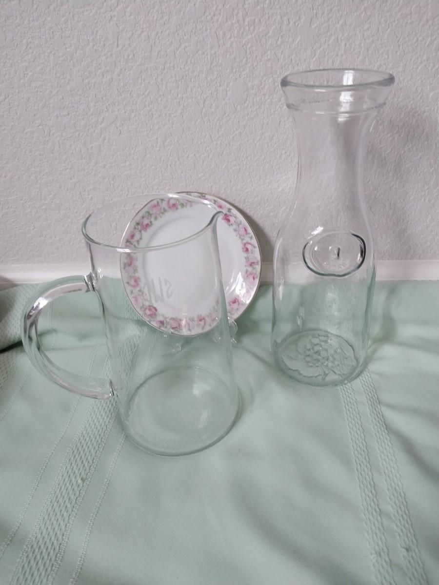 GLASS WATER PITCURECLASS CARET-JAR W/LID AND DOWLIES