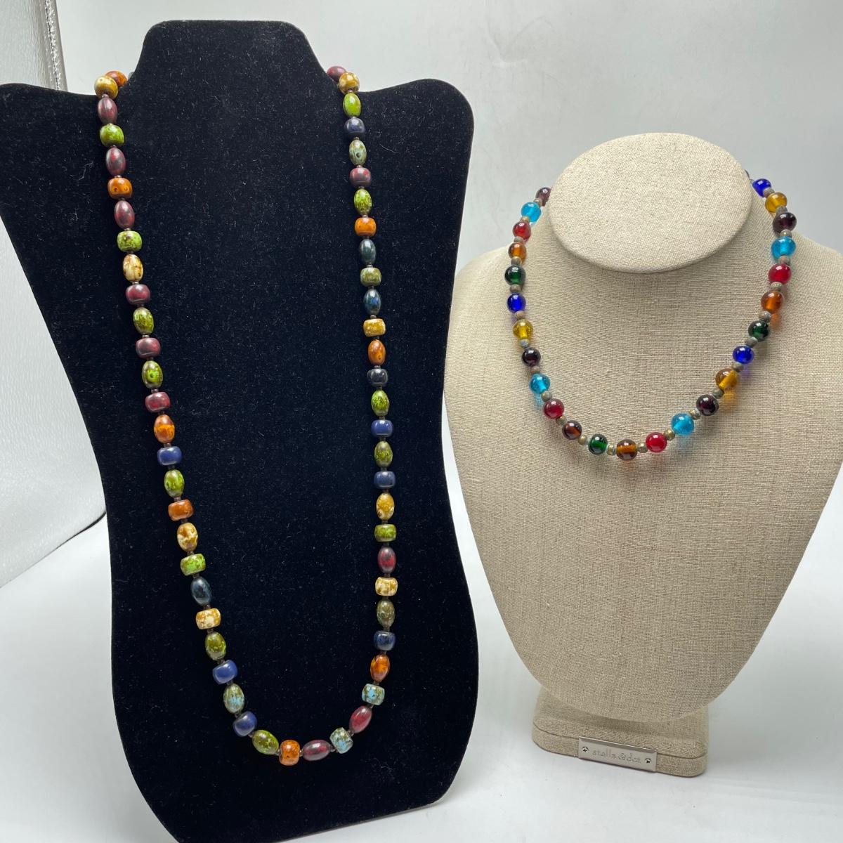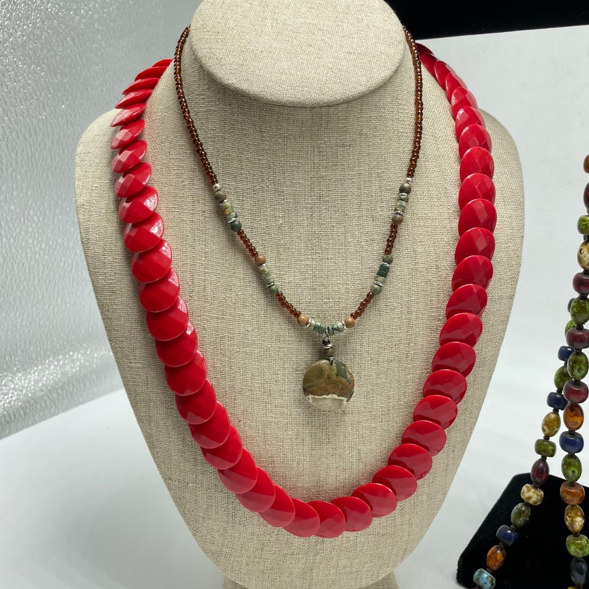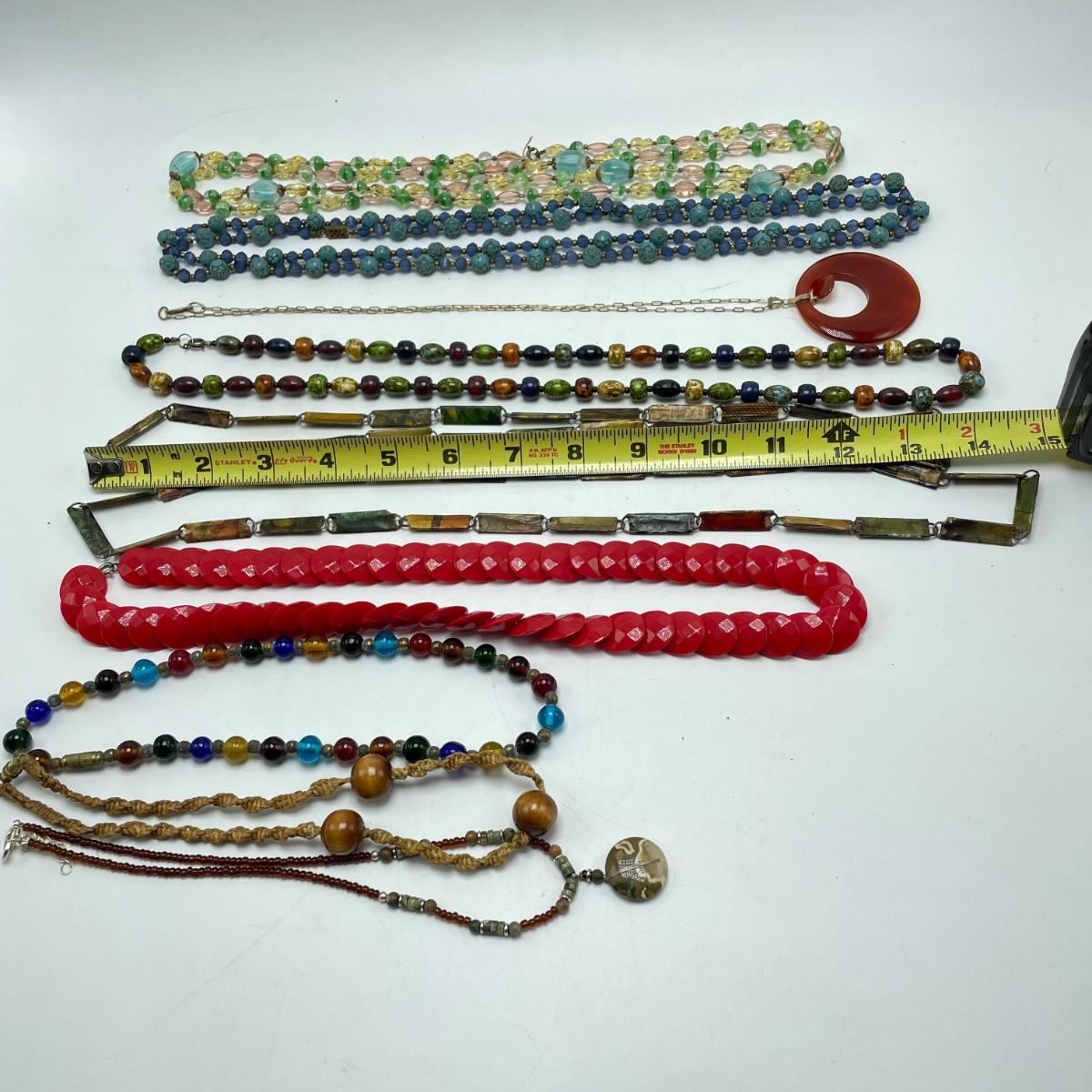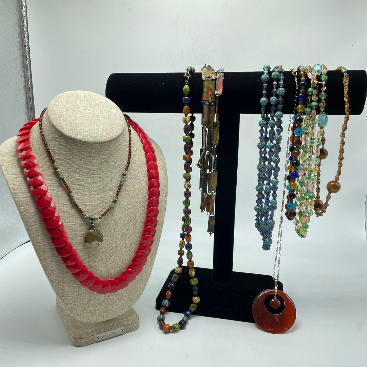 Ten necklaces with a variety of style and materials. Two appear to be crafted from paper clips and wrapped with colored decoupage-like paper. One necklace with the burnt orange pendant is marked Hobé. The other necklace with a pendant is made of stone. Two beaded necklaces have glass beads, one necklace has three wooden beads, and the final three necklaces - the matte multi color, the red beaded, and the blue rose necklaces appear to be made of resin. See images. Shipping available.
