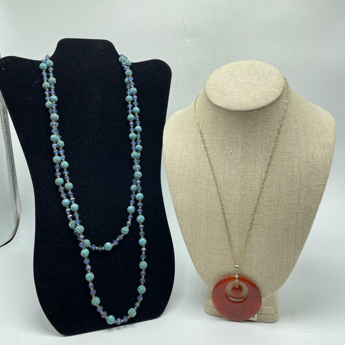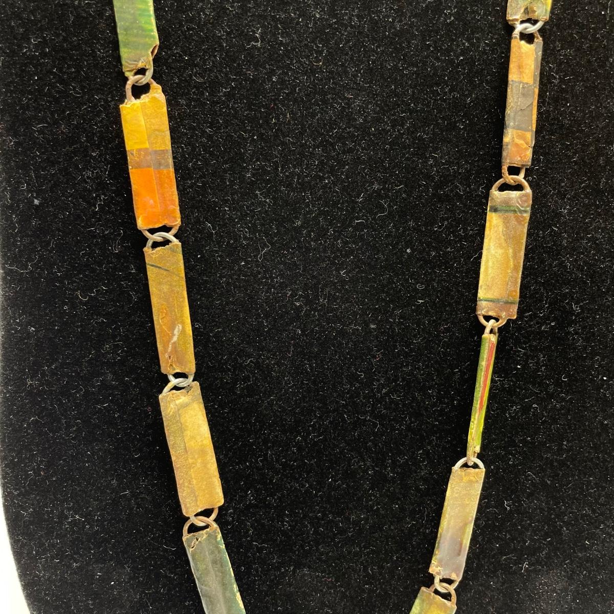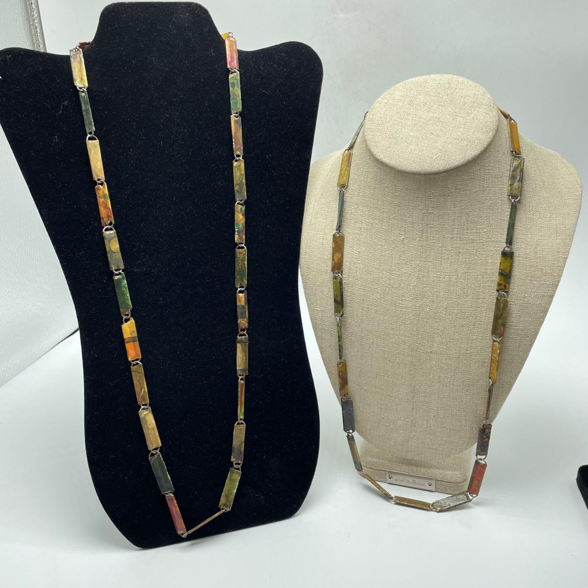 Ten necklaces with a variety of style and materials. Two appear to be crafted from paper clips and wrapped with colored decoupage-like paper. One necklace with the burnt orange pendant is marked Hobé. The other necklace with a pendant is made of stone. Two beaded necklaces have glass beads, one necklace has three wooden beads, and the final three necklaces - the matte multi color, the red beaded, and the blue rose necklaces appear to be made of resin. See images. Shipping available.