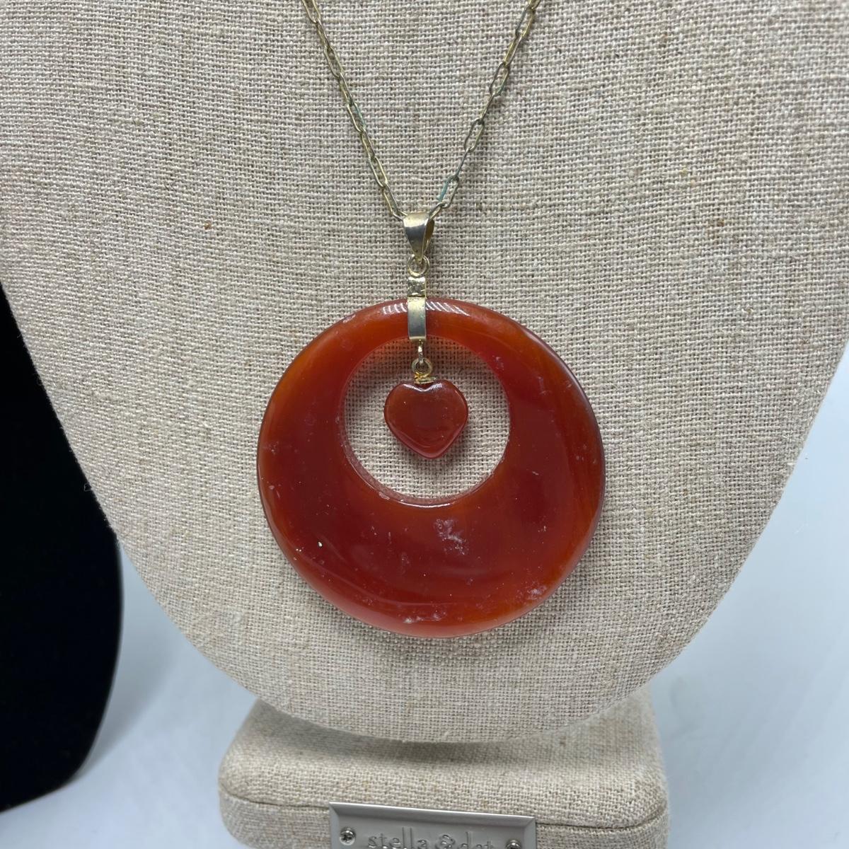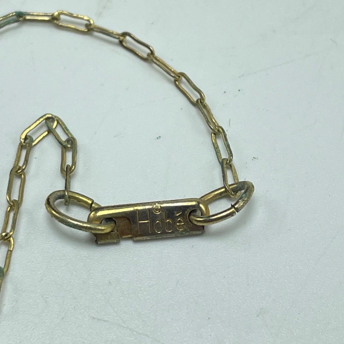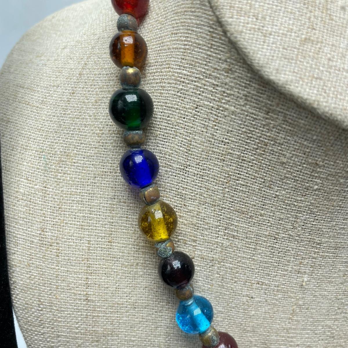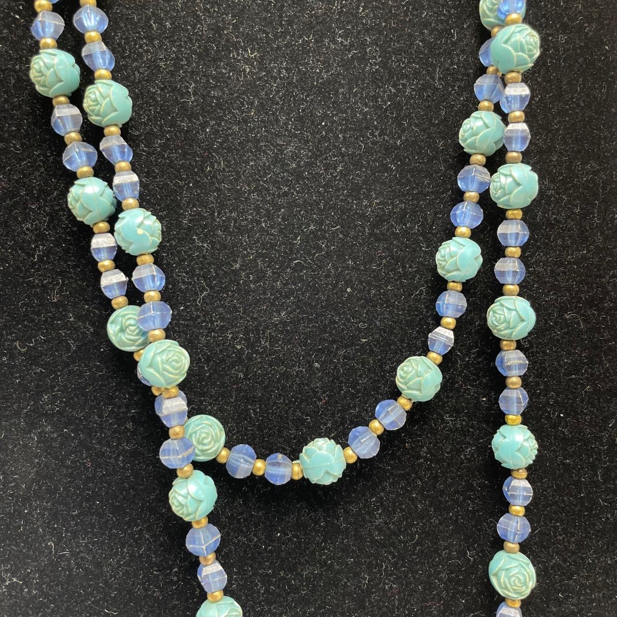 Ten necklaces with a variety of style and materials. Two appear to be crafted from paper clips and wrapped with colored decoupage-like paper. One necklace with the burnt orange pendant is marked Hobé. The other necklace with a pendant is made of stone. Two beaded necklaces have glass beads, one necklace has three wooden beads, and the final three necklaces - the matte multi color, the red beaded, and the blue rose necklaces appear to be made of resin. See images. Shipping available.