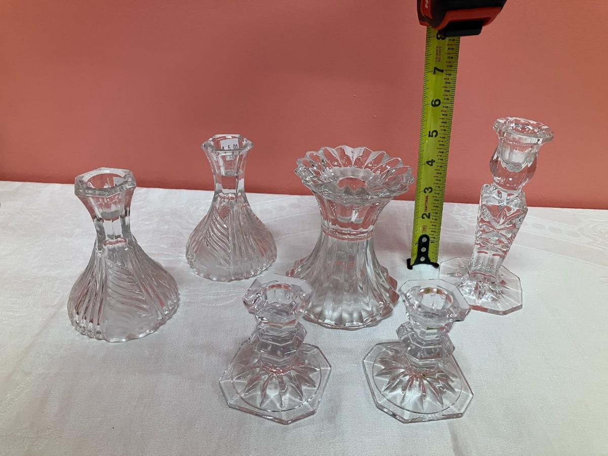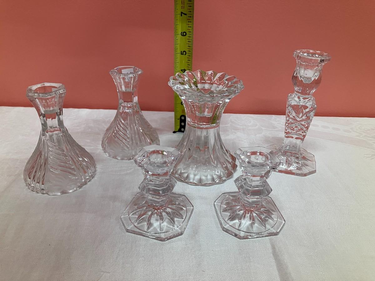 Lot of 5 glass candlesticks and 1 lead crystal candlestick ranging in height from 3-6"