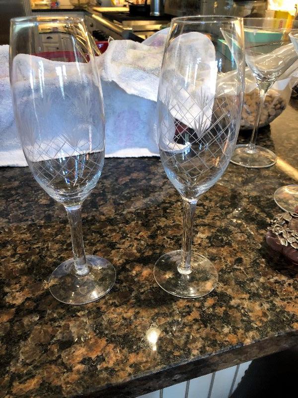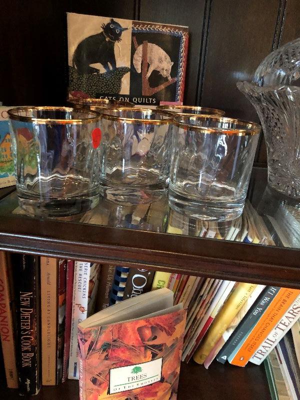 5 highball glasses with gold rims and two champagne flutes