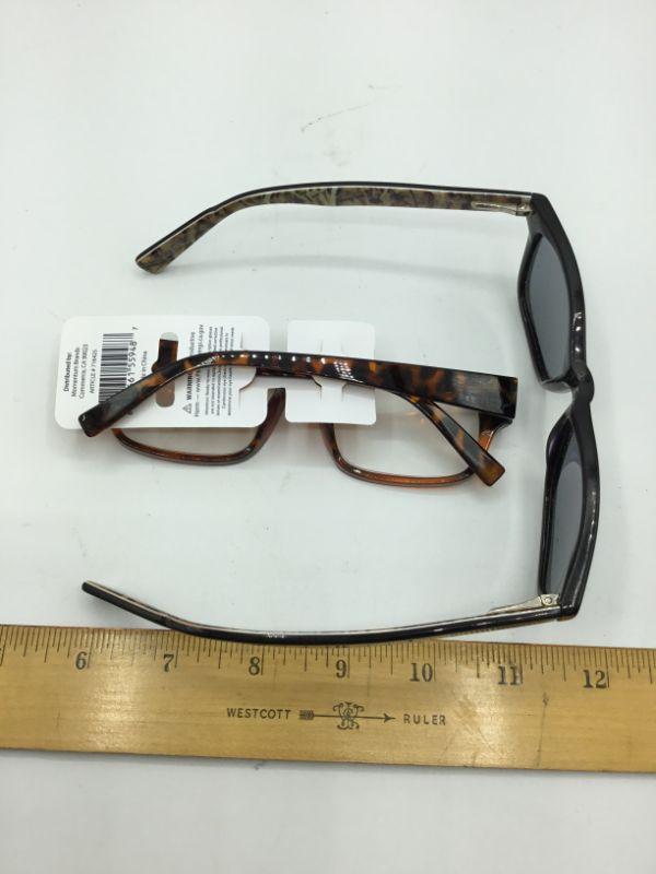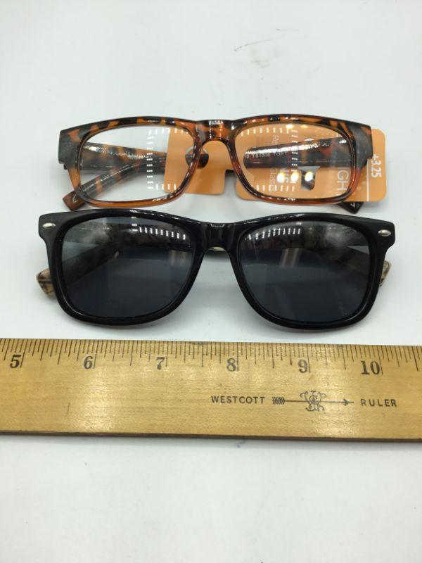 Pair of sunglasses and a pair of reading glasses. Reading glasses still have their tag, they are +3.25 magnification. Good condition.