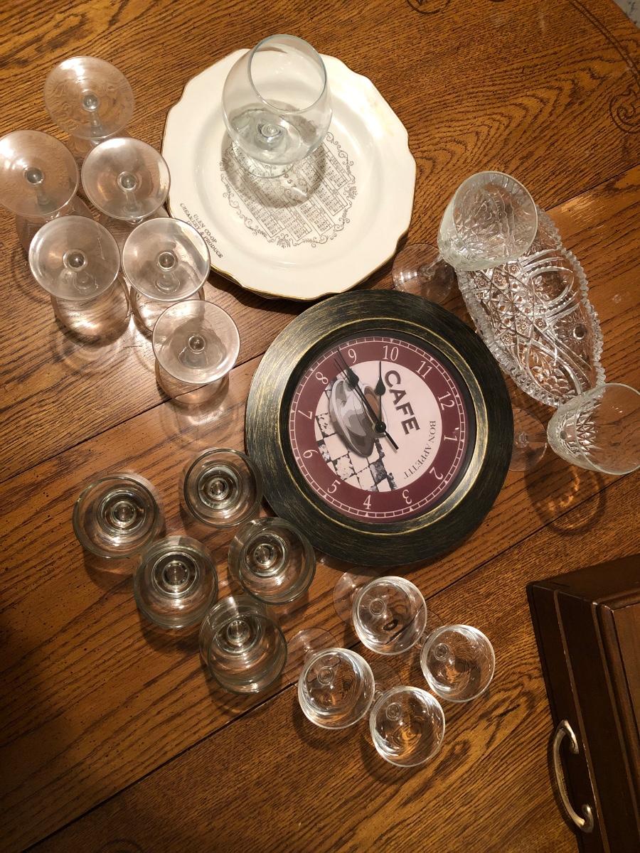 Mismatched glassware, clock, relish tray & 2 plates