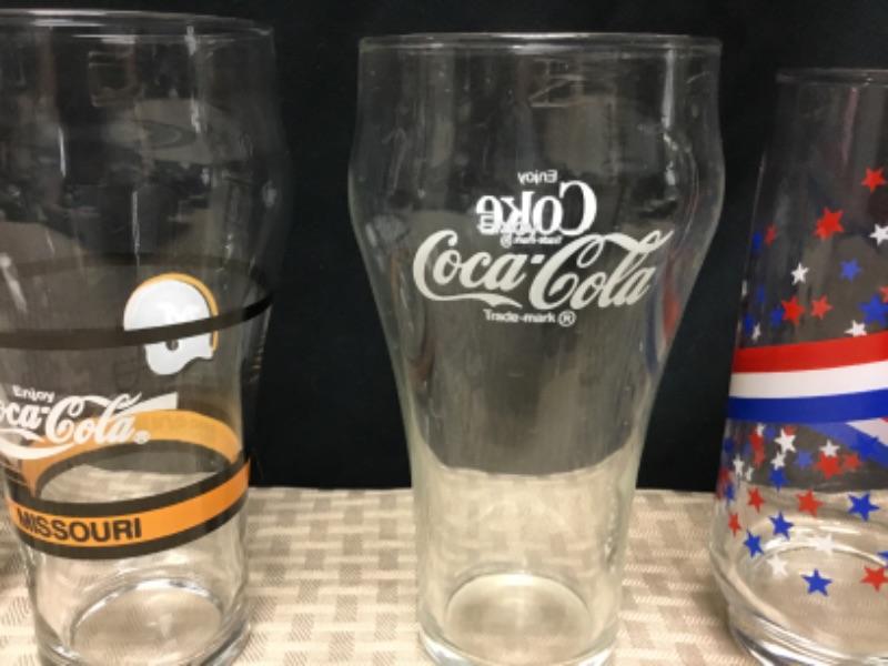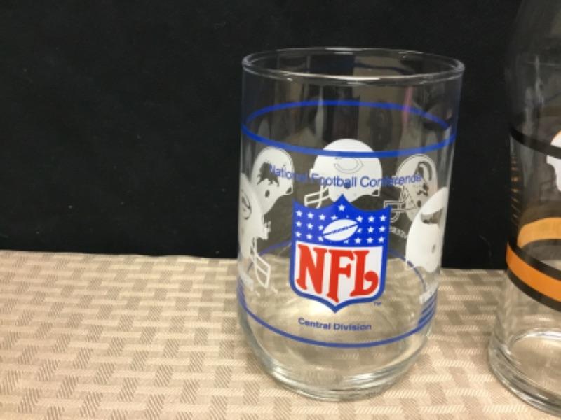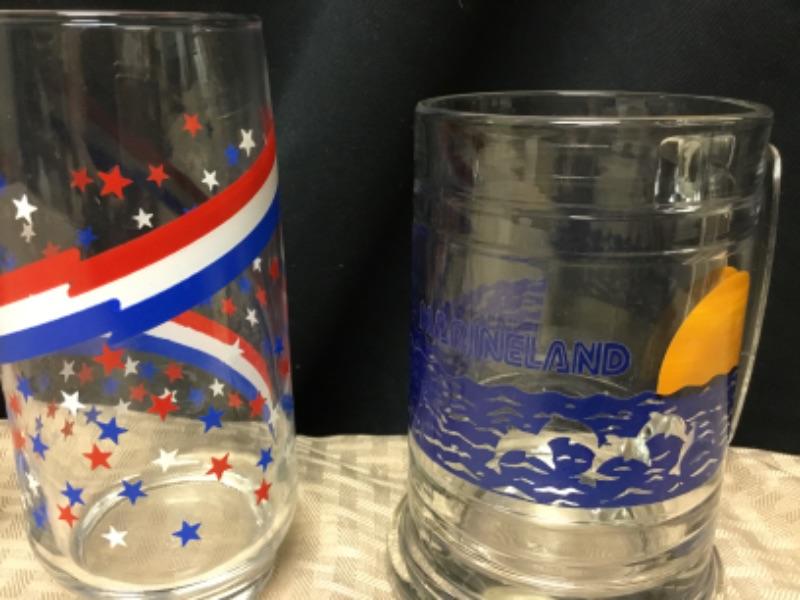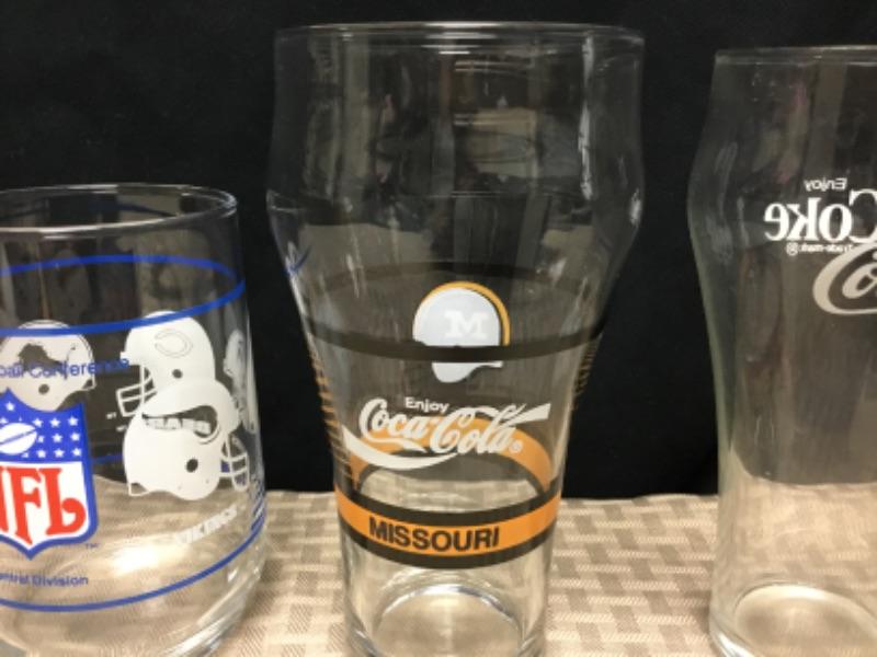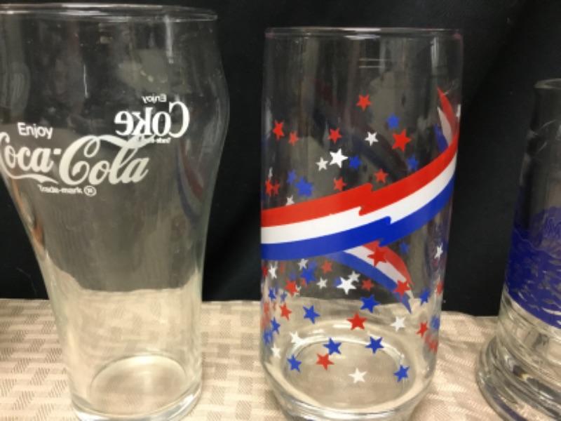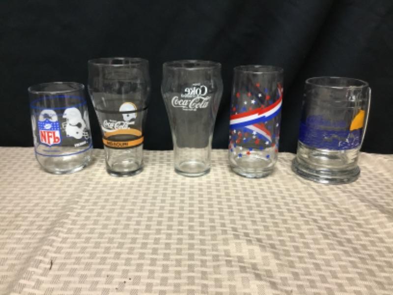Collectible Drink Glasses. Lot of 5. NFL, Coca Cola, Marineland and a red, white, and blue stars. Various sizes.