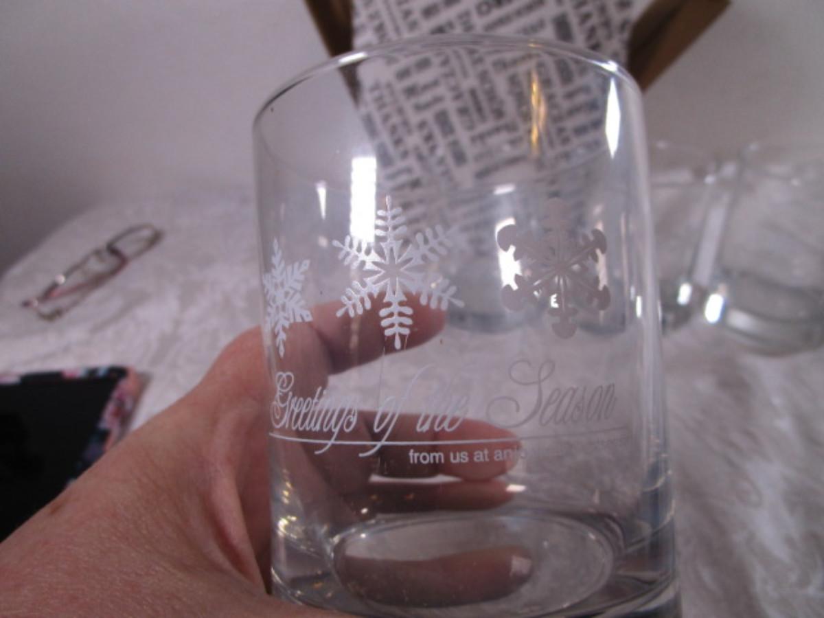 Painted "Greetings of the Season from all of us at Anjo Wear & Artsense", 4" tall x 3" in diameter