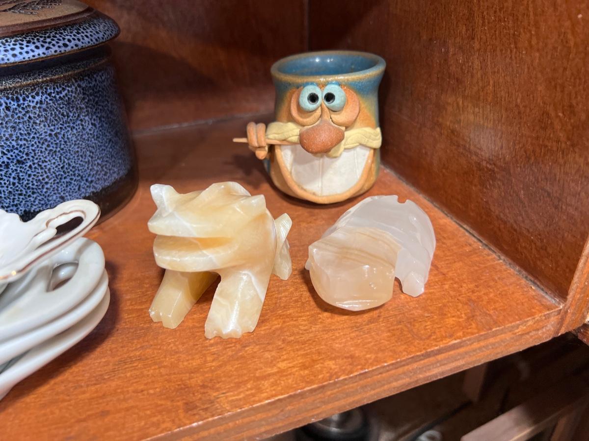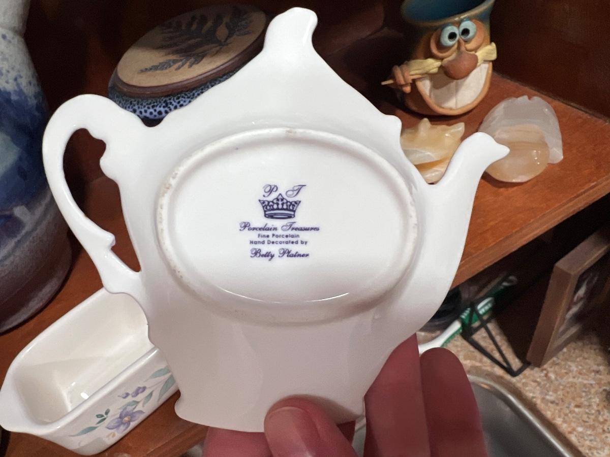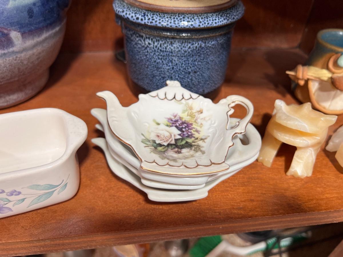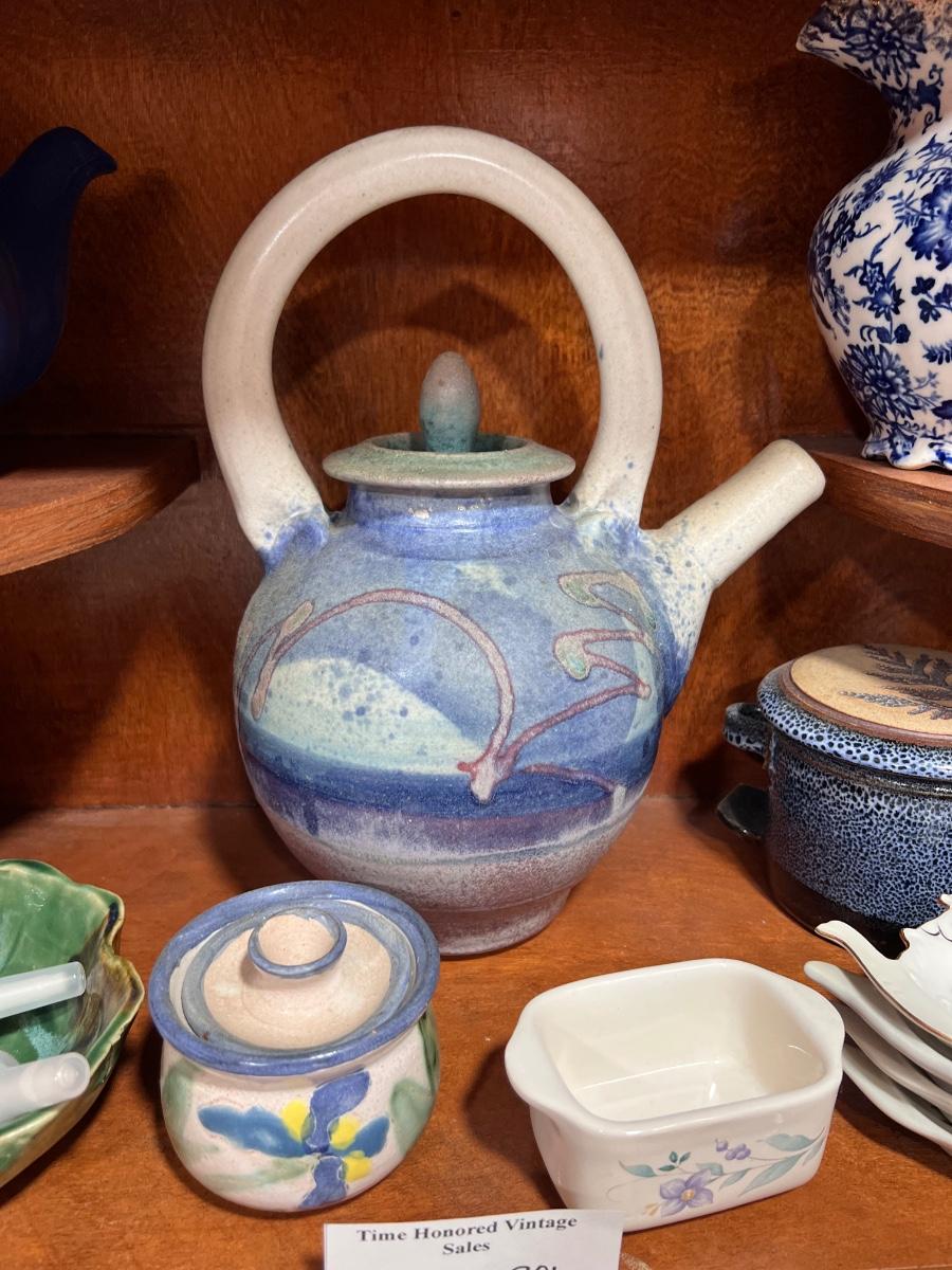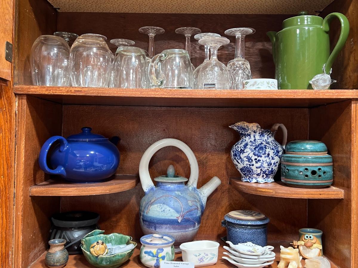 lot of various teapots, wine glasses, trinkets, sauce dishes, soup spoons and more.