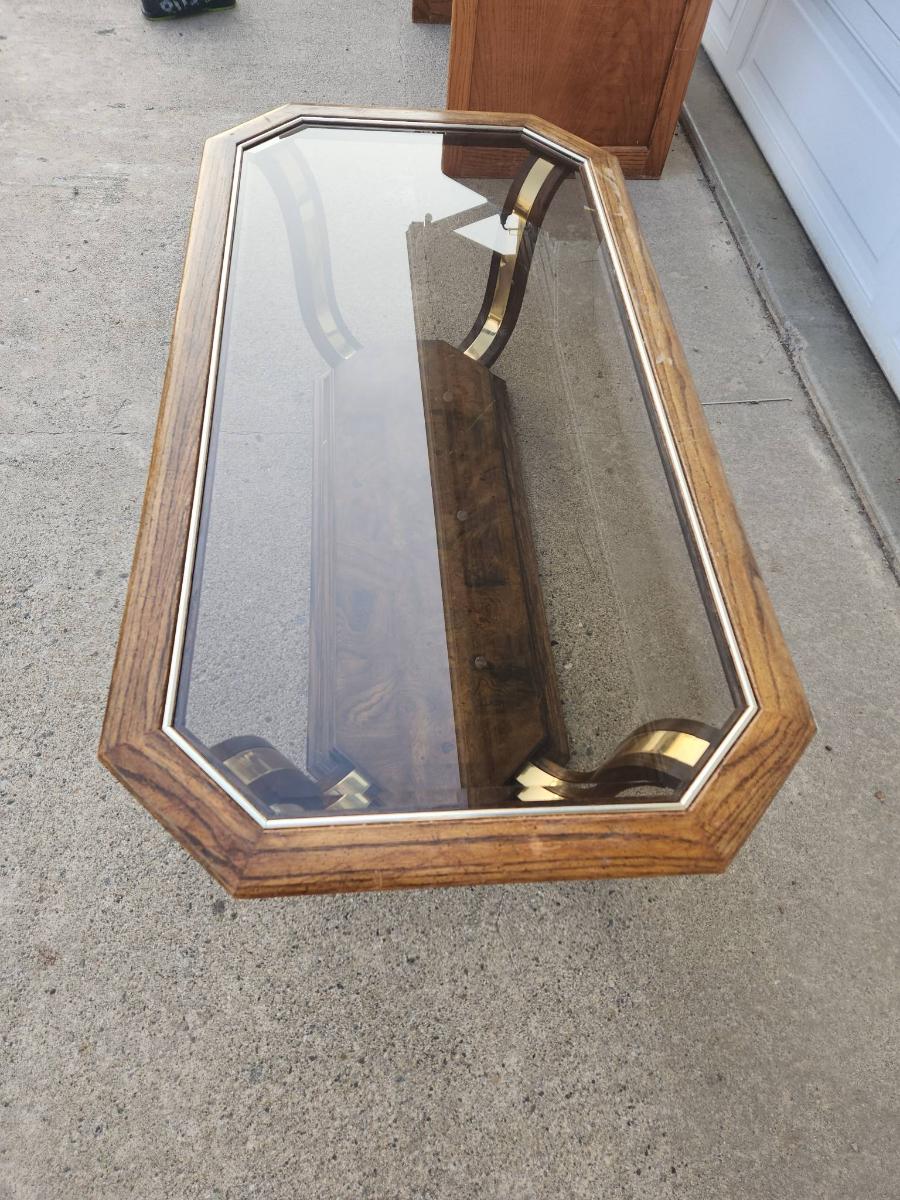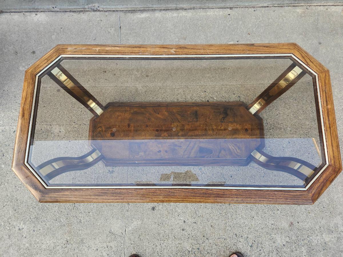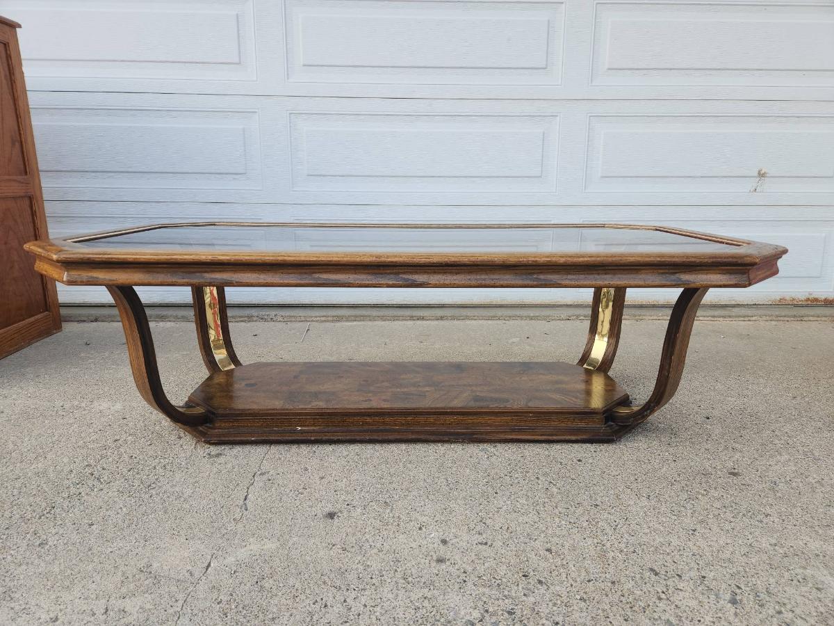 Glass-Top Coffee Table with Brass Accents and Wood Base