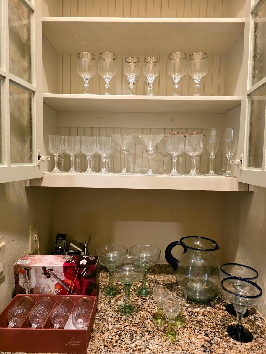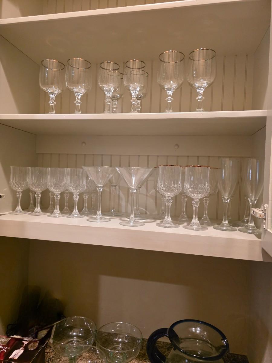 Lot of glassware: 12 wine, 5 gold rim, 4 Martini, 4 large silver rim, 4 small silver rim, 4 champagne, Mexican glass blue rim pitcher with 2 matching margarita glasses, 3 green stem margarita glasses, 4 Lingchamp wine in box, 3 small green stem.