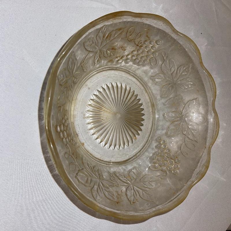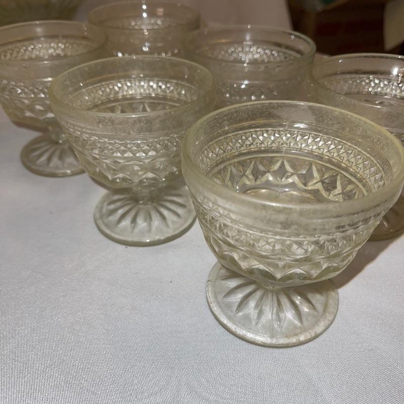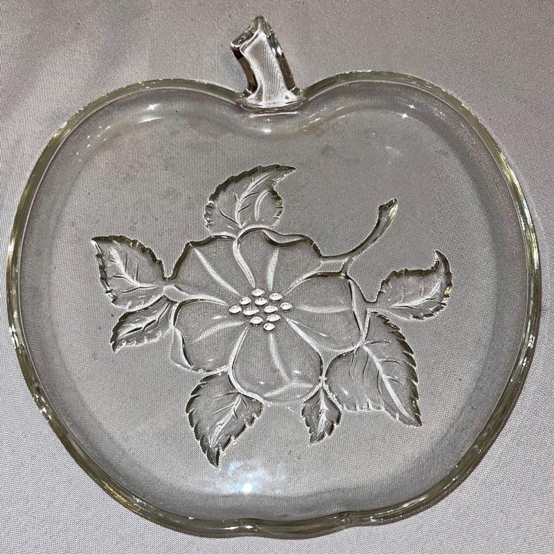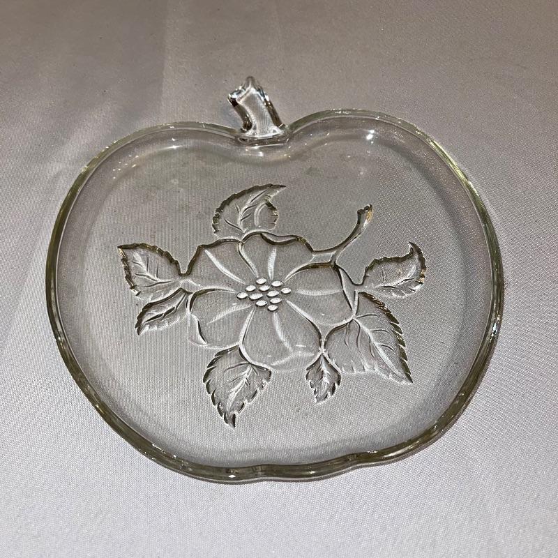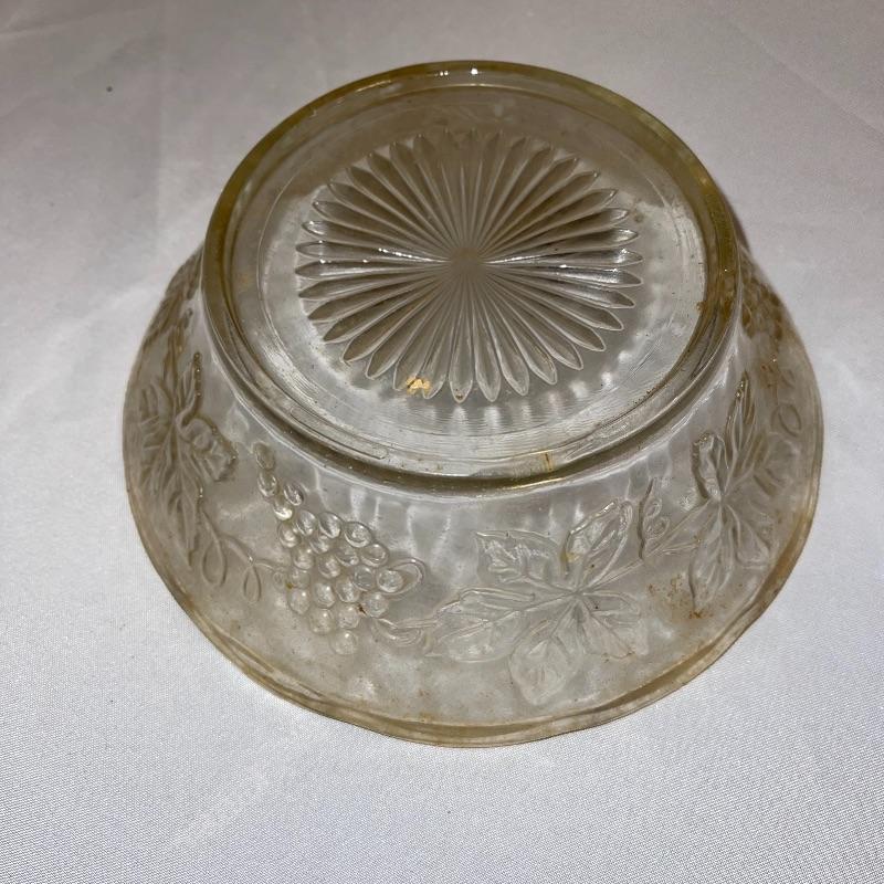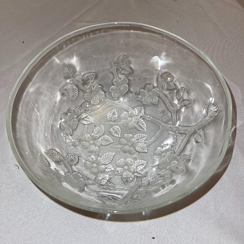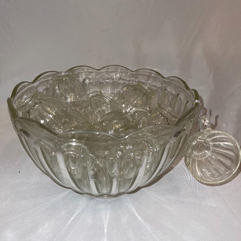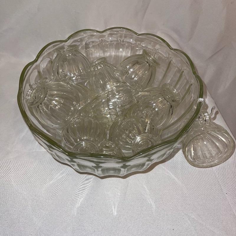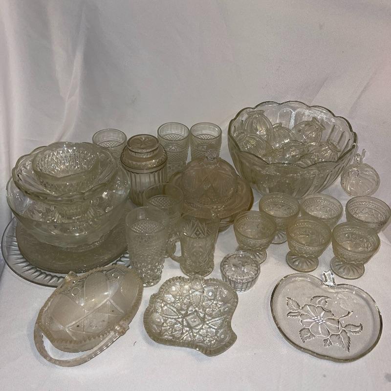 Collection of glassware bowls, plates, and cups. Highlights include a punch bowl with 14 small cups and hooks that allow the cups to hang around the rim, serving dishes detailed with fruits and leaves, and a large bowl with a flower design on the exterior. Sets of 5 drinking glasses at 6.5” tall and small parfait cups pair nicely with patterns on other dishes. With a dusting and polishing these glassware pieces will be great hosting accessories.