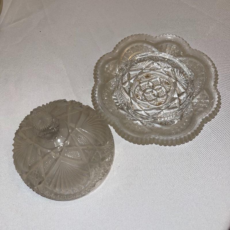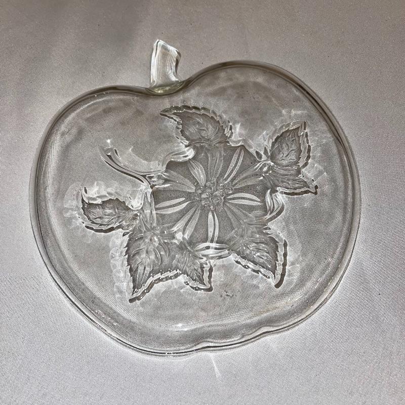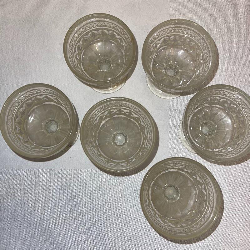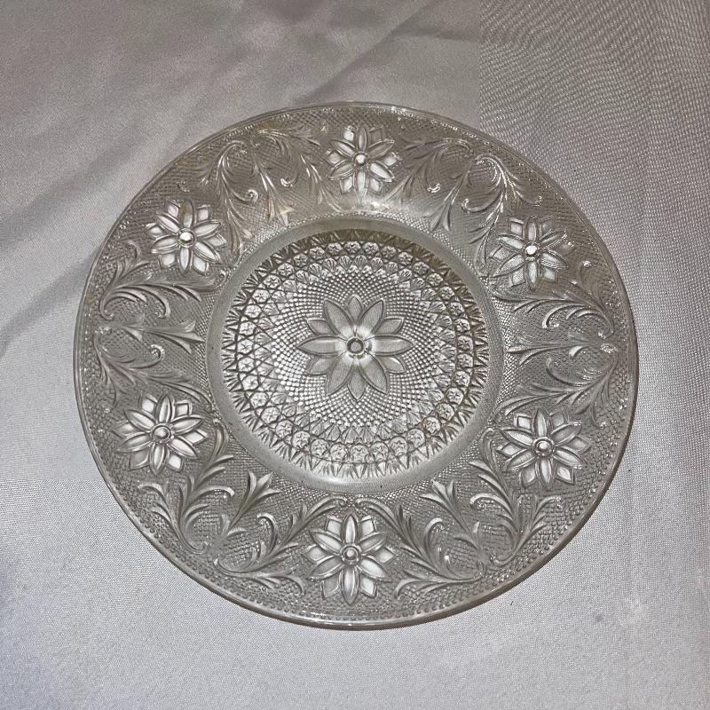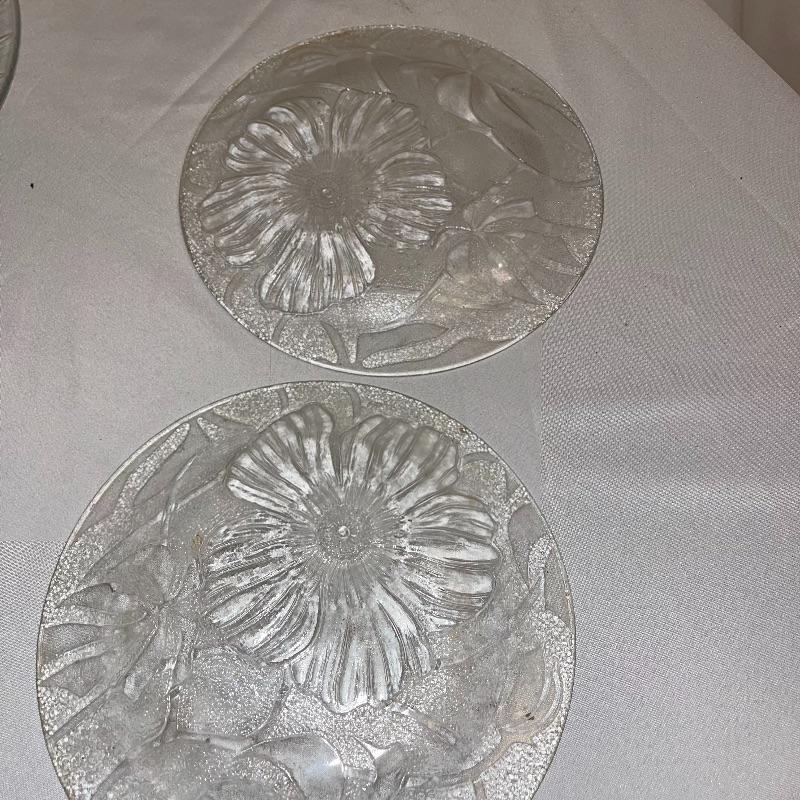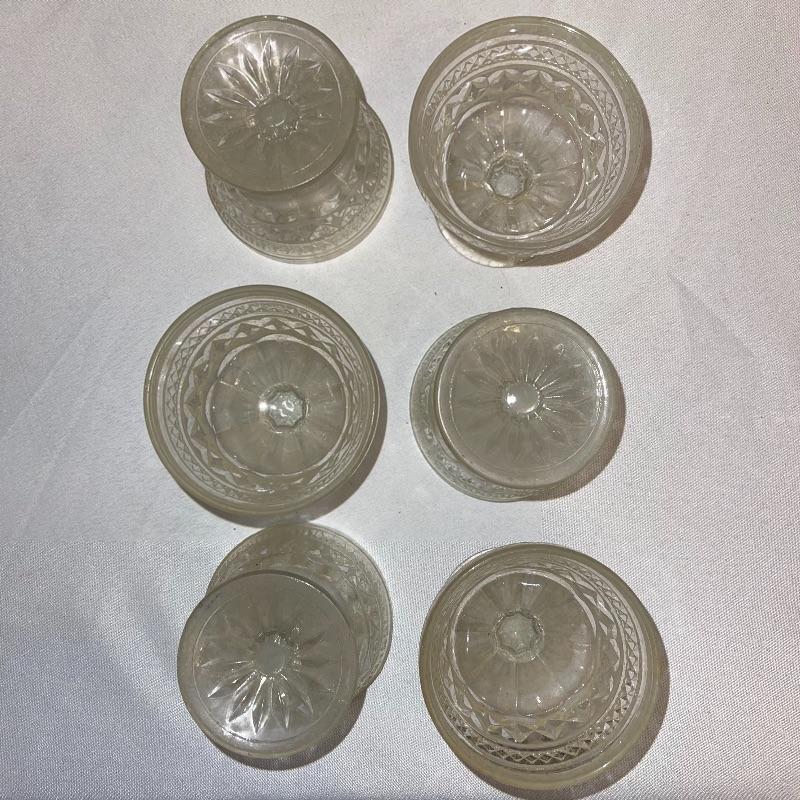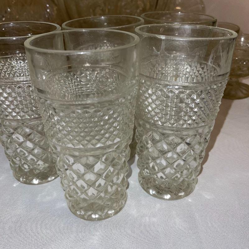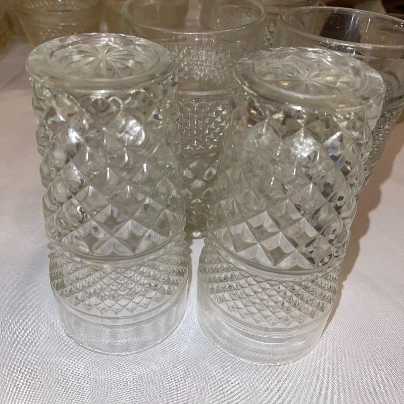 Collection of glassware bowls, plates, and cups. Highlights include a punch bowl with 14 small cups and hooks that allow the cups to hang around the rim, serving dishes detailed with fruits and leaves, and a large bowl with a flower design on the exterior. Sets of 5 drinking glasses at 6.5” tall and small parfait cups pair nicely with patterns on other dishes. With a dusting and polishing these glassware pieces will be great hosting accessories.