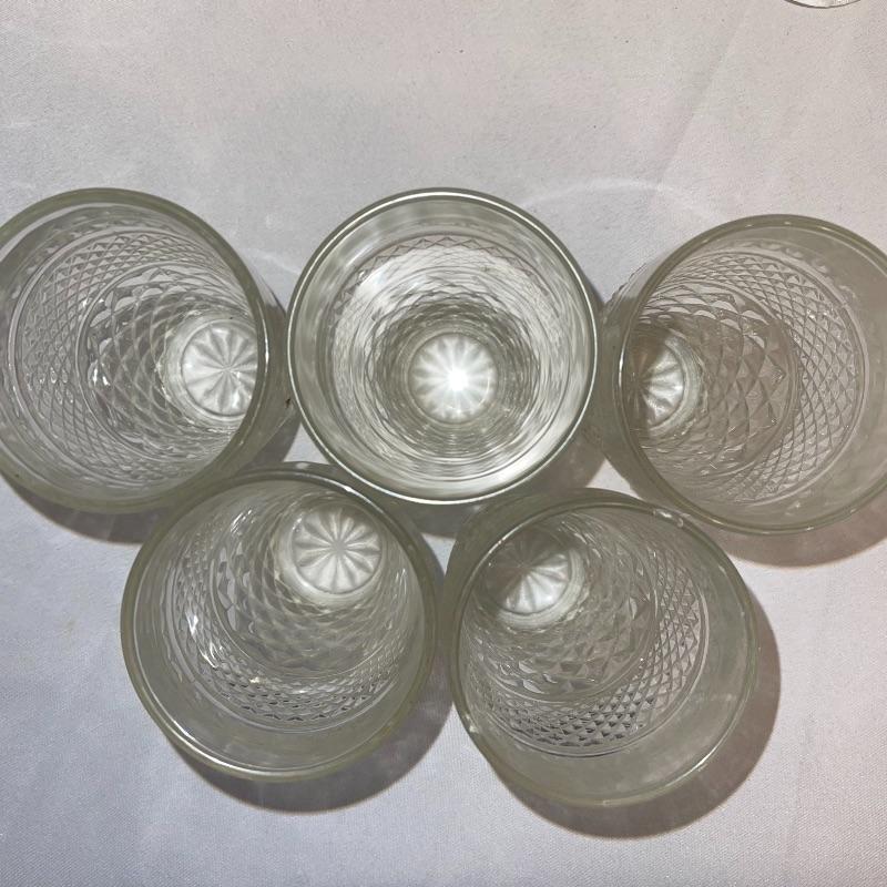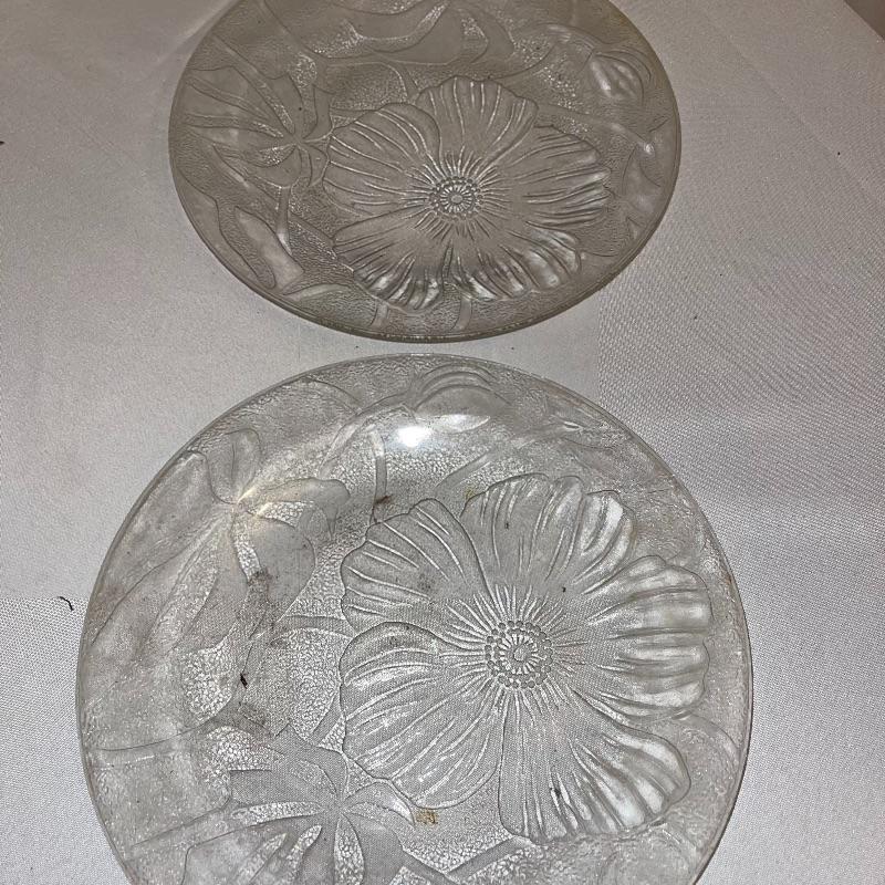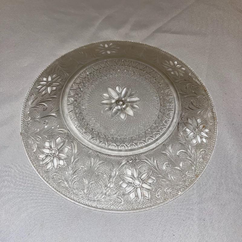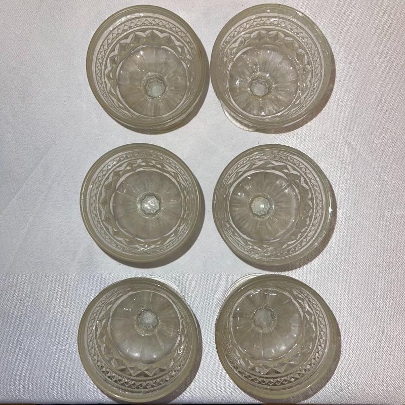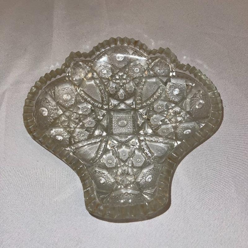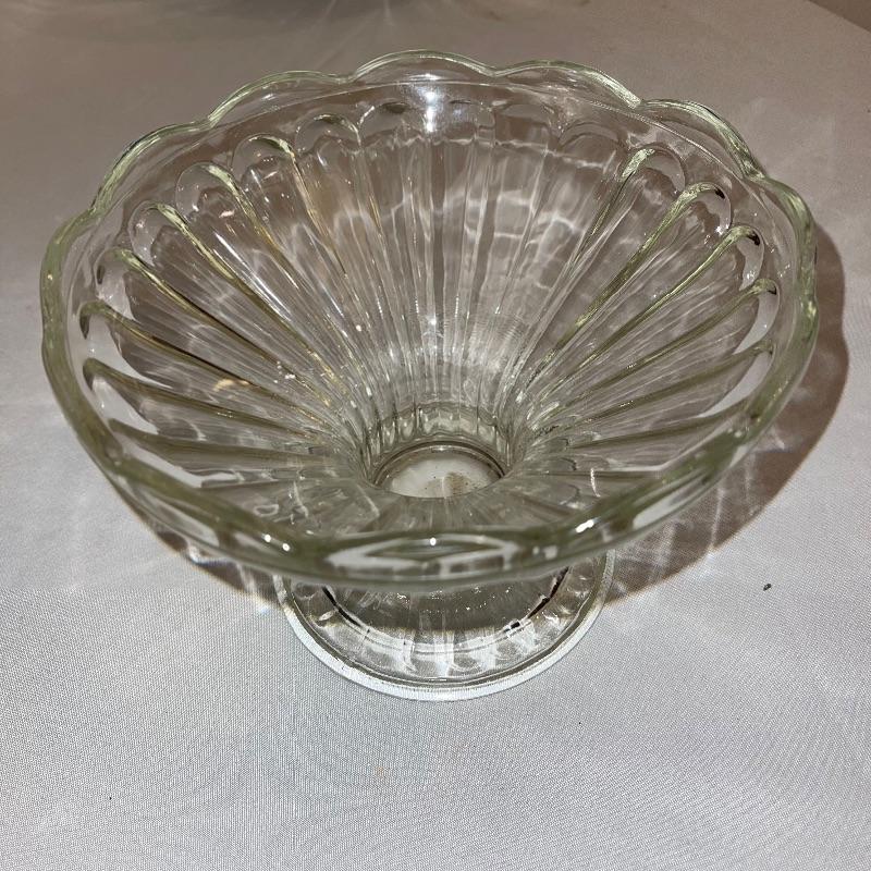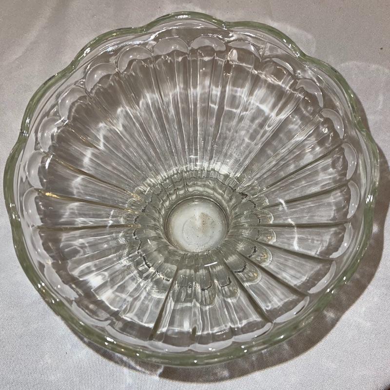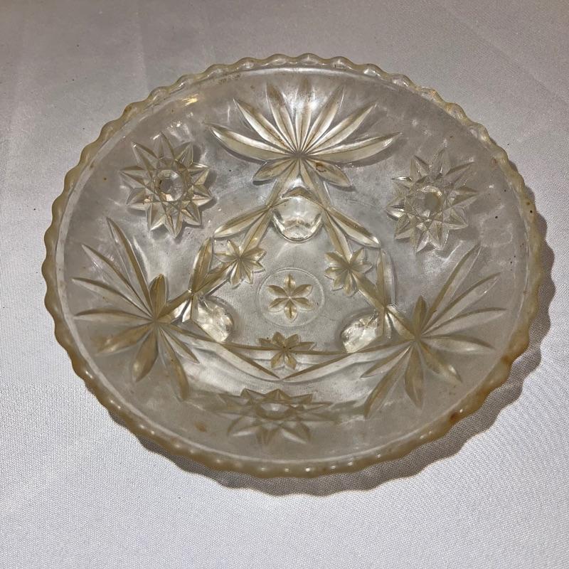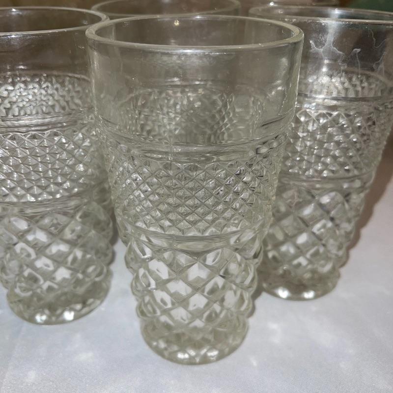 Collection of glassware bowls, plates, and cups. Highlights include a punch bowl with 14 small cups and hooks that allow the cups to hang around the rim, serving dishes detailed with fruits and leaves, and a large bowl with a flower design on the exterior. Sets of 5 drinking glasses at 6.5” tall and small parfait cups pair nicely with patterns on other dishes. With a dusting and polishing these glassware pieces will be great hosting accessories.