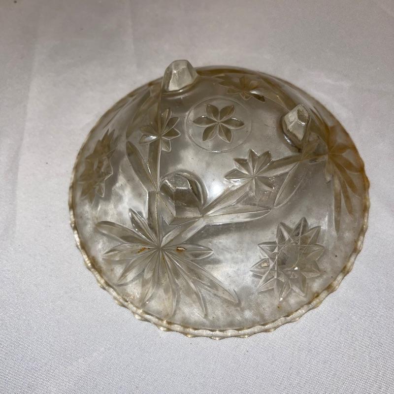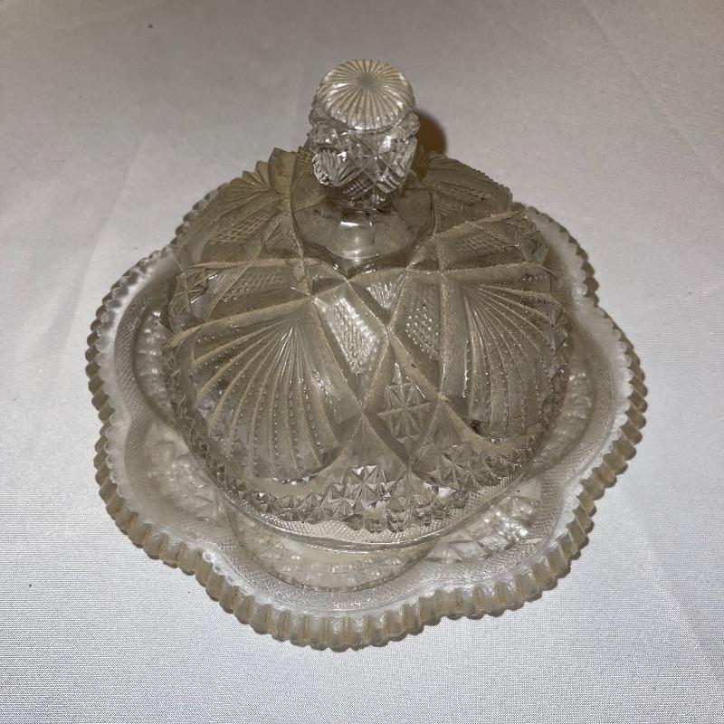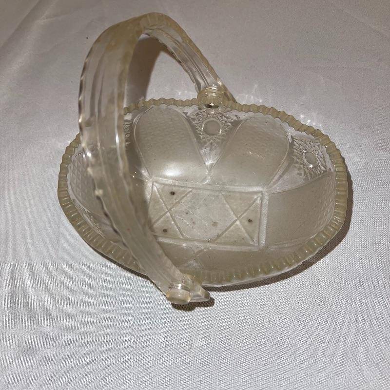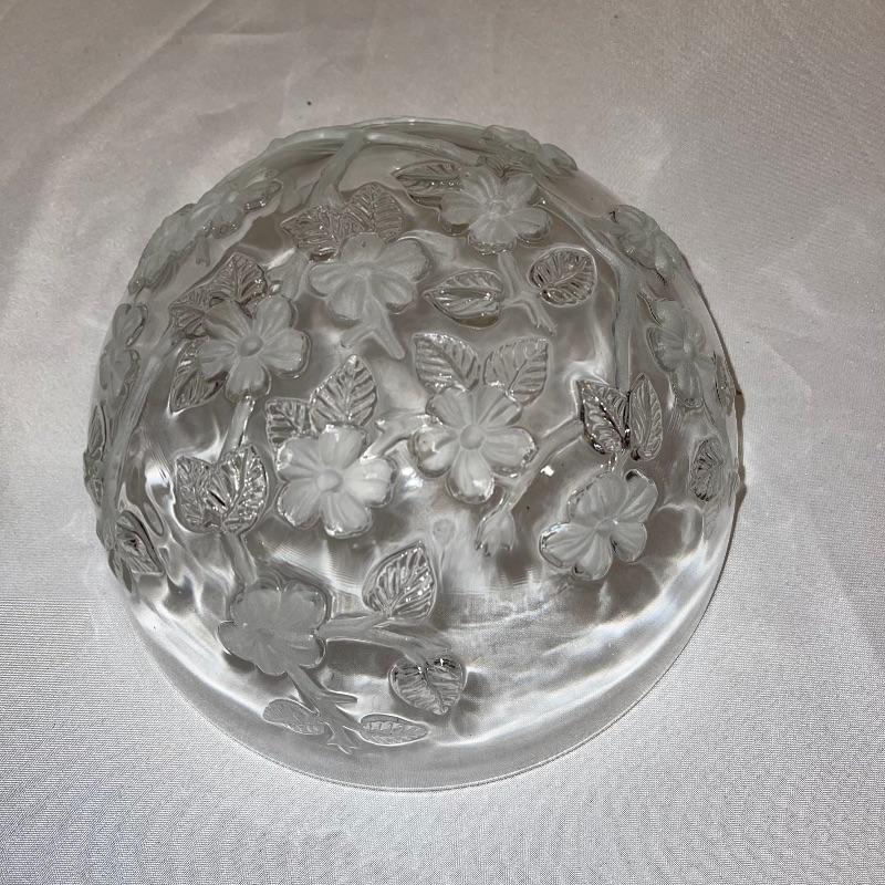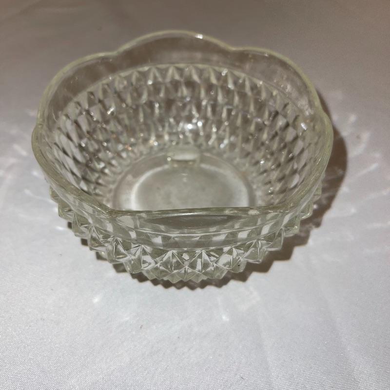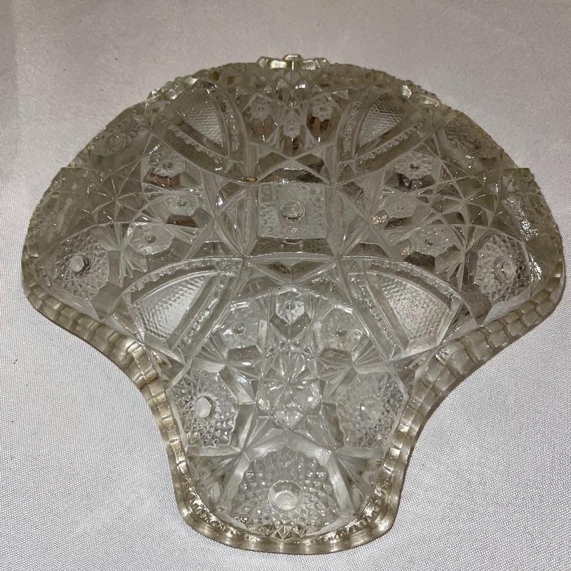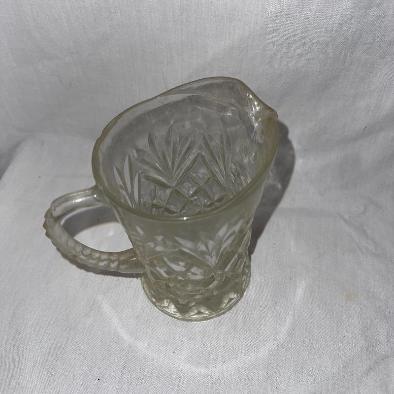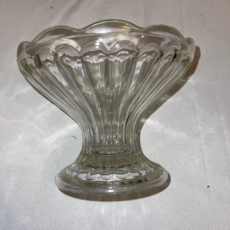 Collection of glassware bowls, plates, and cups. Highlights include a punch bowl with 14 small cups and hooks that allow the cups to hang around the rim, serving dishes detailed with fruits and leaves, and a large bowl with a flower design on the exterior. Sets of 5 drinking glasses at 6.5” tall and small parfait cups pair nicely with patterns on other dishes. With a dusting and polishing these glassware pieces will be great hosting accessories.