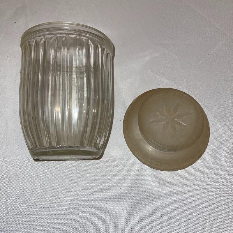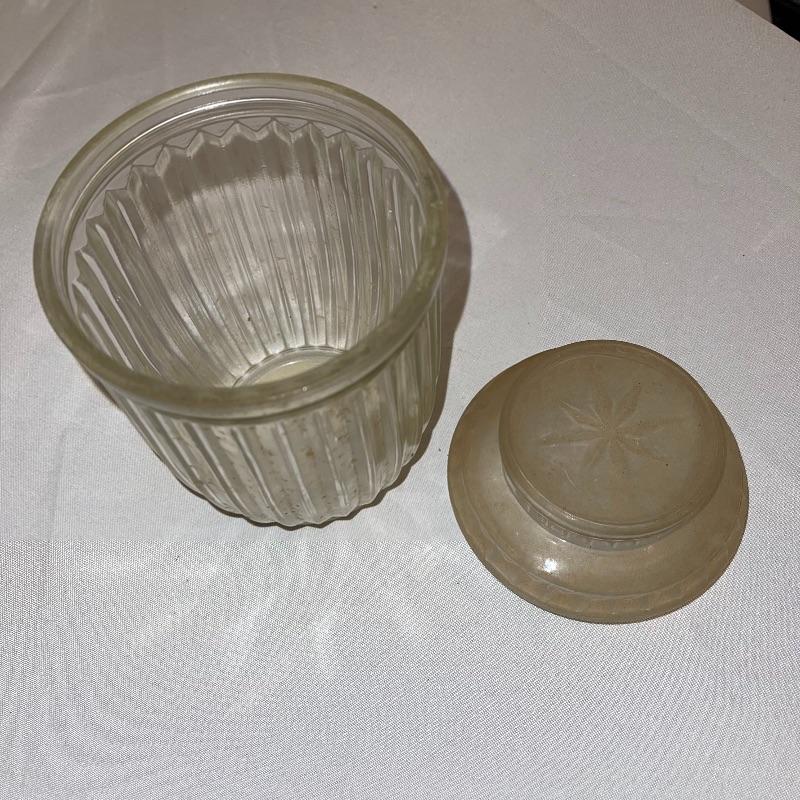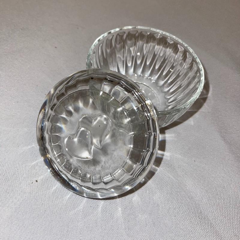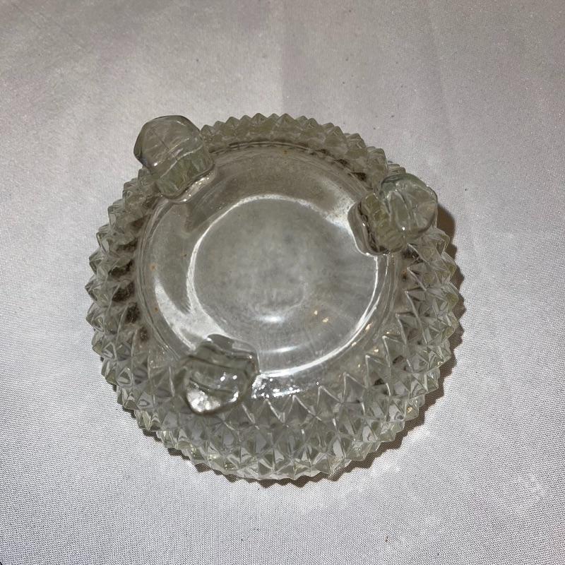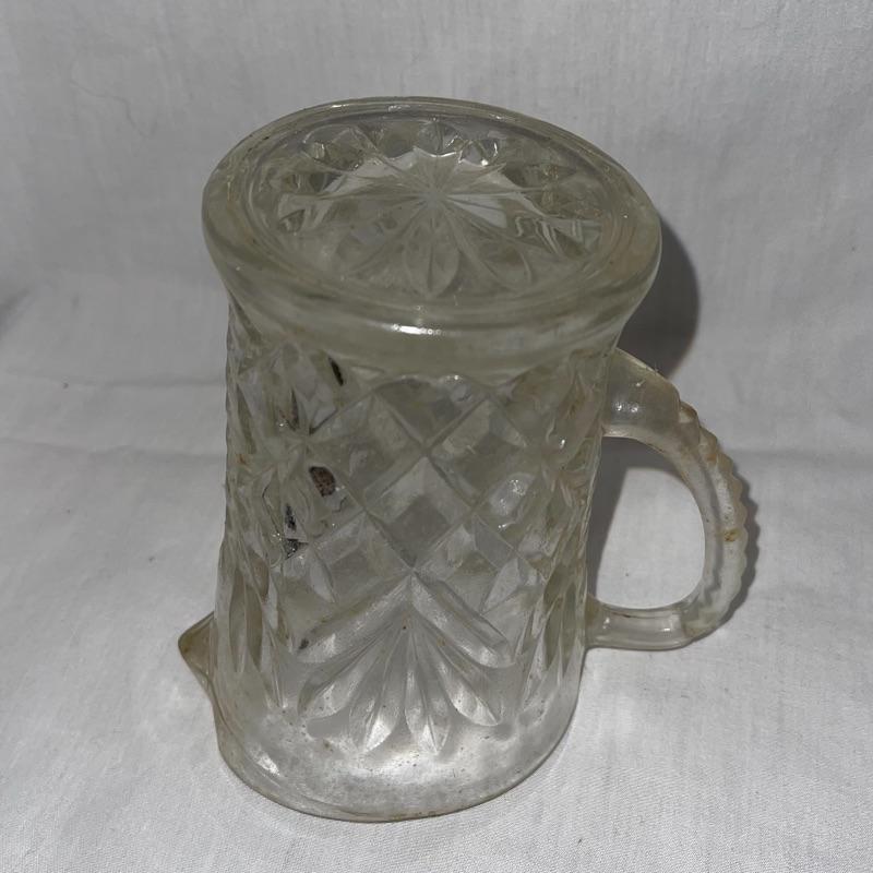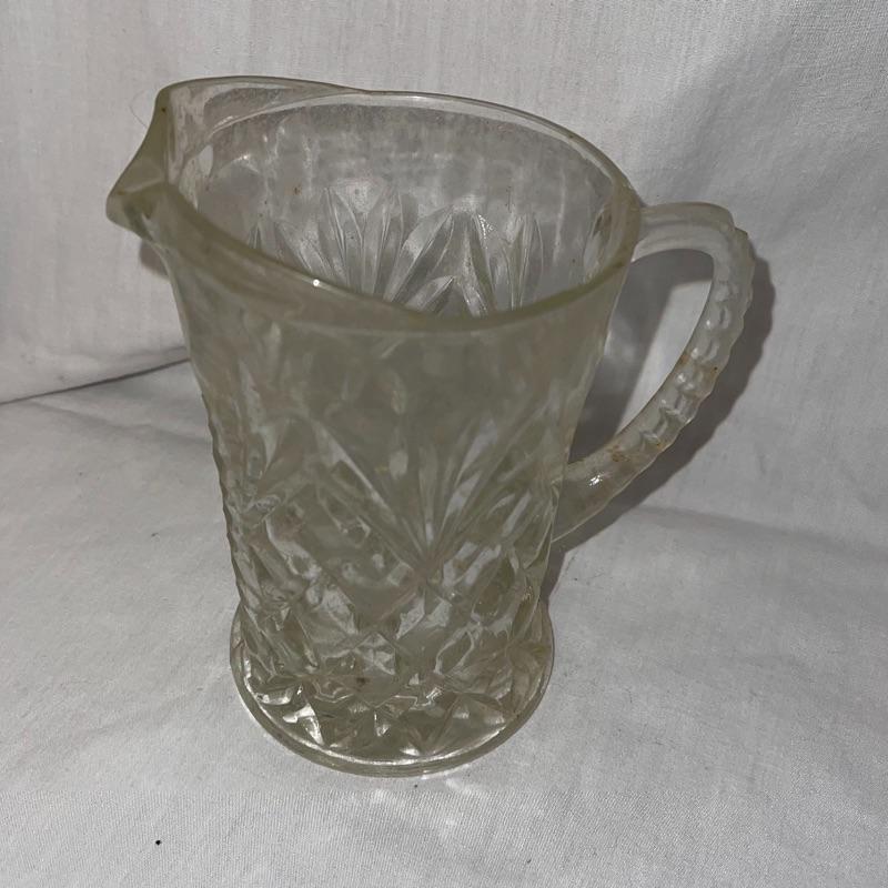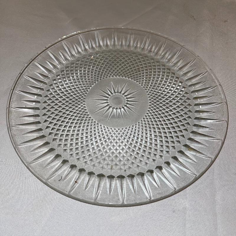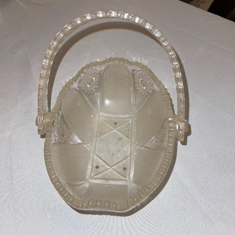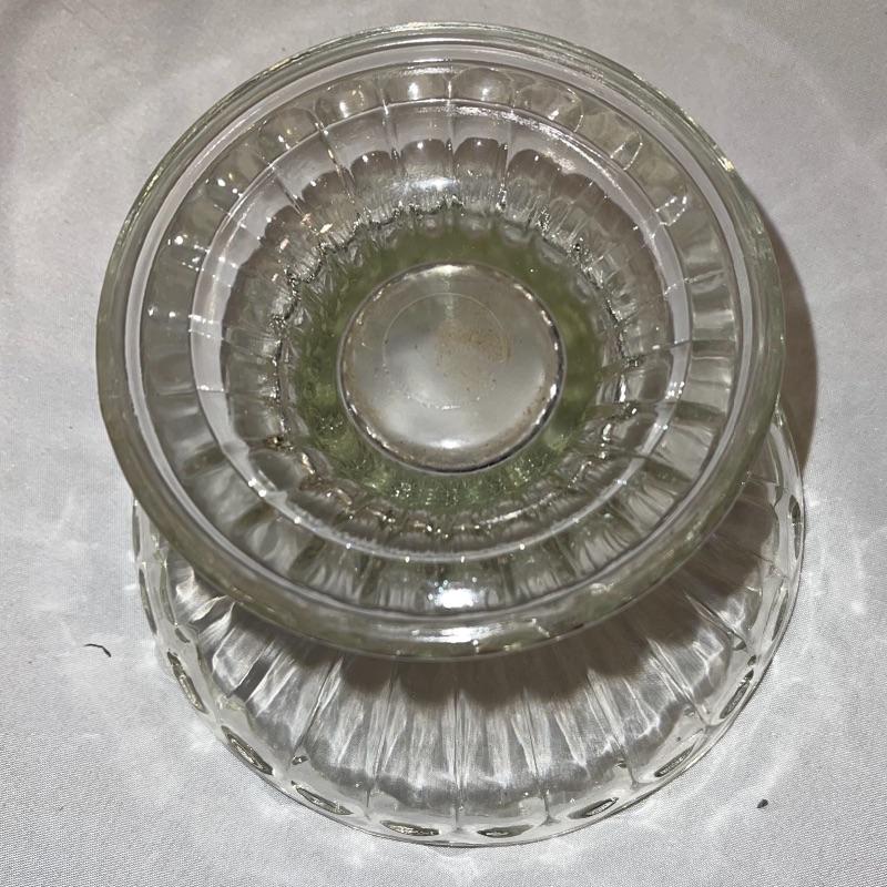 Collection of glassware bowls, plates, and cups. Highlights include a punch bowl with 14 small cups and hooks that allow the cups to hang around the rim, serving dishes detailed with fruits and leaves, and a large bowl with a flower design on the exterior. Sets of 5 drinking glasses at 6.5” tall and small parfait cups pair nicely with patterns on other dishes. With a dusting and polishing these glassware pieces will be great hosting accessories.