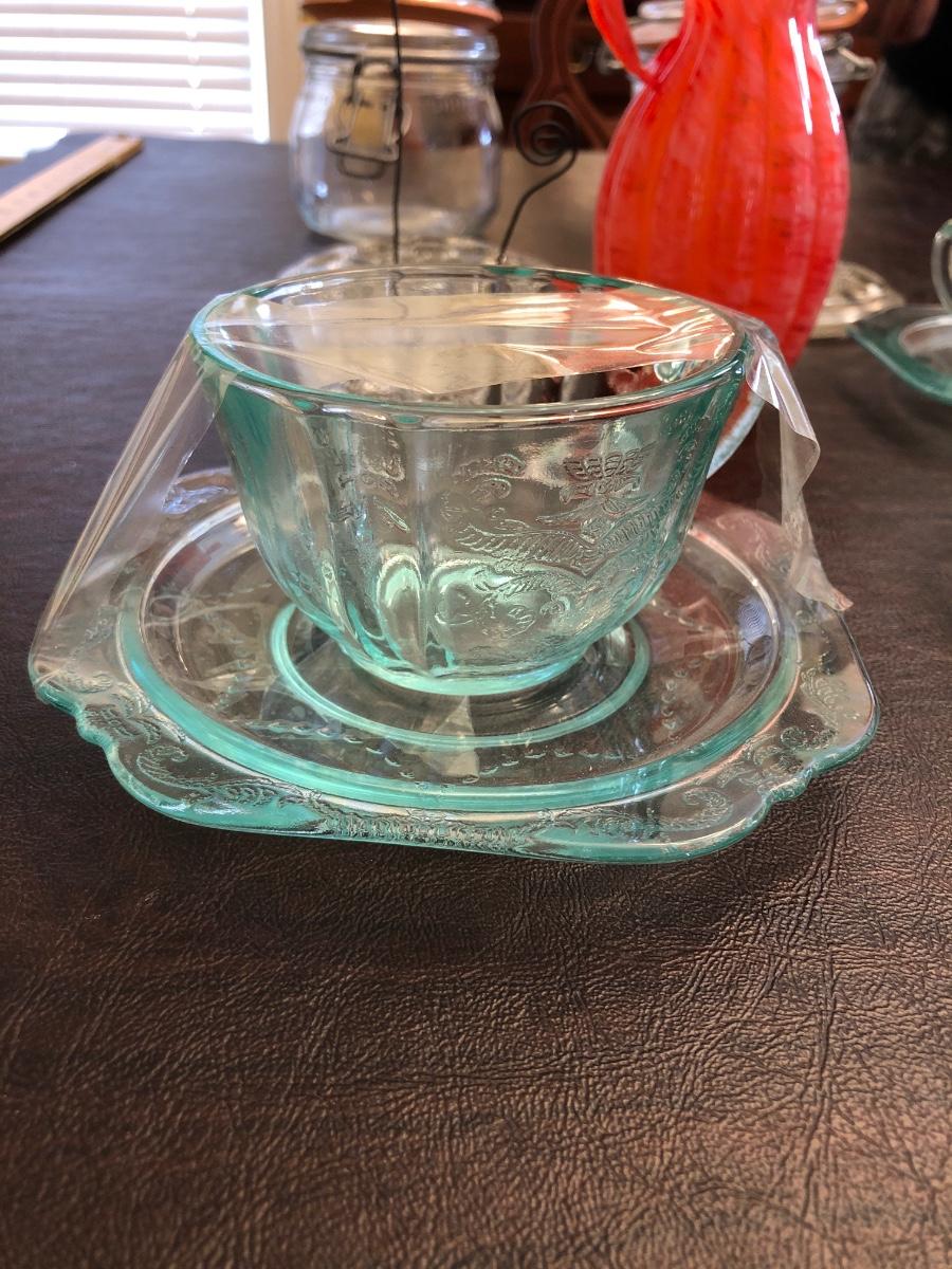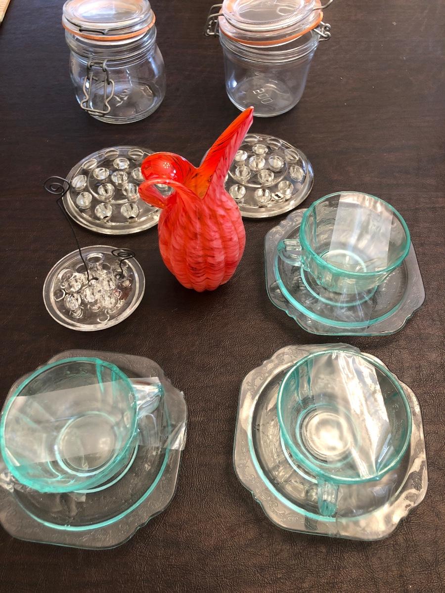 Depression glass cups and saucers, glass flower frogs, and a decorative vase.