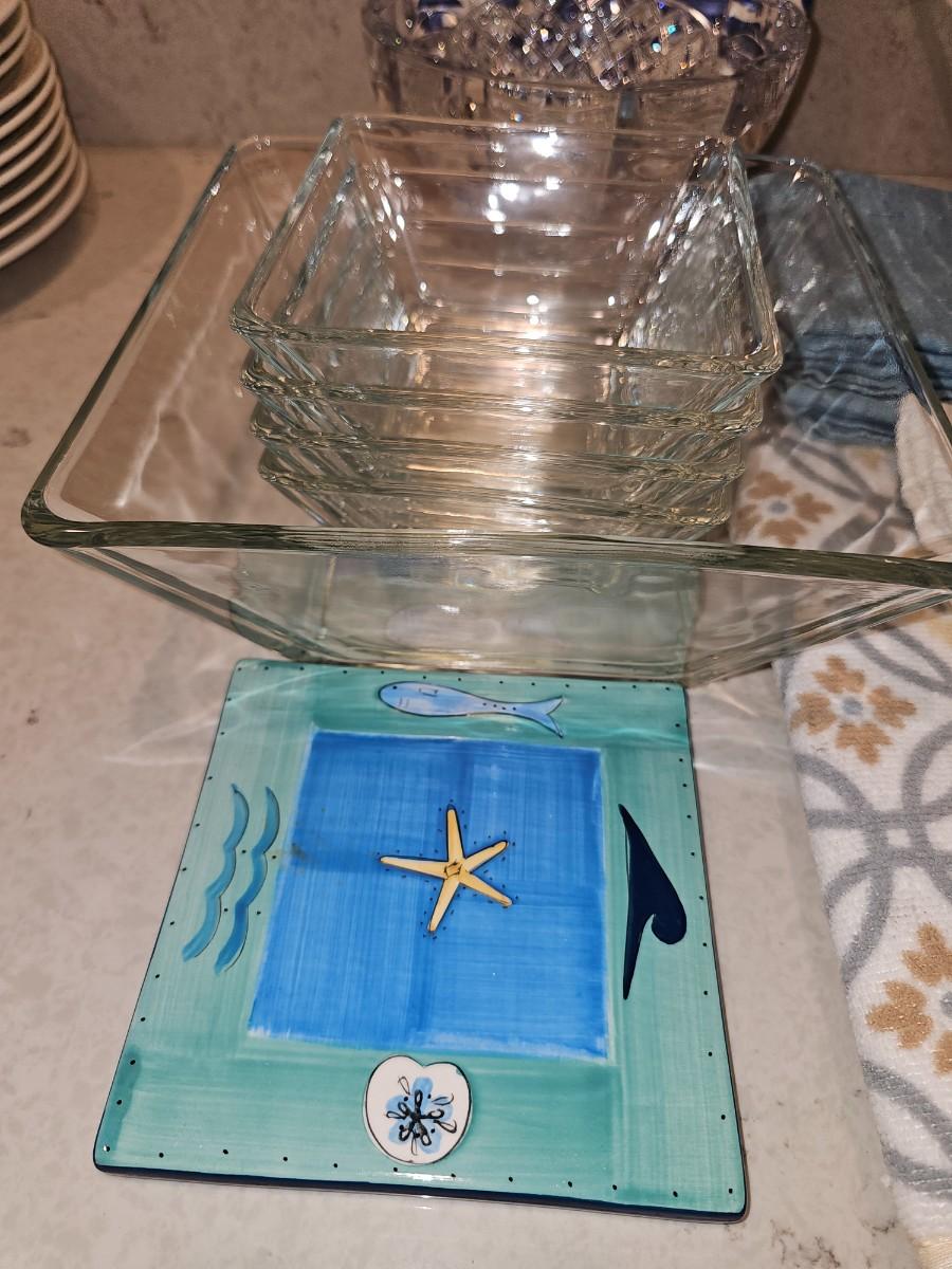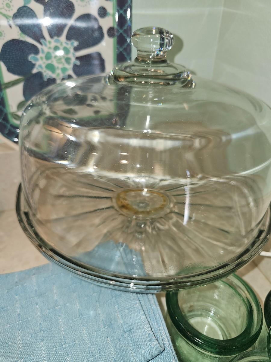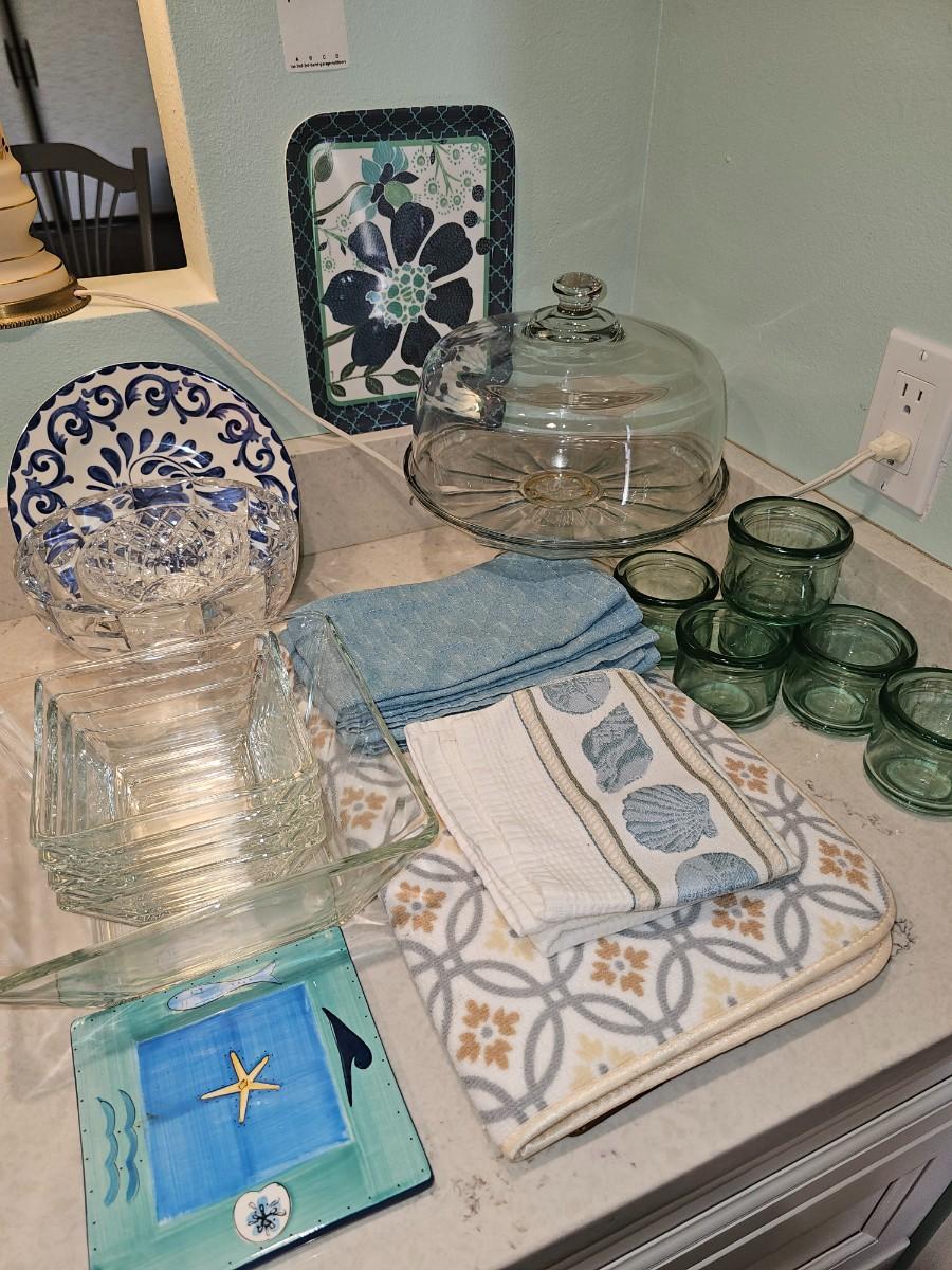 Various items, cake stand, kitchen linens, glass bowls, square glass salad bowl set,