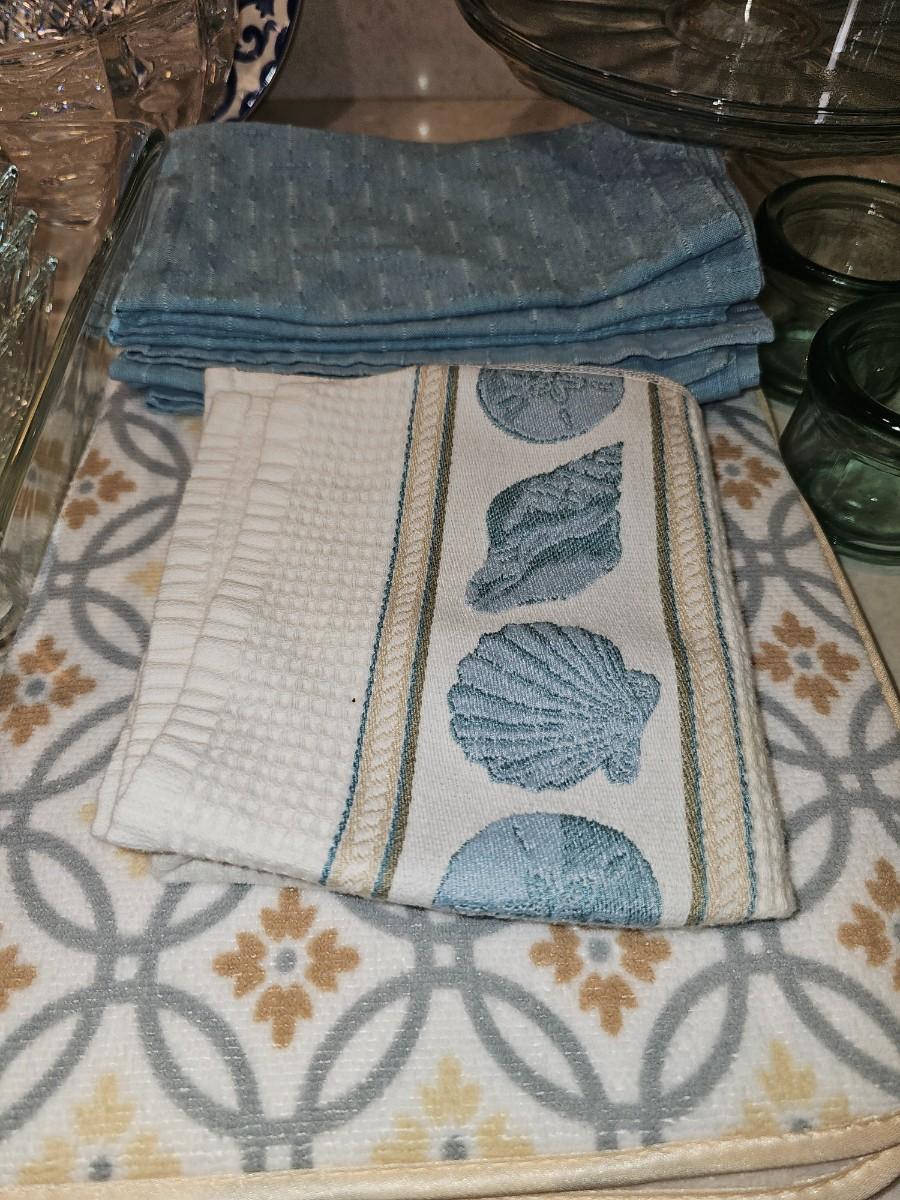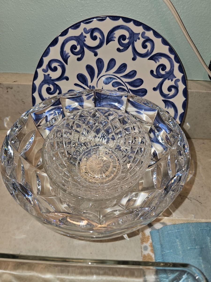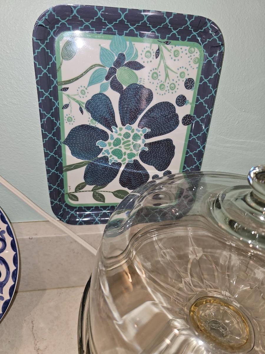 Various items, cake stand, kitchen linens, glass bowls, square glass salad bowl set,