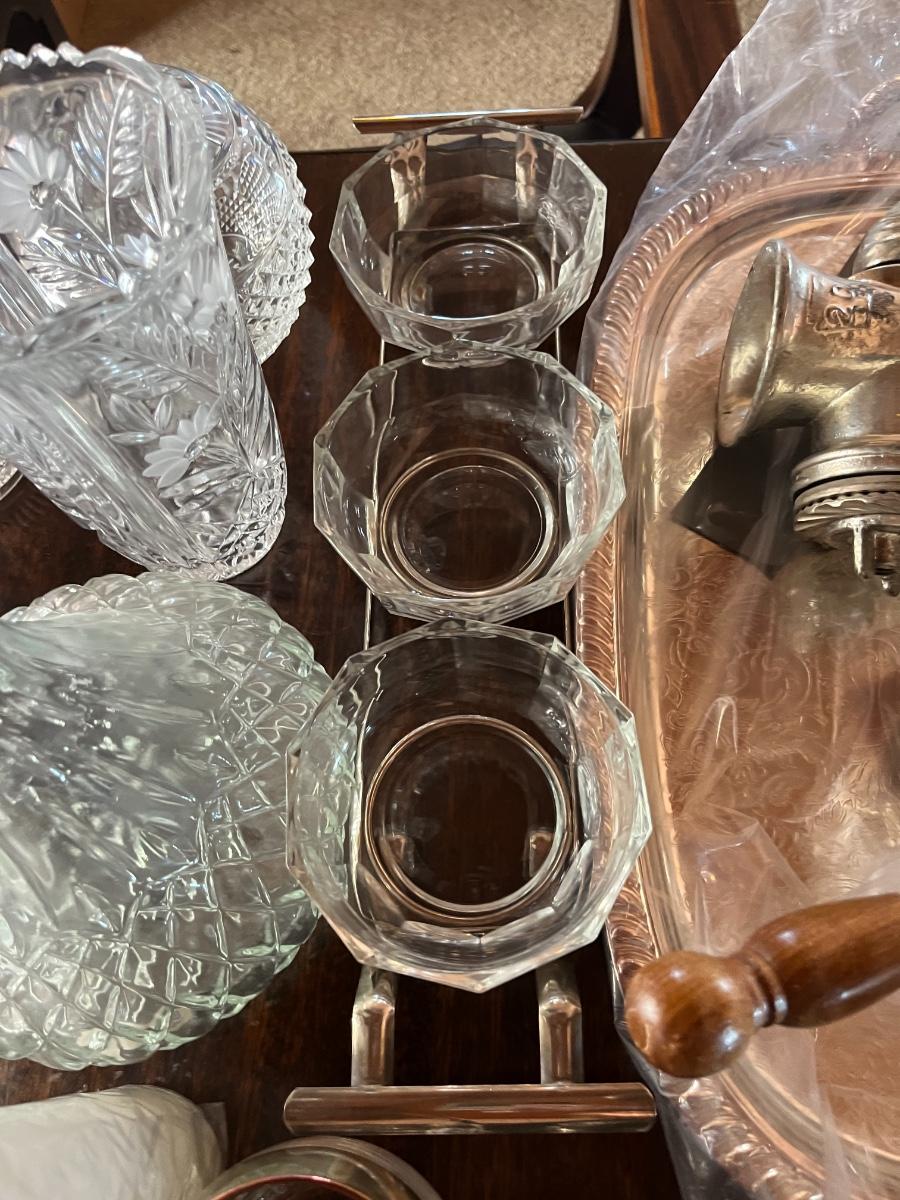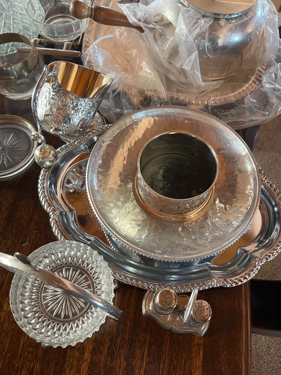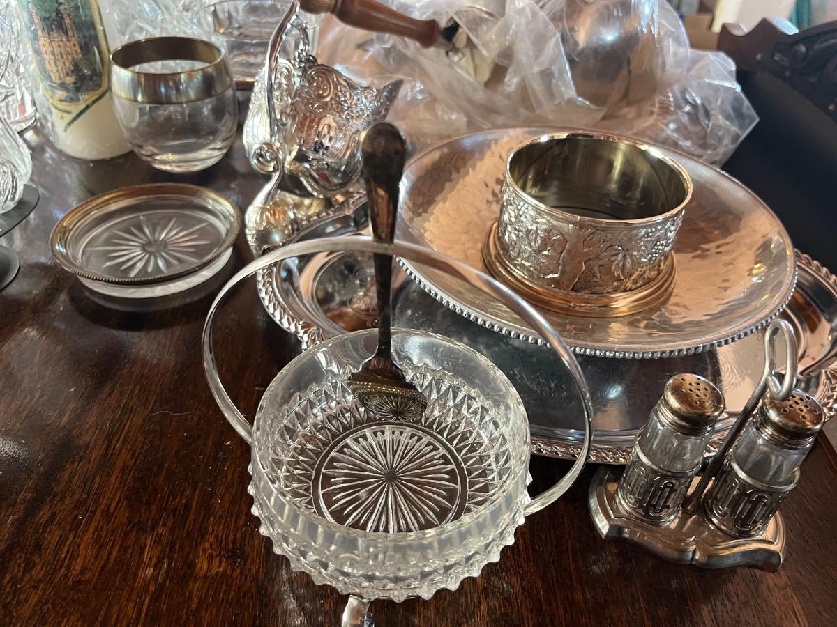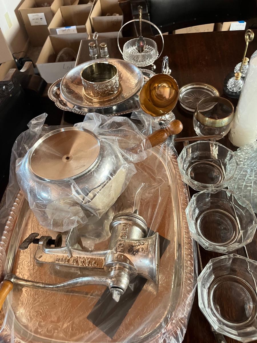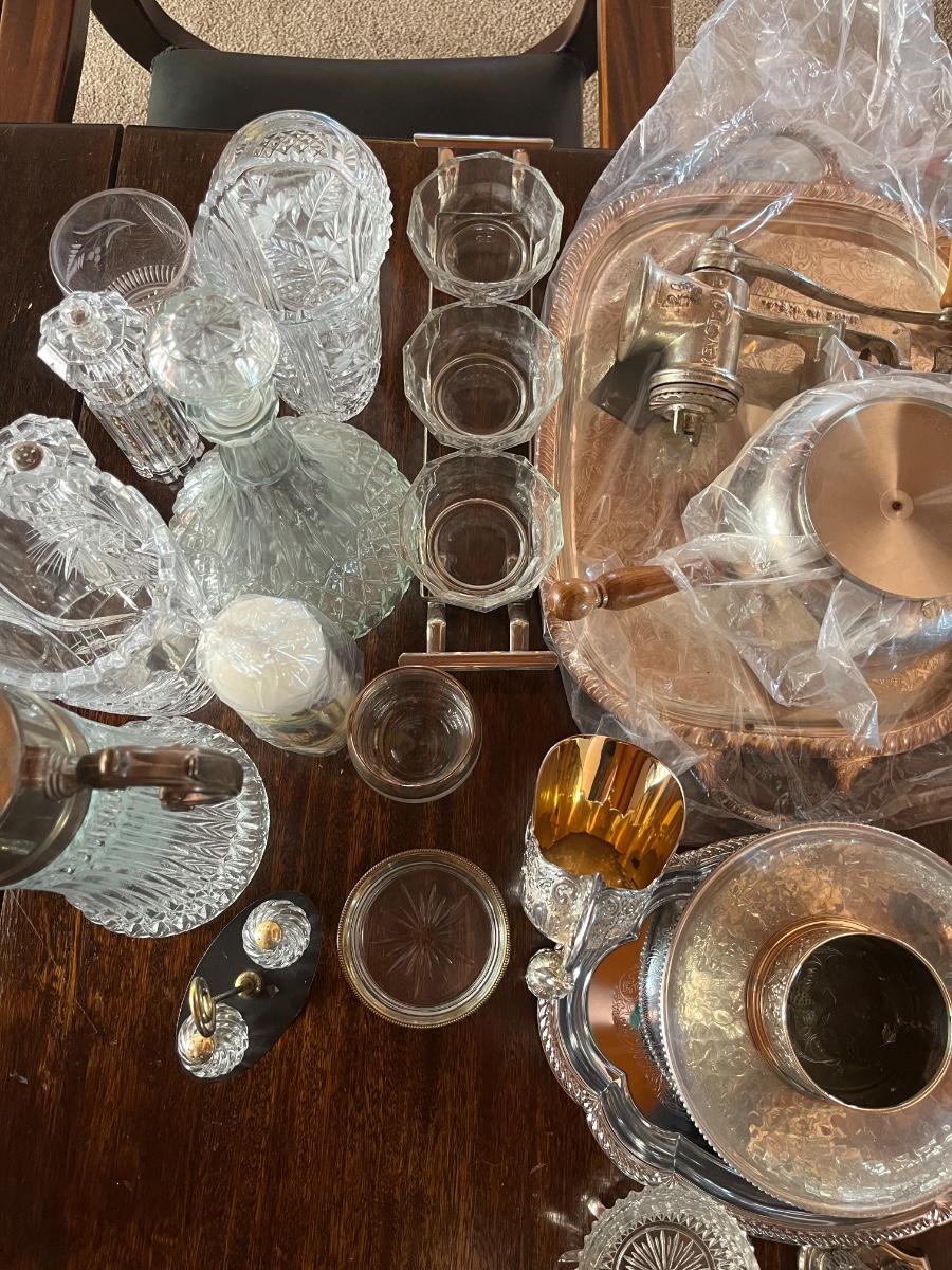Glassware, pressed glass, picture, salt n pepper shakers, and silver serving (plates, pot, etc), meat grinder