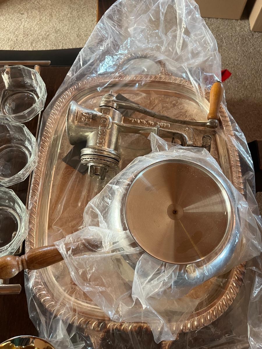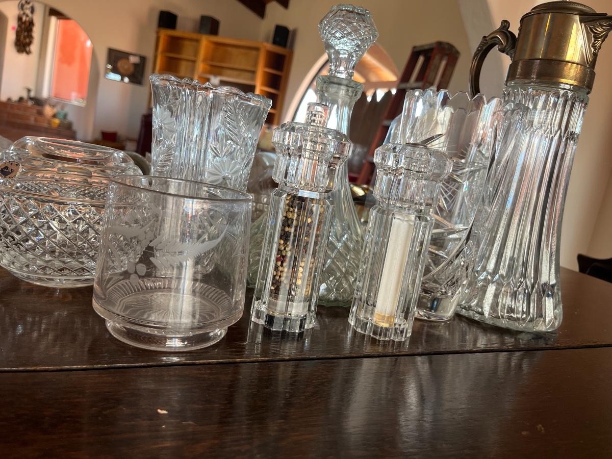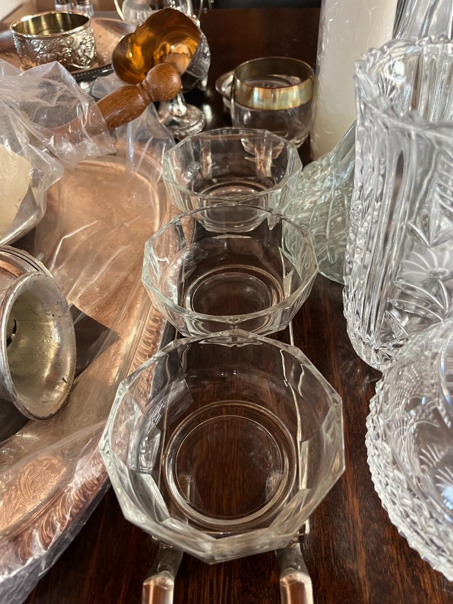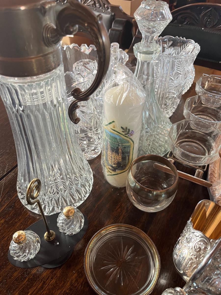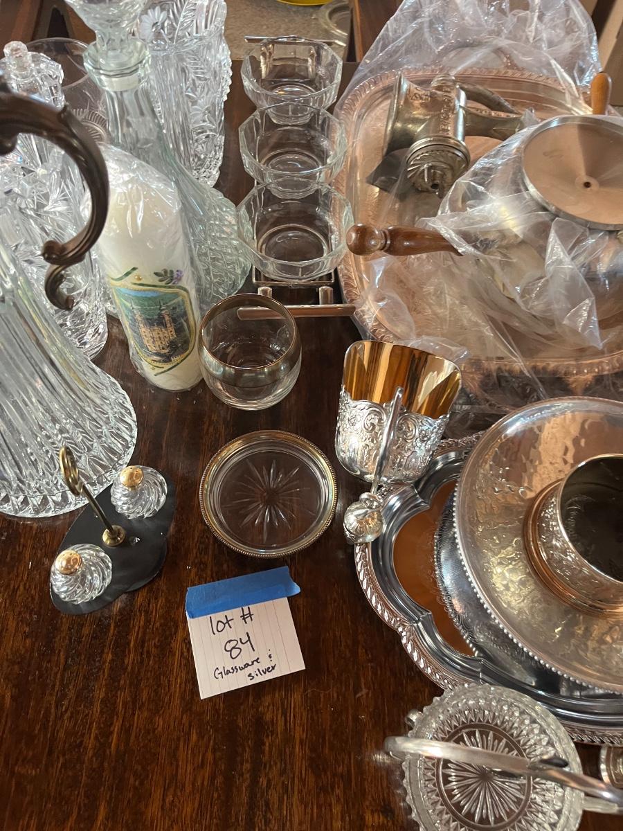 Glassware, pressed glass, picture, salt n pepper shakers, and silver serving (plates, pot, etc), meat grinder