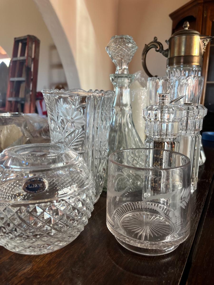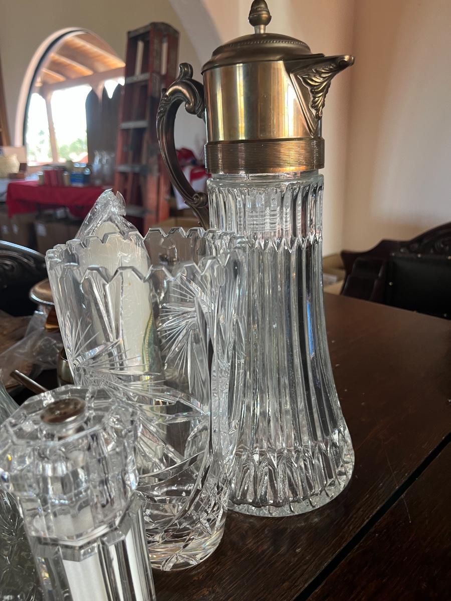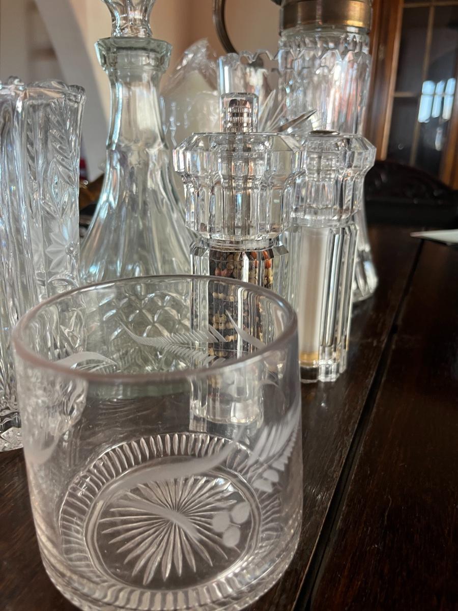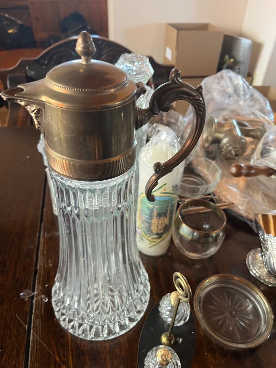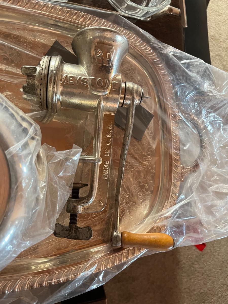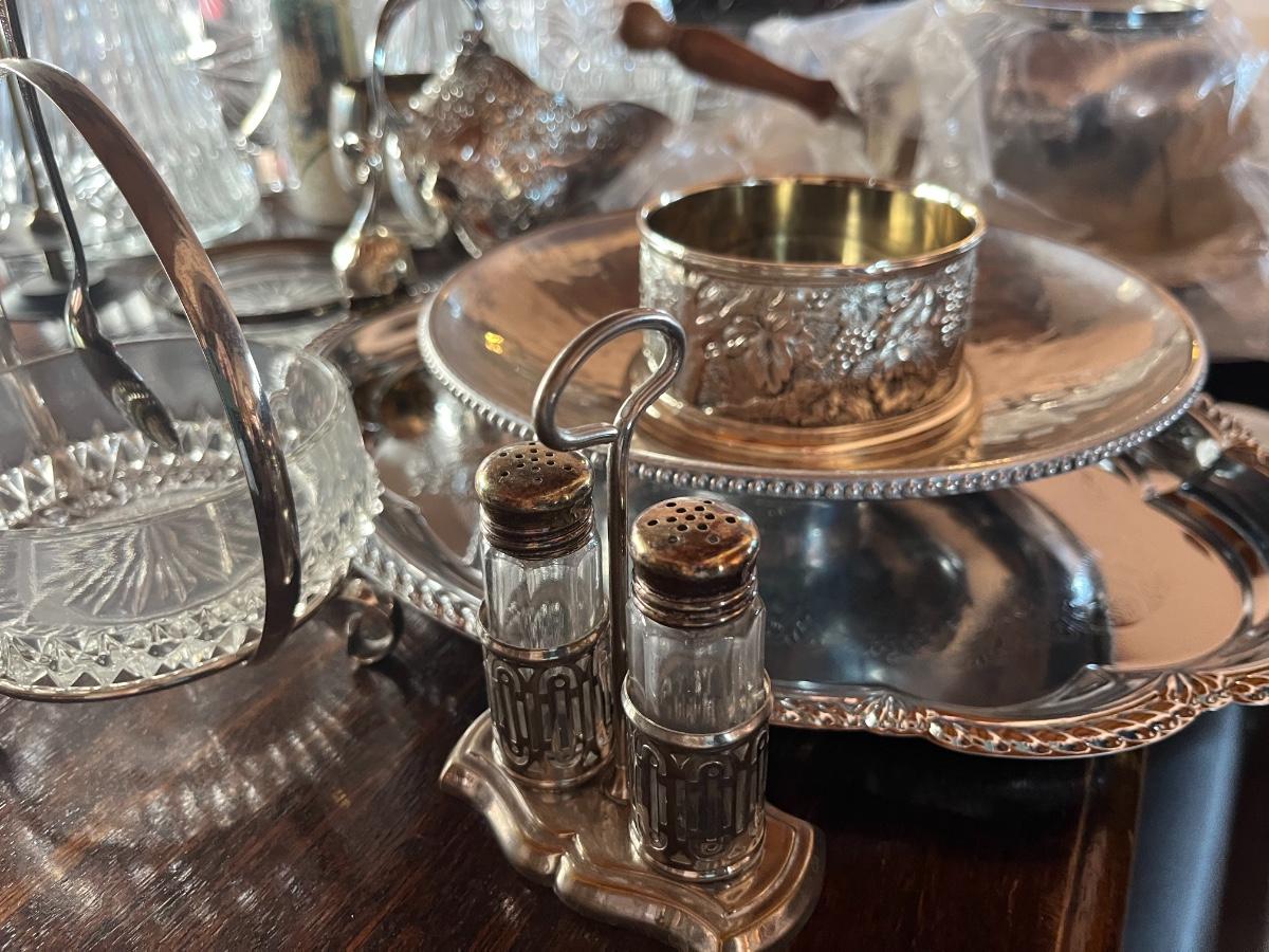 Glassware, pressed glass, picture, salt n pepper shakers, and silver serving (plates, pot, etc), meat grinder