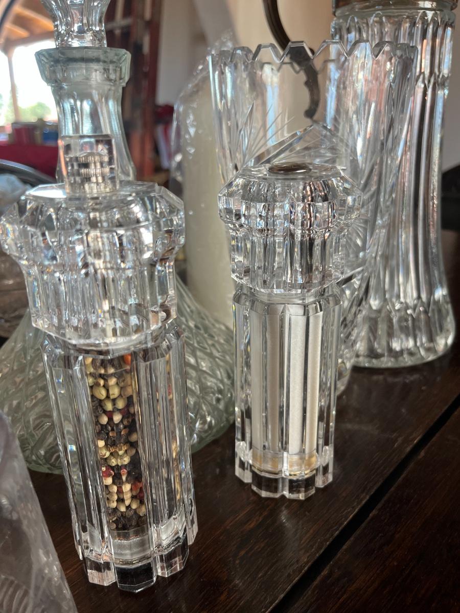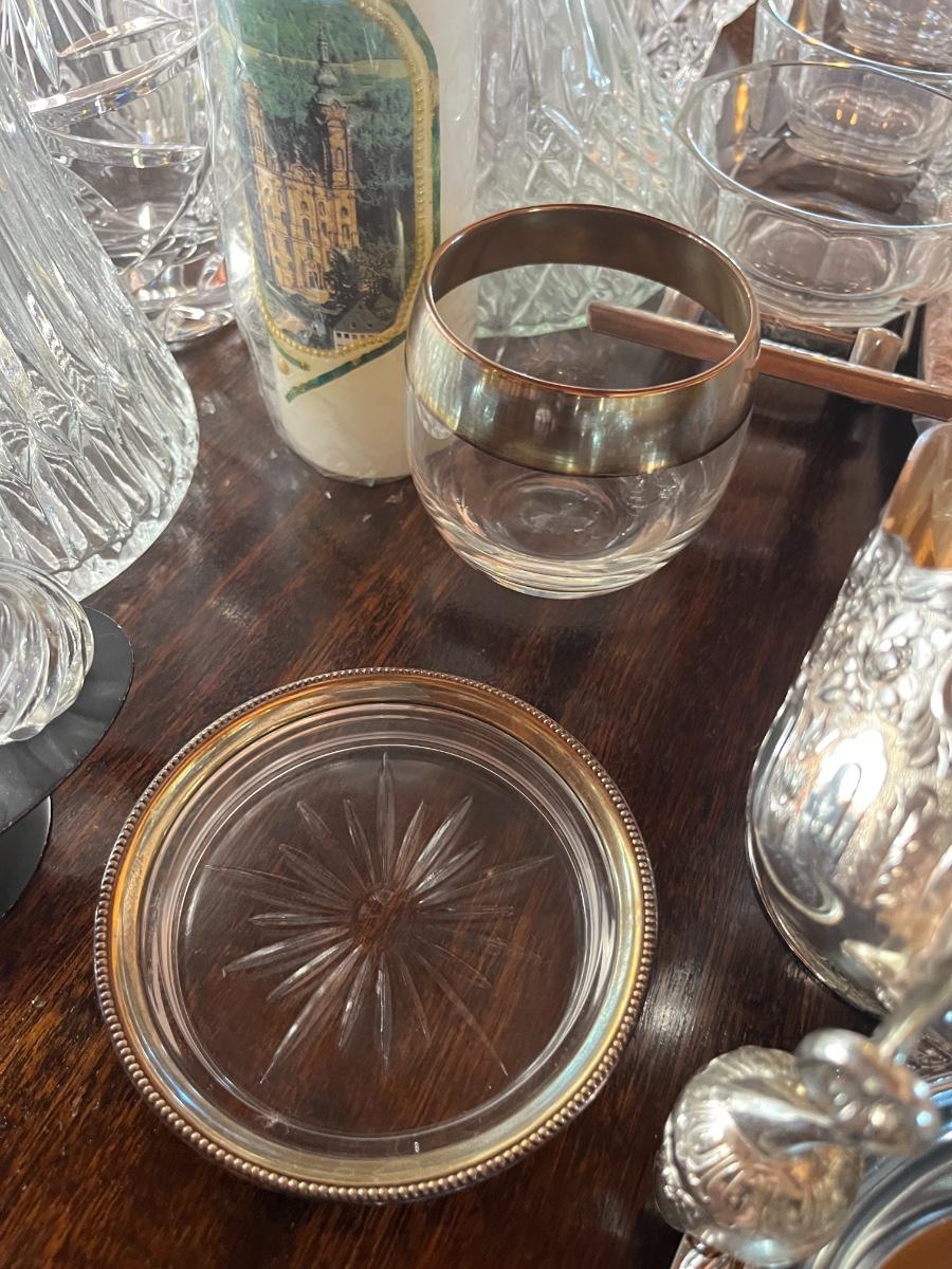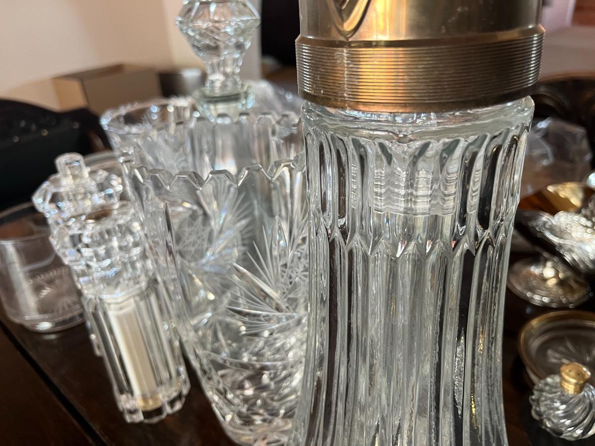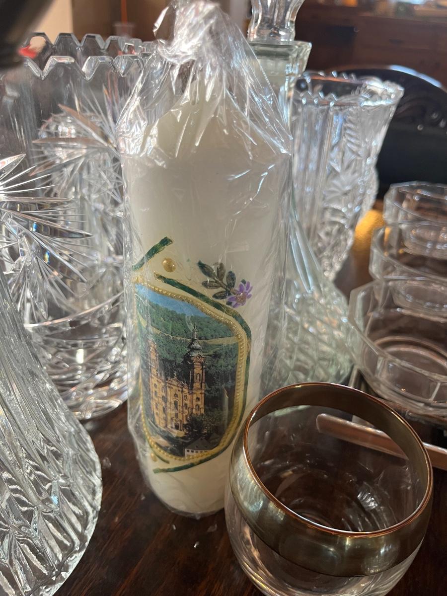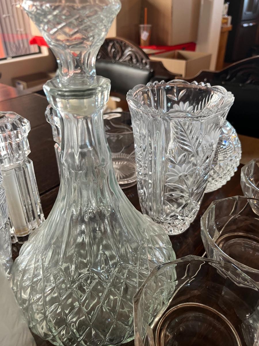 Glassware, pressed glass, picture, salt n pepper shakers, and silver serving (plates, pot, etc), meat grinder