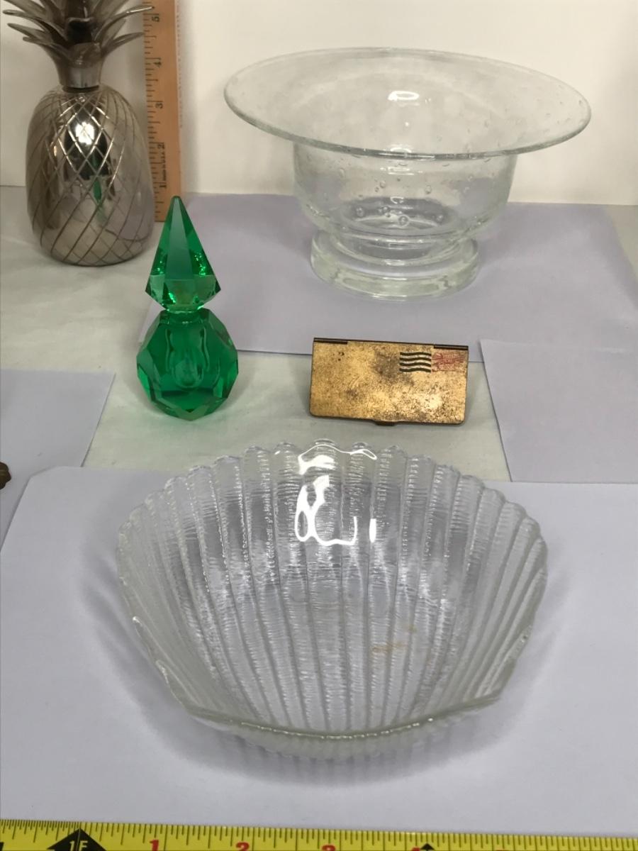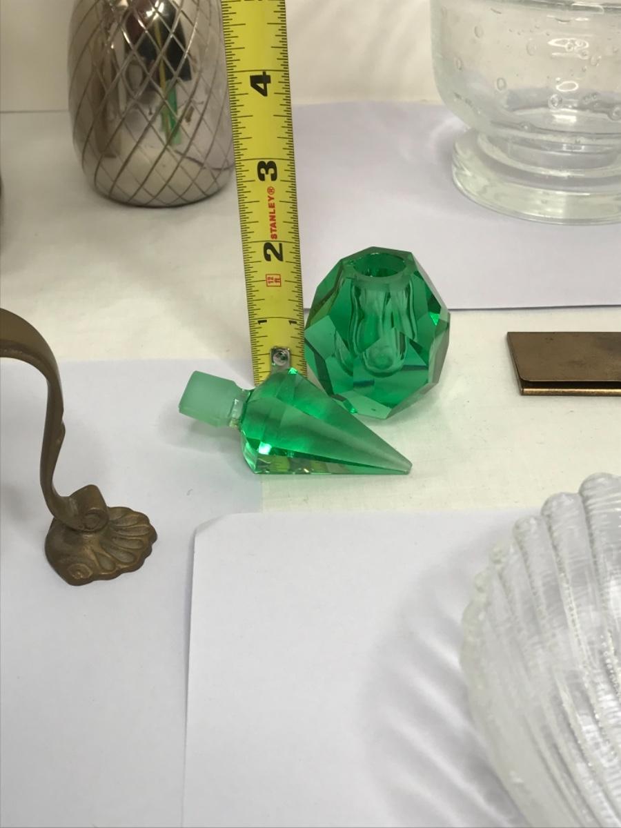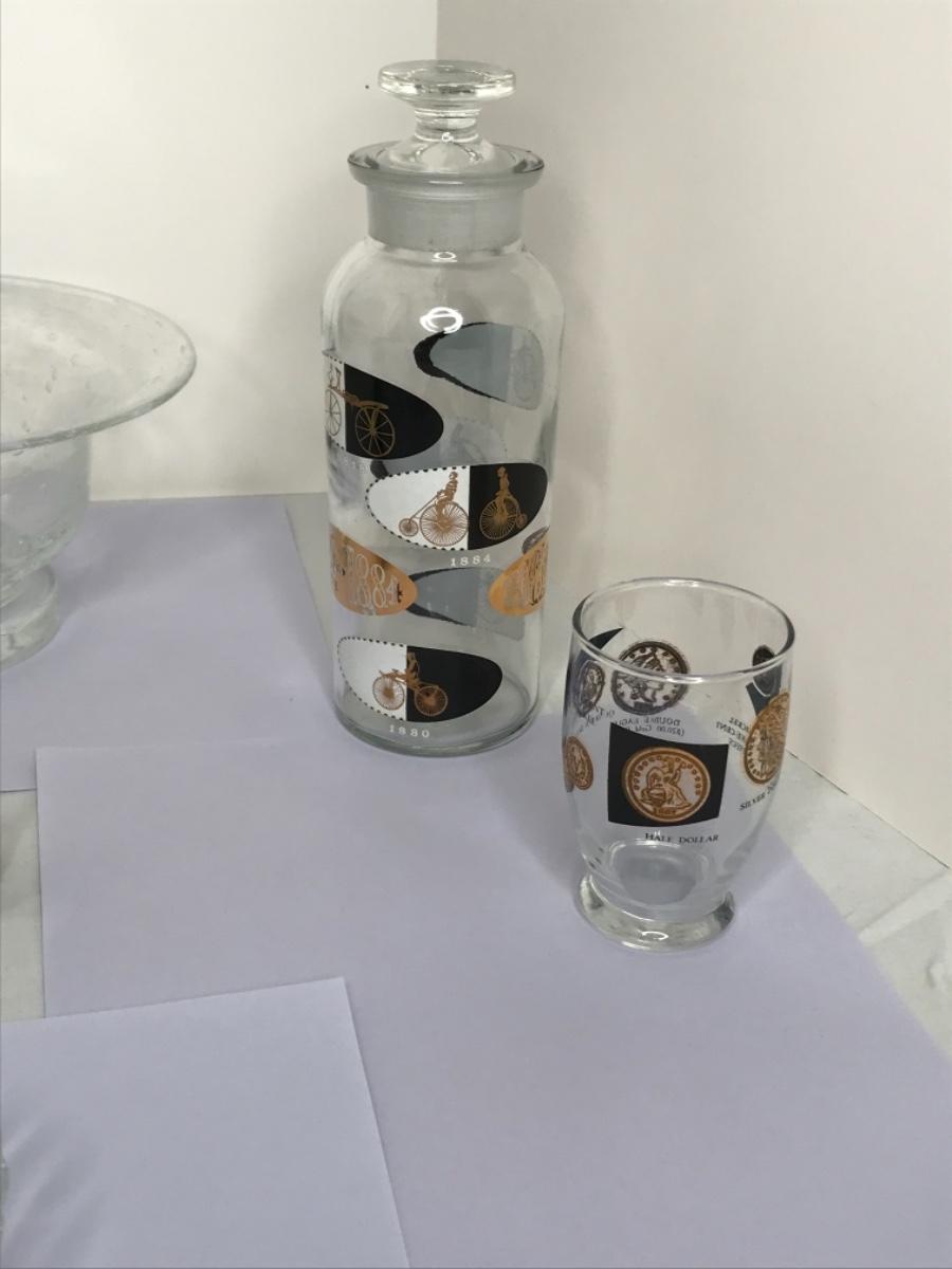 Ceraglass bottle with top and 1 small glass MCM with black and gold labels