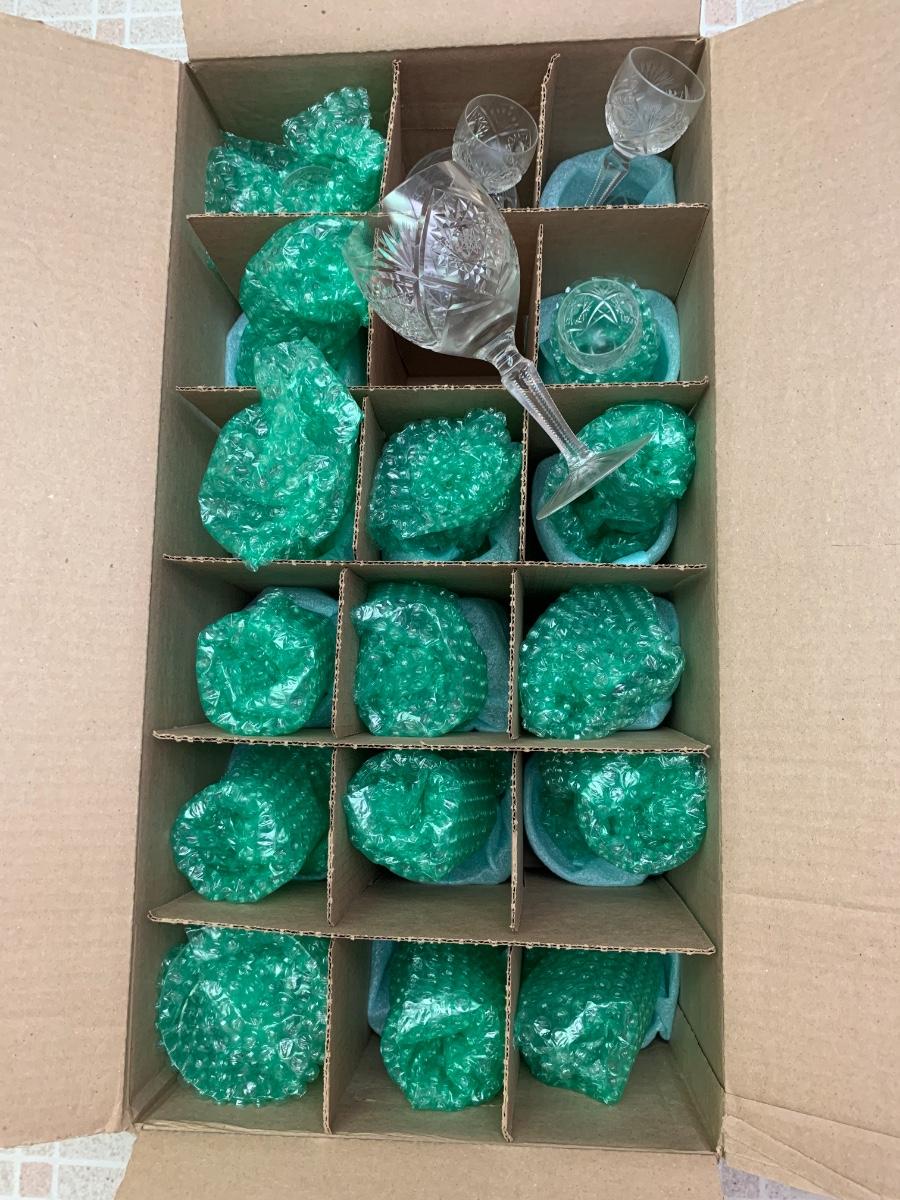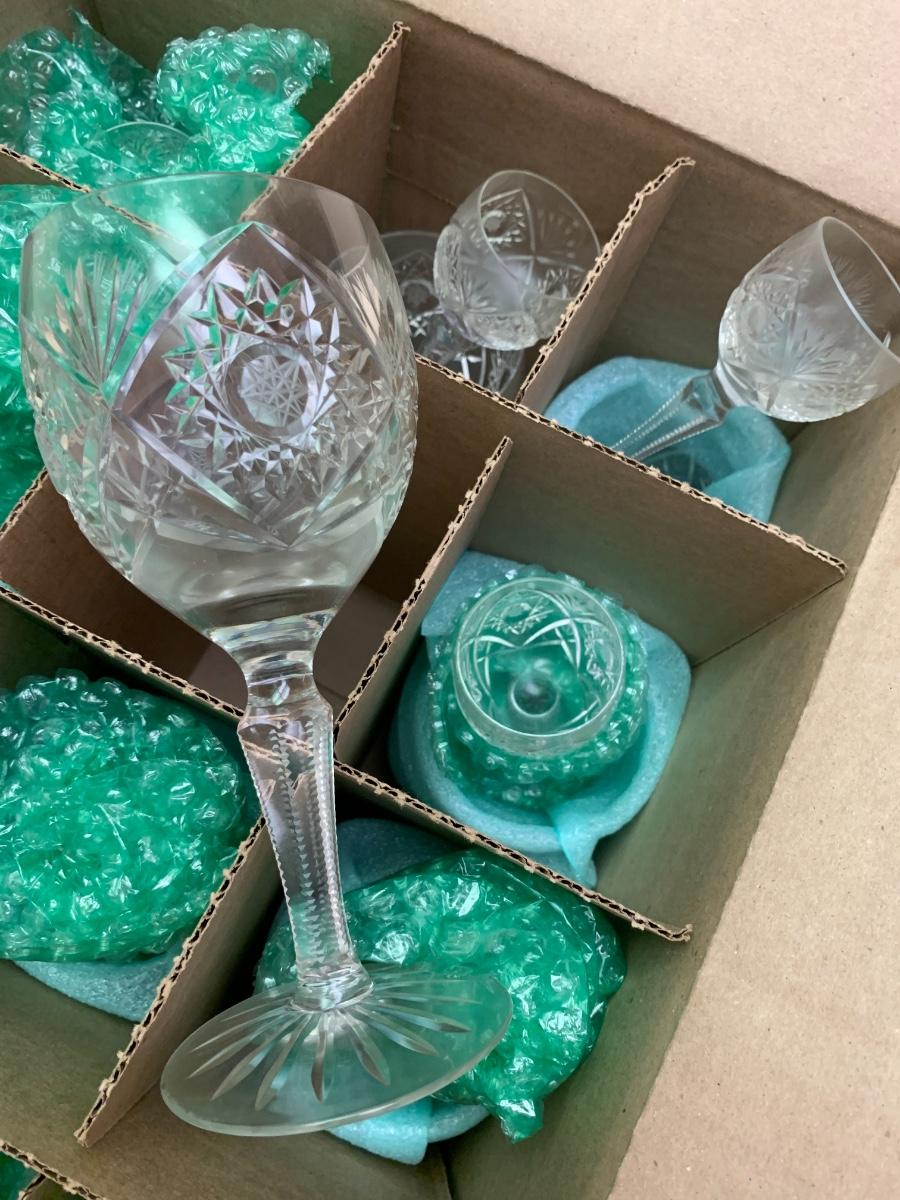 Includes a huge box of etched glass stemware with hobstar pattern. Larger wine glasses and small cordials. In good condition.