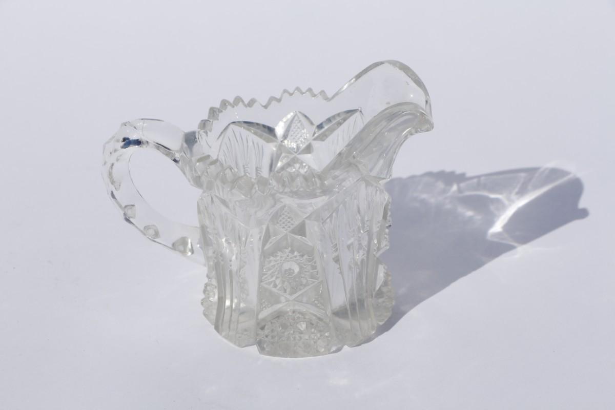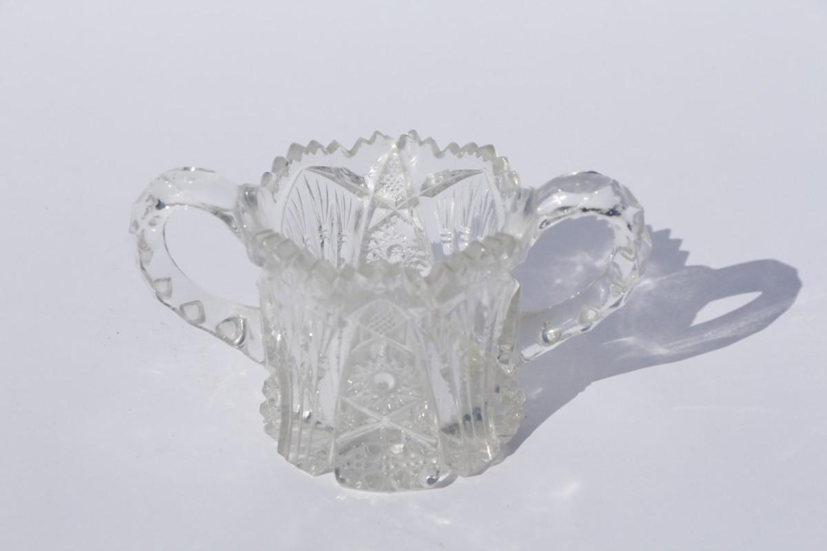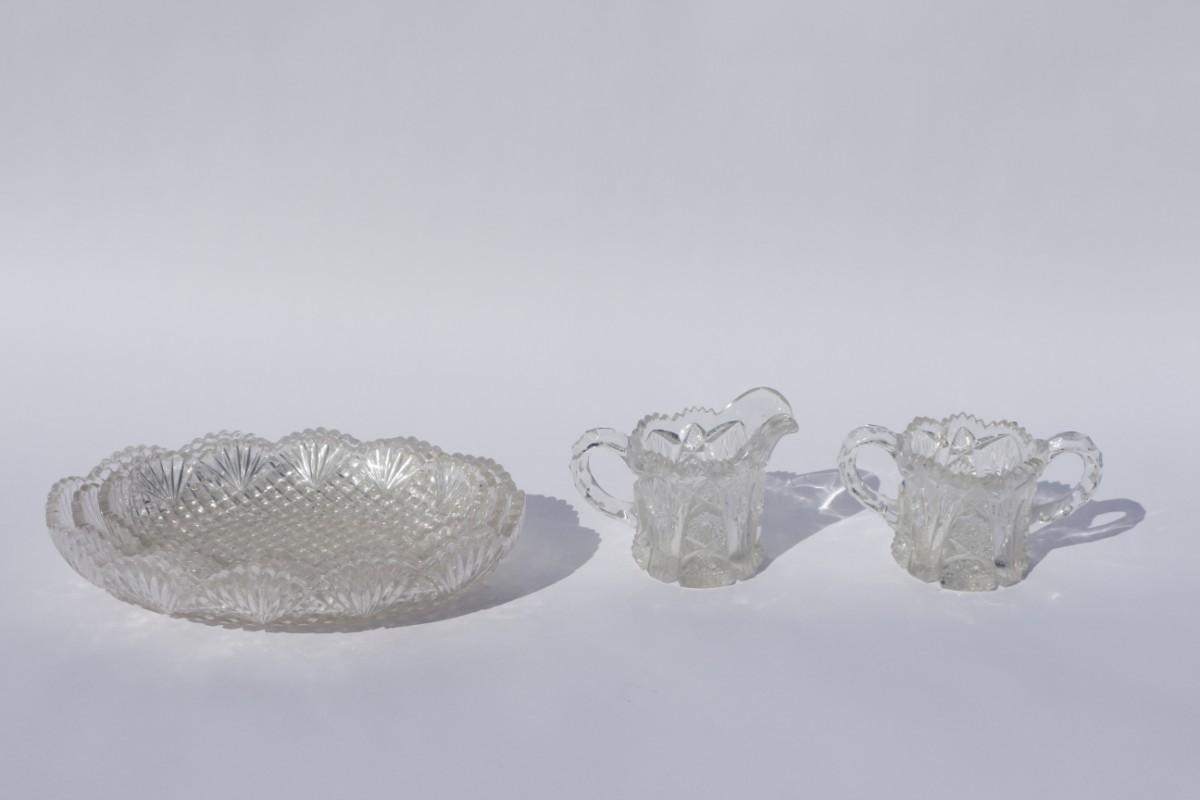 Three relish dishes, one creamer, one sugar bowl. Dishes length ranges 8 to 10 inches and 5.5 to 7 inches wide, 2 inches tall. Creamer and sugar dish are 3 inches tall.