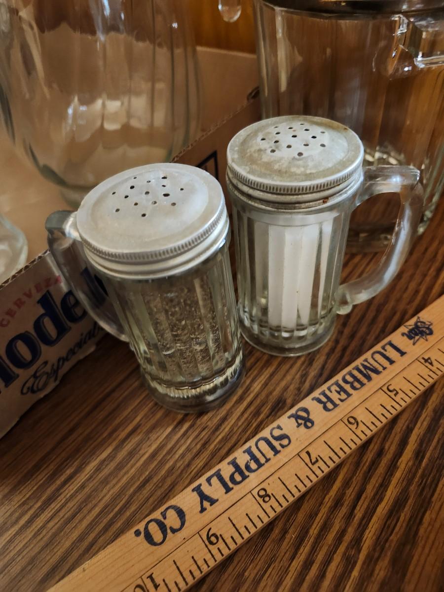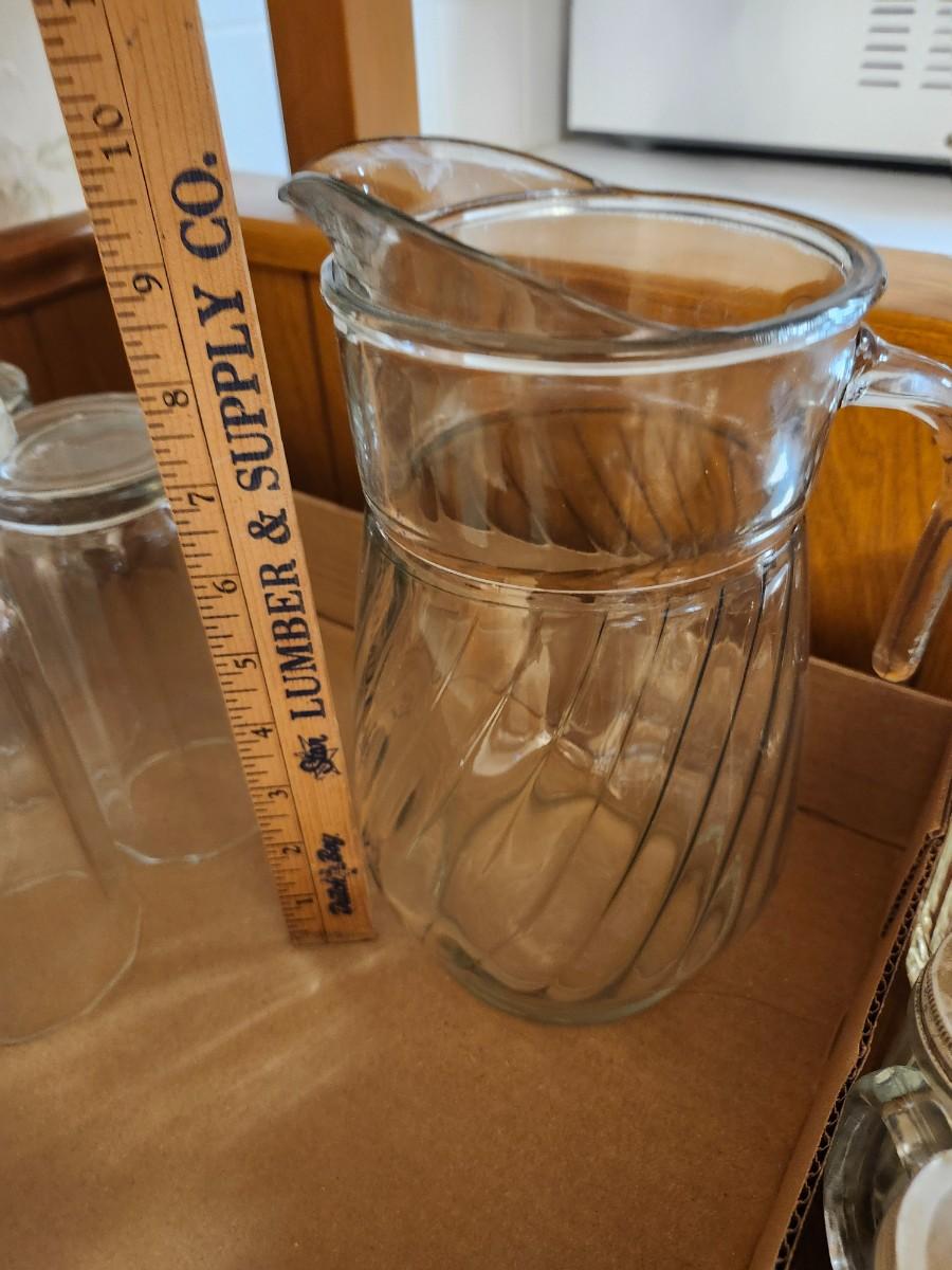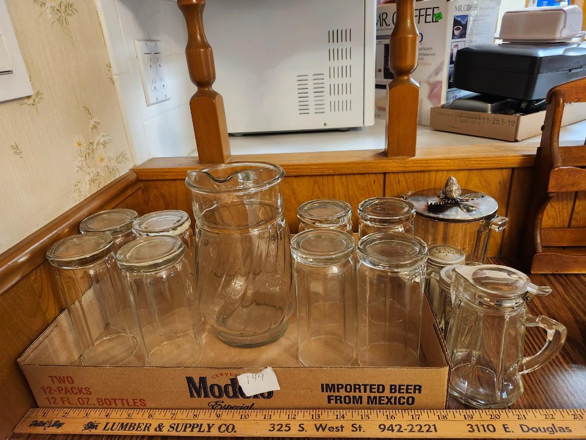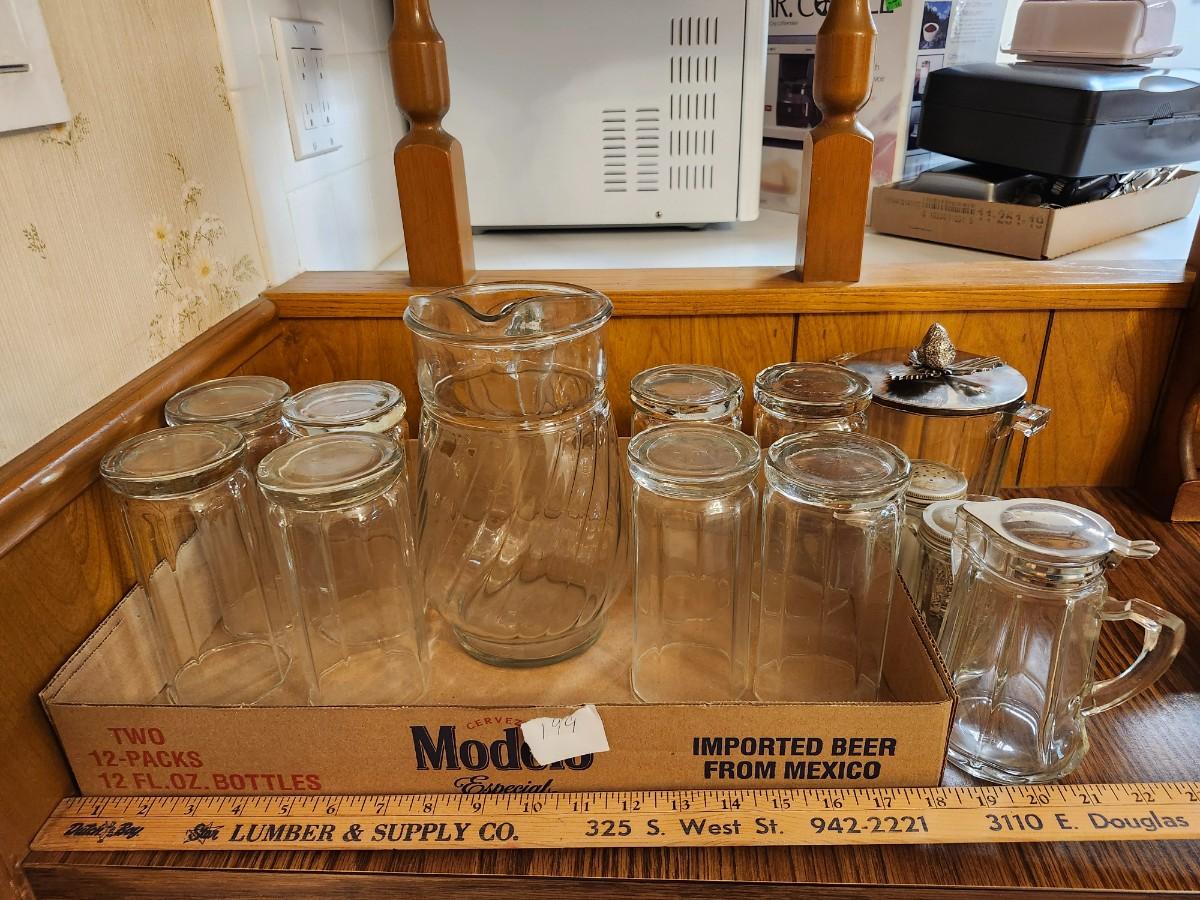 Glassware lot, tumbler, pitcher, Ice bucket, syrup dispenser salt and pepper