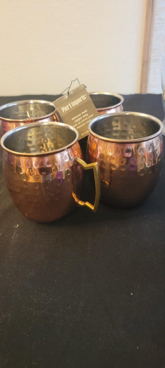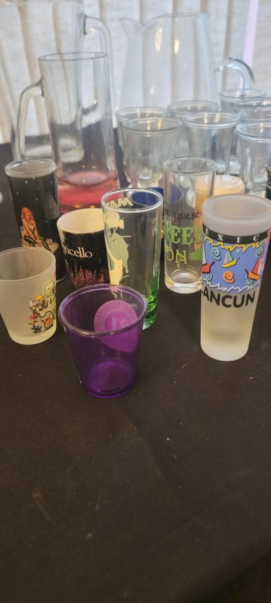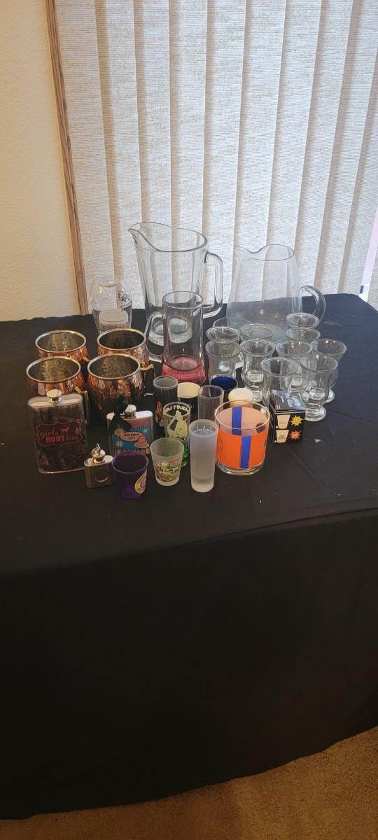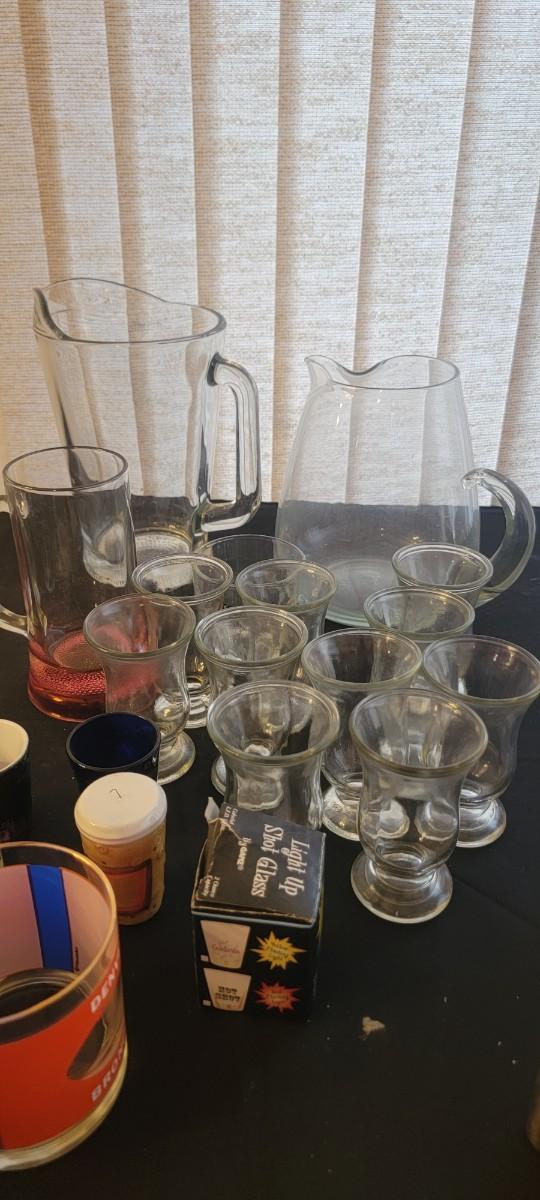 Miscellaneous glassware, shot glasses. Two pitchers, four copper mugs