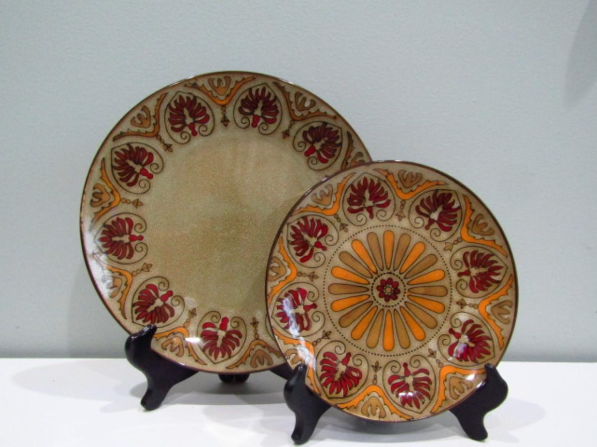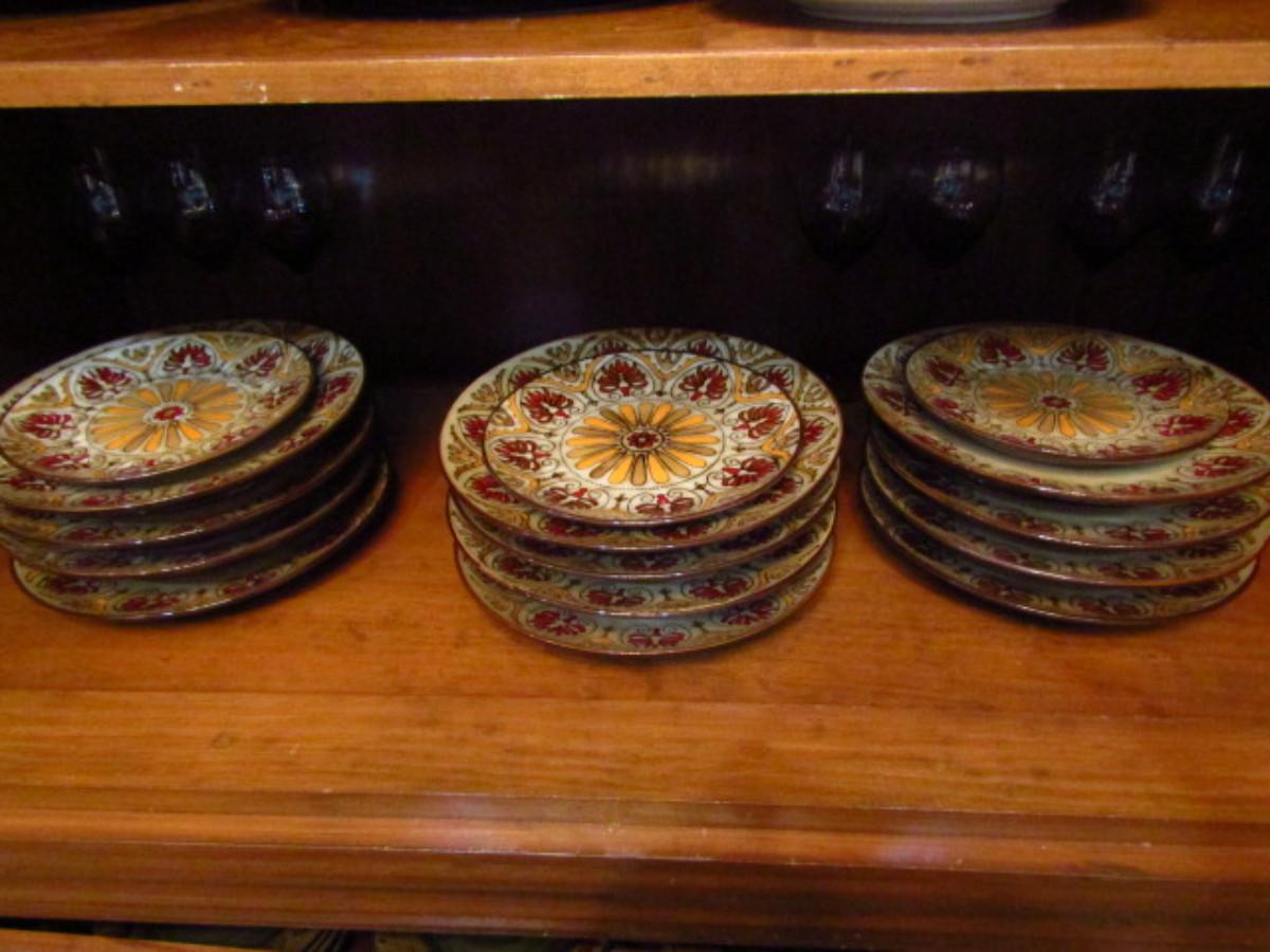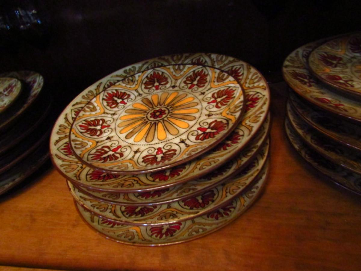 Painted Ceramic Dinnerware from Pier 1 Imports- Myra Pattern (DR). Dinner plates- 12 pcs. Salad plates- 12 pcs. Soup/cereal bowls- 20 pcs. In used condition- may be an occasional chip or cracking. Plate holders not included.