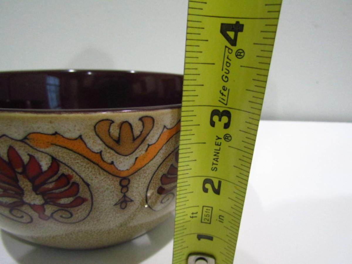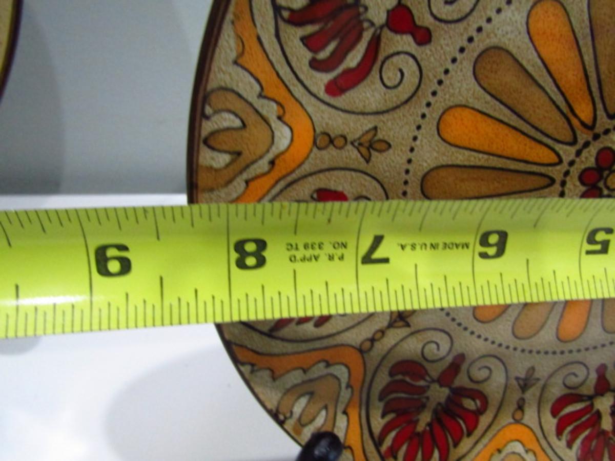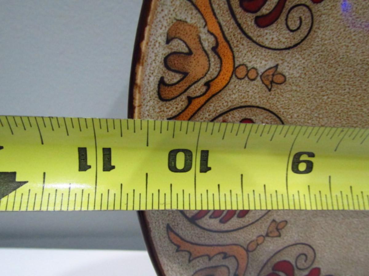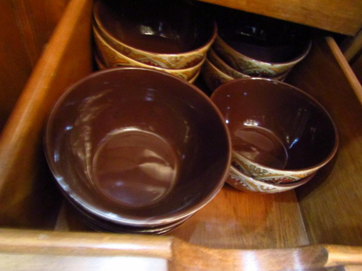 Painted Ceramic Dinnerware from Pier 1 Imports- Myra Pattern (DR). Dinner plates- 12 pcs. Salad plates- 12 pcs. Soup/cereal bowls- 20 pcs. In used condition- may be an occasional chip or cracking. Plate holders not included.
