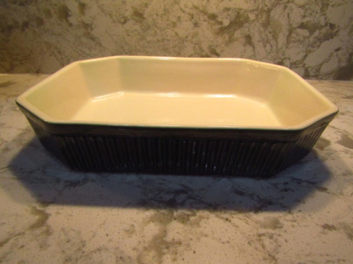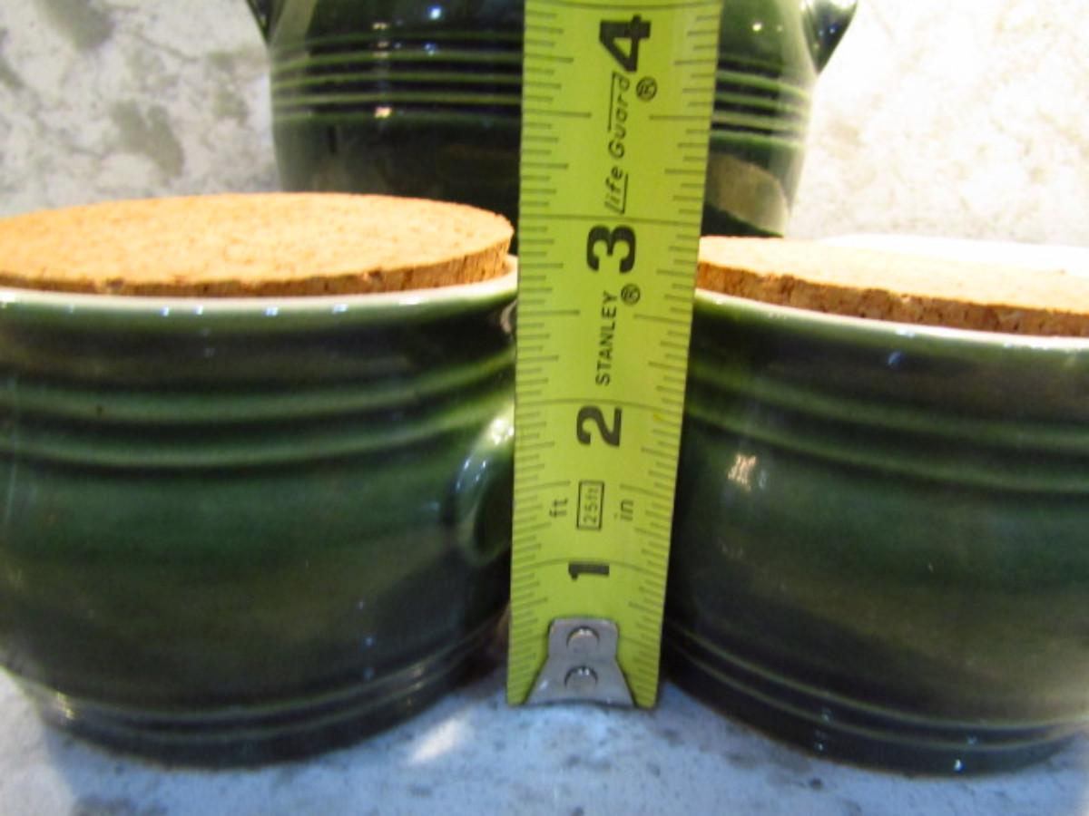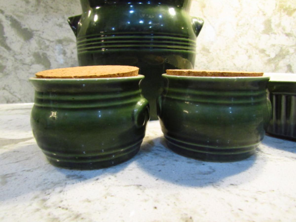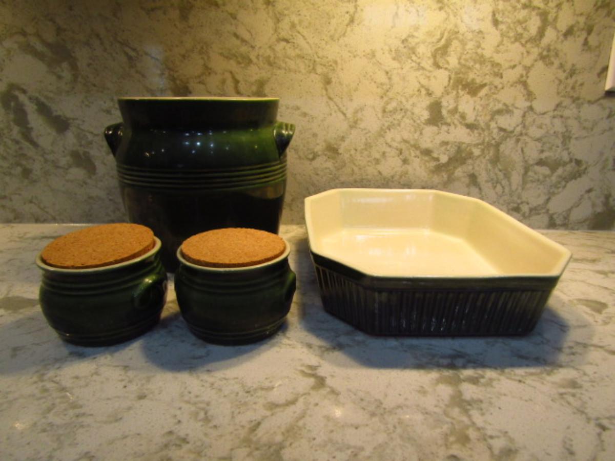 Glazed Ceramic Kitchen Ware (Kitchen). Two spice jars with cork lids. Cookie jar- no lid. Rectangular baking dish- 12" x 9" x 2 1/2".