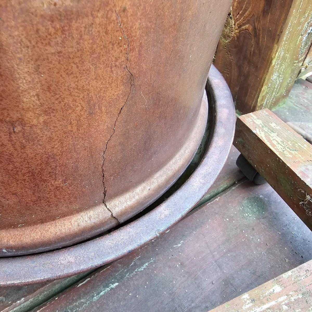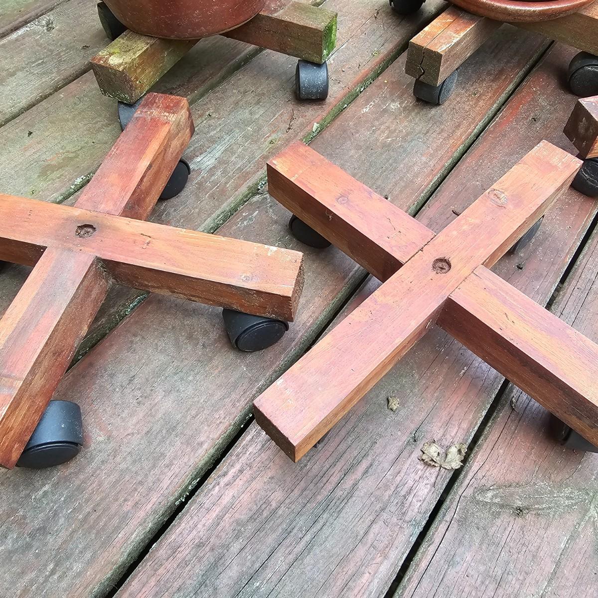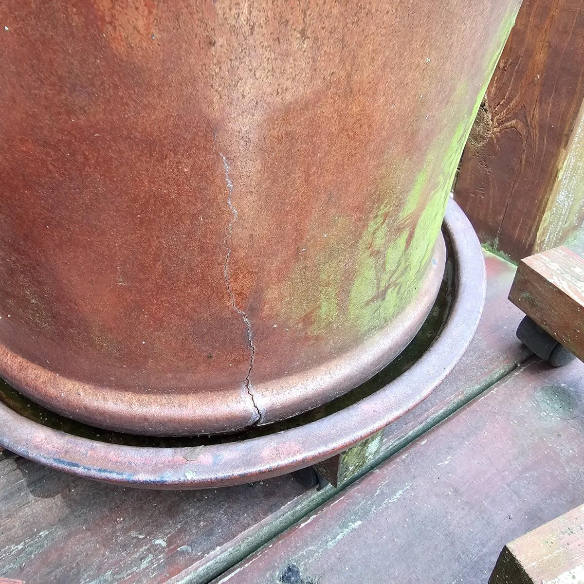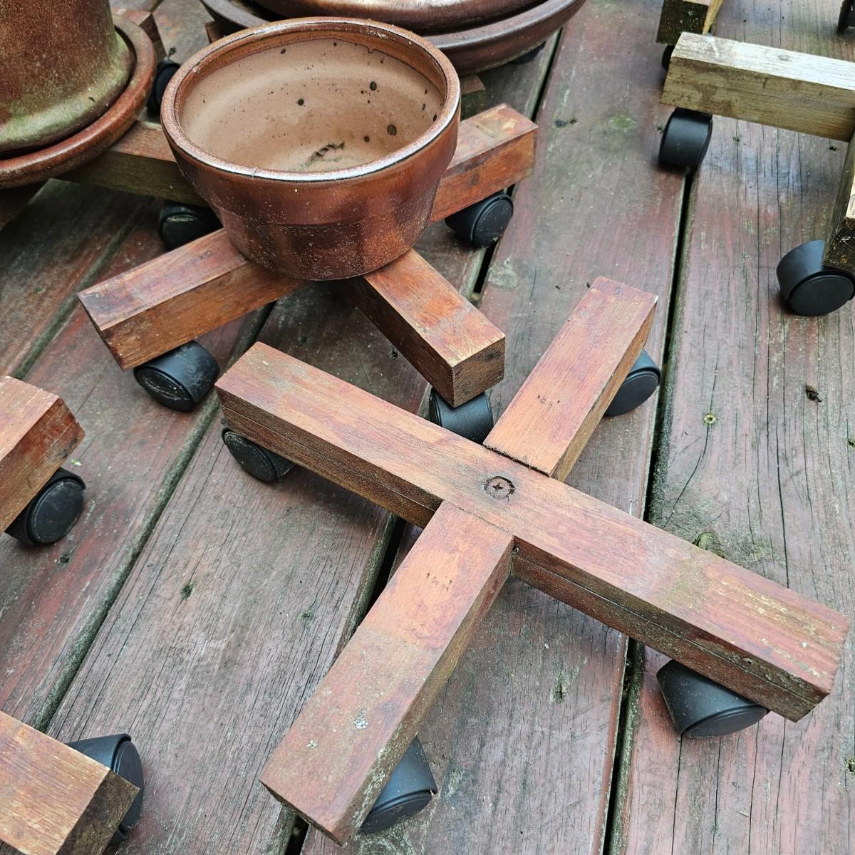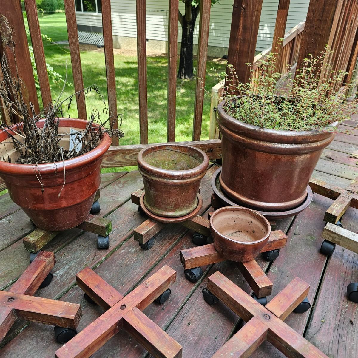 Reddish colored glazed ceramic pots and wooden stands with wheels. Pots and stands used on outside porch. Two of three are terracotta, the other is a bite clay pot. Large pot measures 14.5"D x 12"H, smallest is 6.5" D x 3.5H. Wooden bases are 13" x 13" x 3.5"H. Large pot has two cracks near base. See photos for details. Local pickup only.