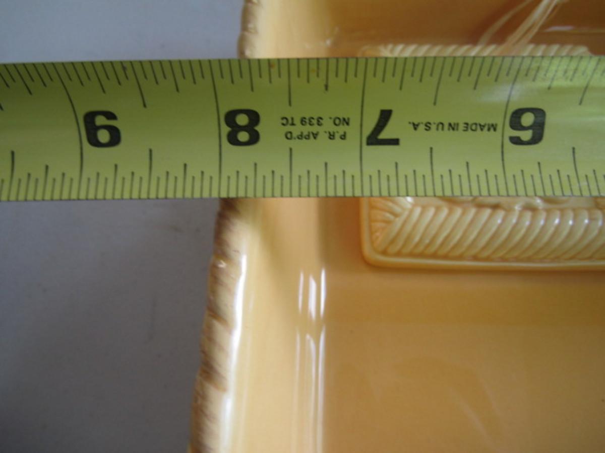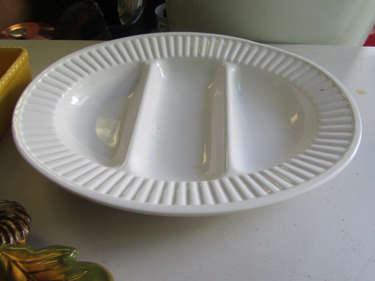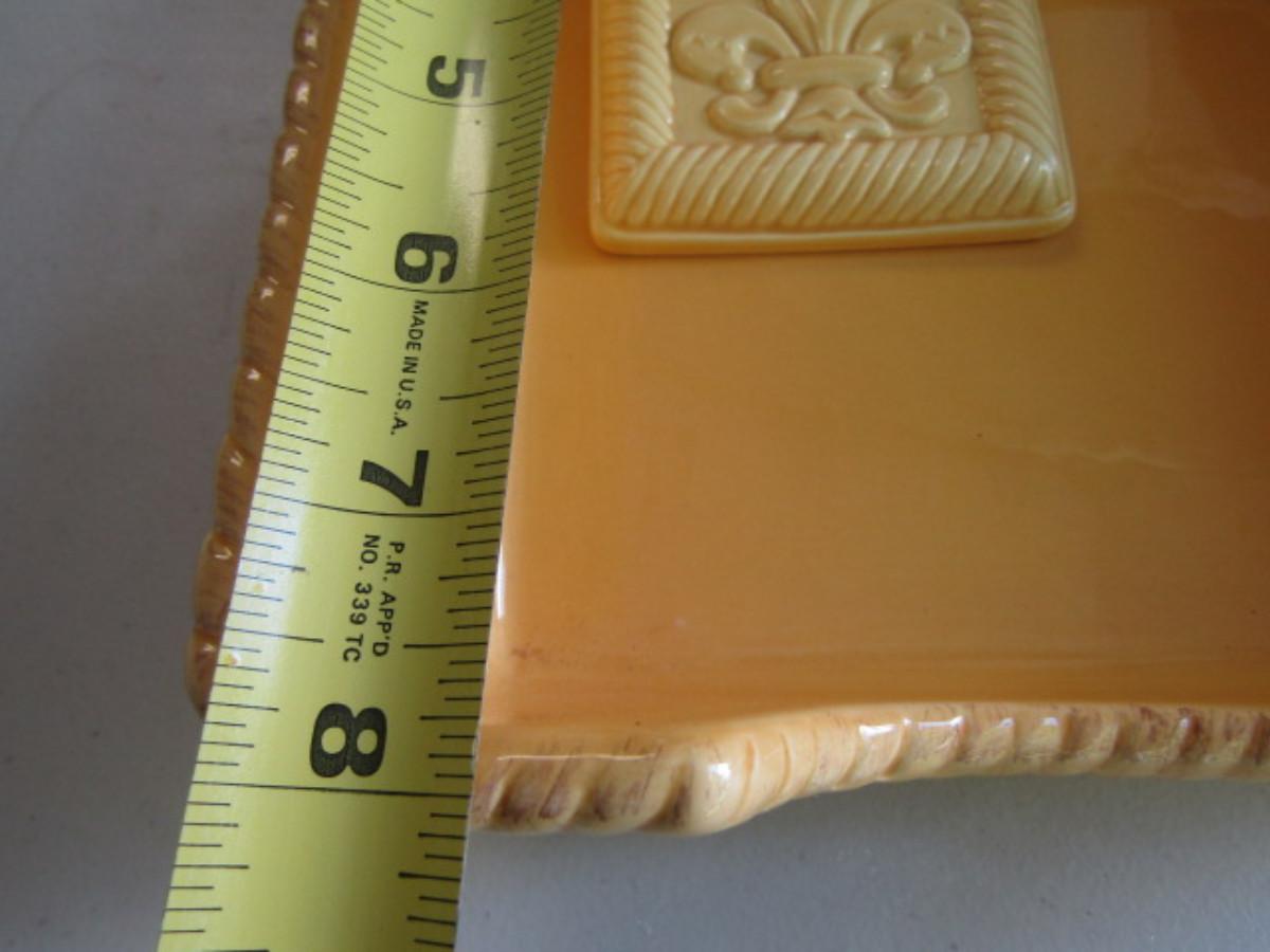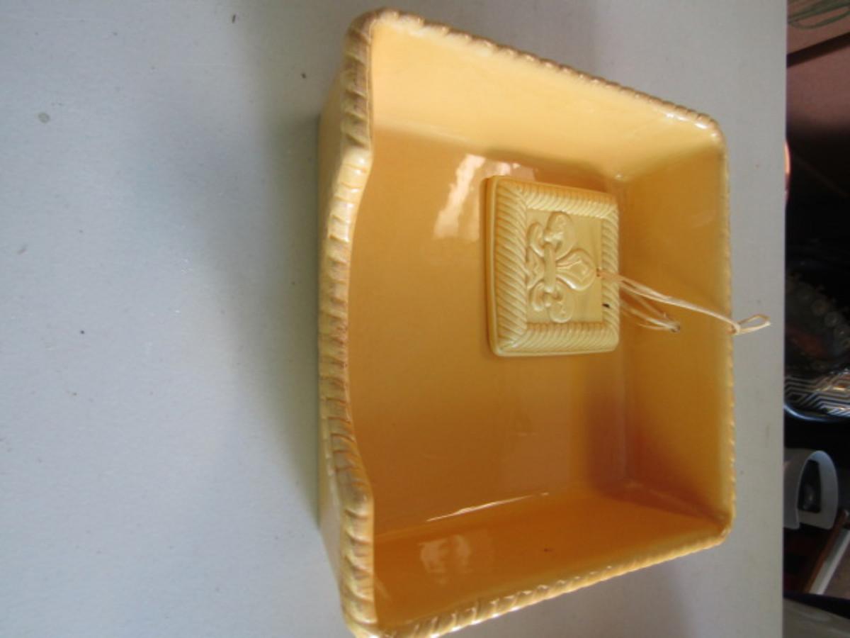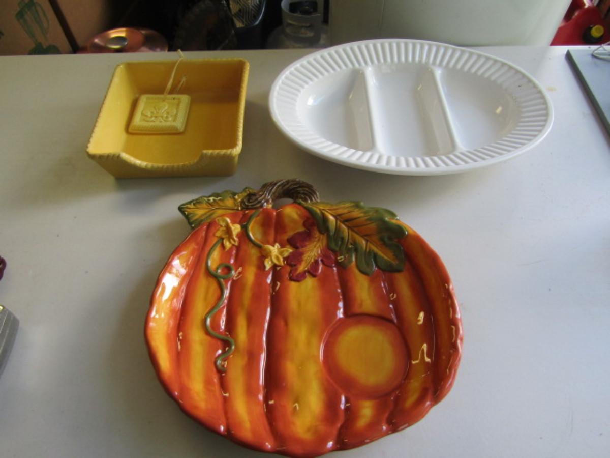 Glazed Ceramic Serving Pieces. Platters are large. Yellow square is a napkin holder with weight.