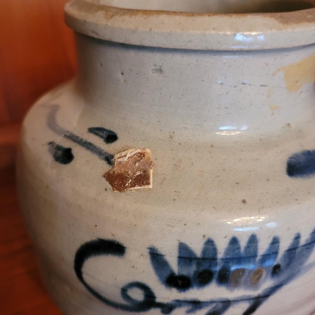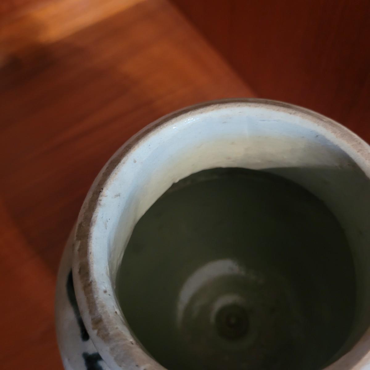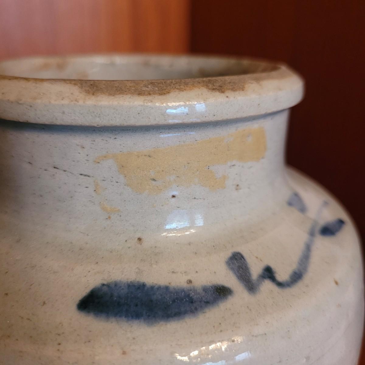 This lovely small water jar has whimsical blue painting. Some sticker residue left on, appears to be able to be removed with gentle cleaning (see photos). Note in jar was not verified for accuracy. Measures approximately 4”D at mouth x 8”H. Shipping available.
