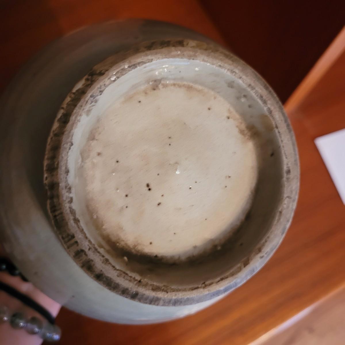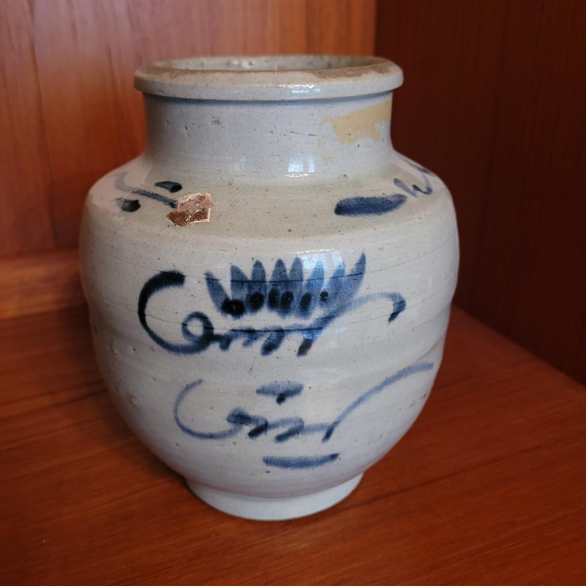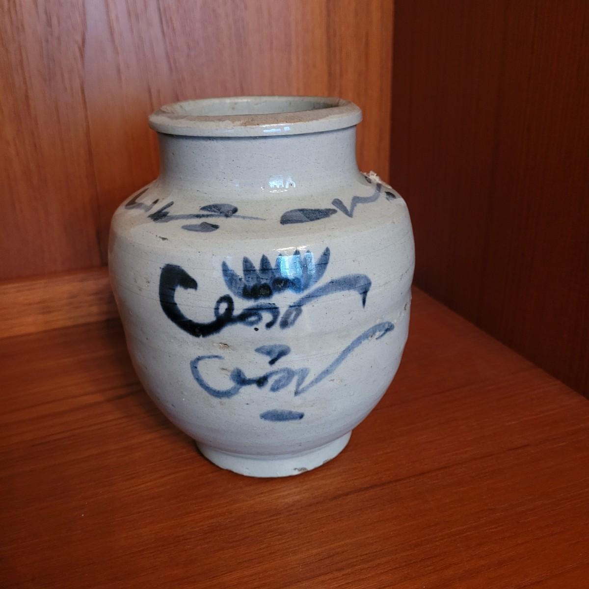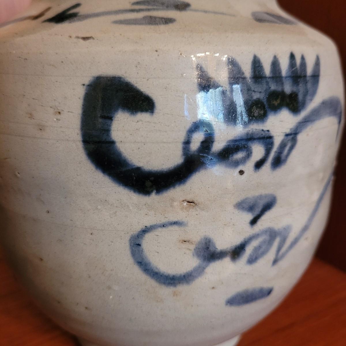 This lovely small water jar has whimsical blue painting. Some sticker residue left on, appears to be able to be removed with gentle cleaning (see photos). Note in jar was not verified for accuracy. Measures approximately 4”D at mouth x 8”H. Shipping available.