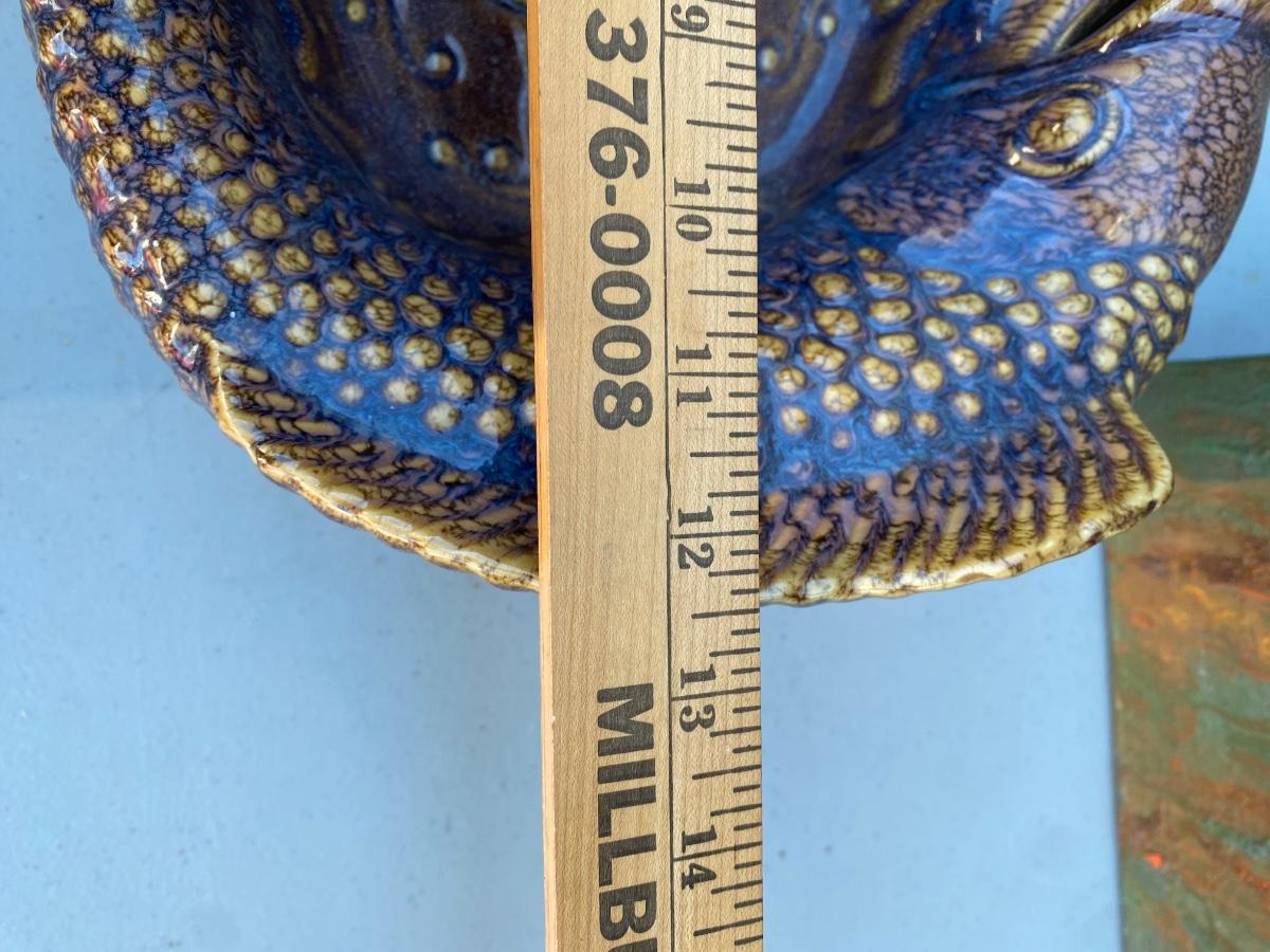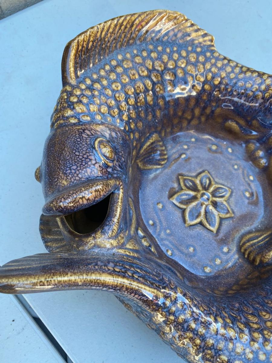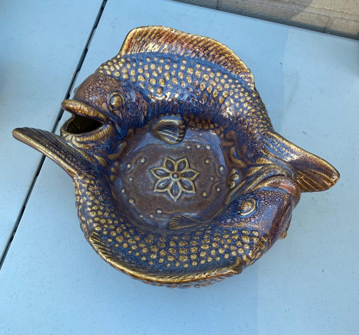 This glazed double fish 'bowl' has a unique shape and pattern. Can be used as a bowl for non'edible items or simply enjoyed as is.