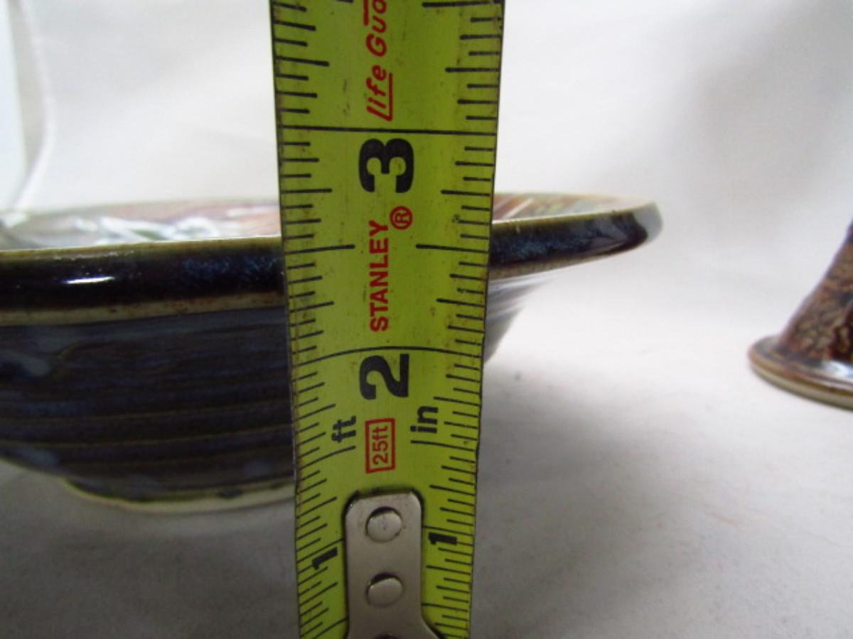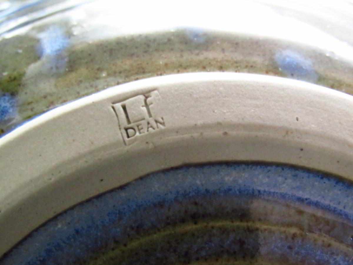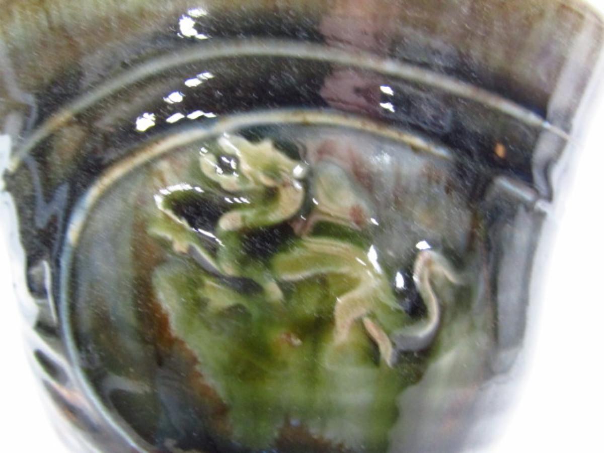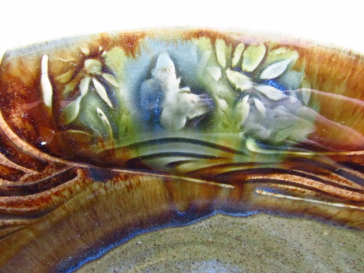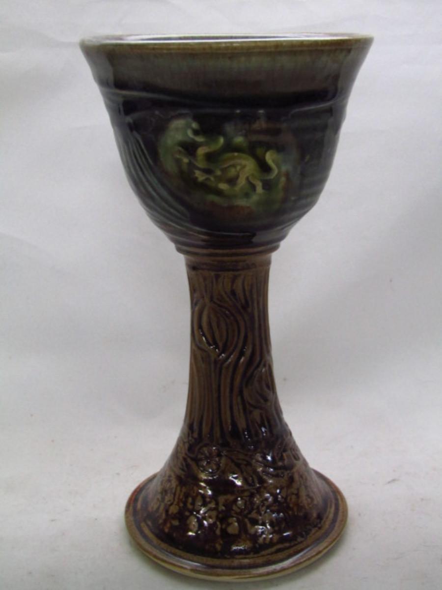Glazed Hand Made Bowl and Goblet from Hazelwood Pottery- Waynesville, NC by Laurey Faye Dean. Each piece is stamped. The bowl measures approx 9" in diameter and features butterflies and dragonflies. The goblet features dragons.