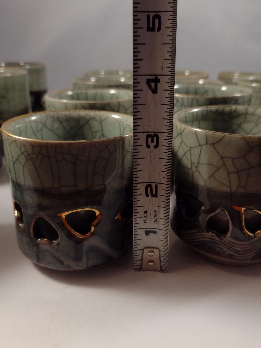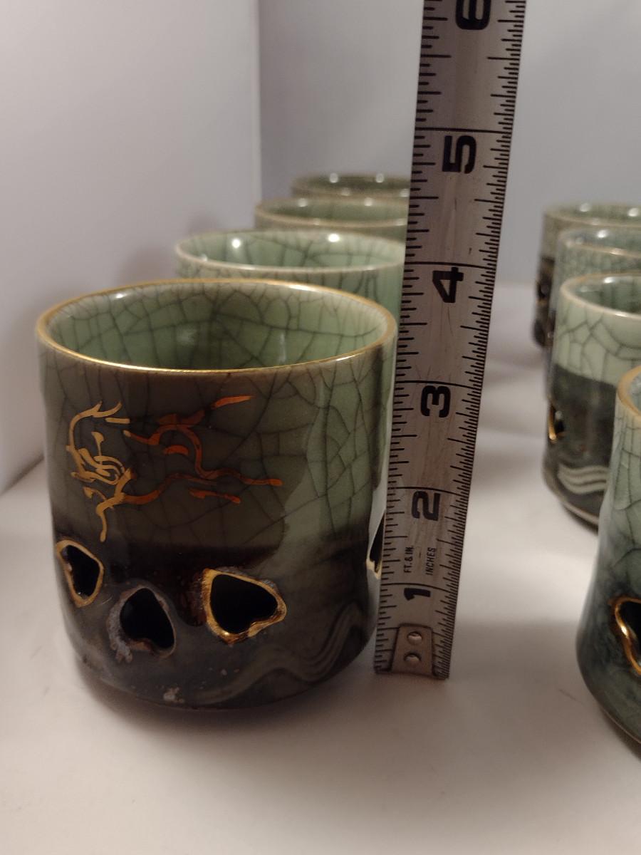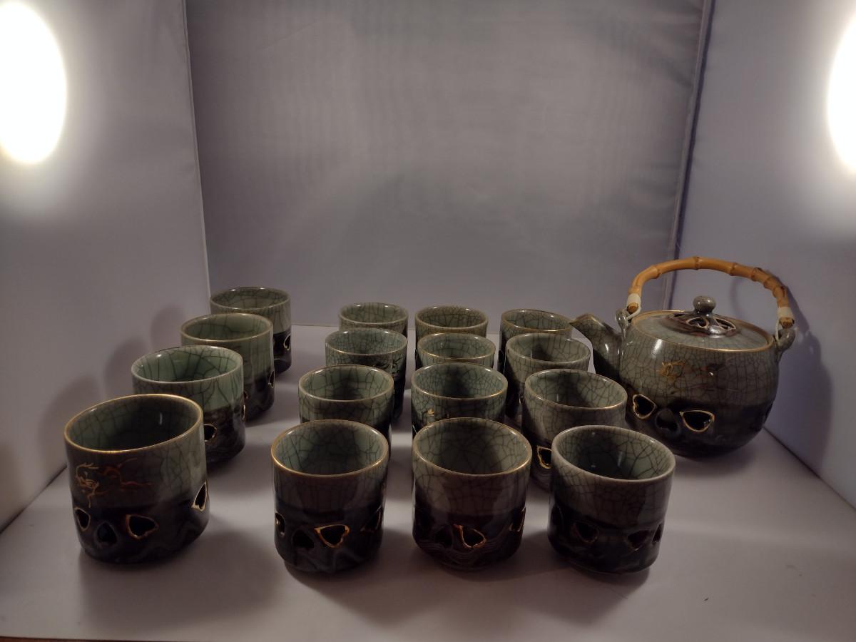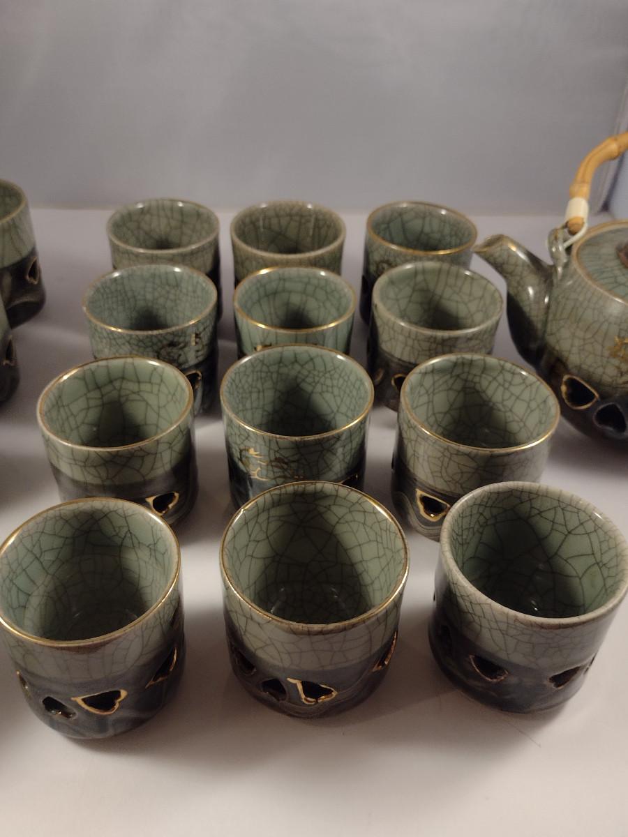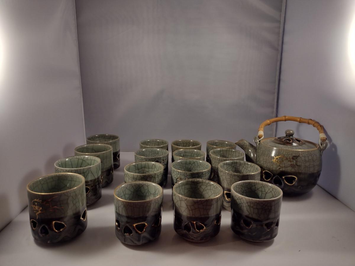 Glazed Japanese Ceramic Tea Pot with Cups. Cups (16 pieces) are two sizes and have reticulated exterior design.