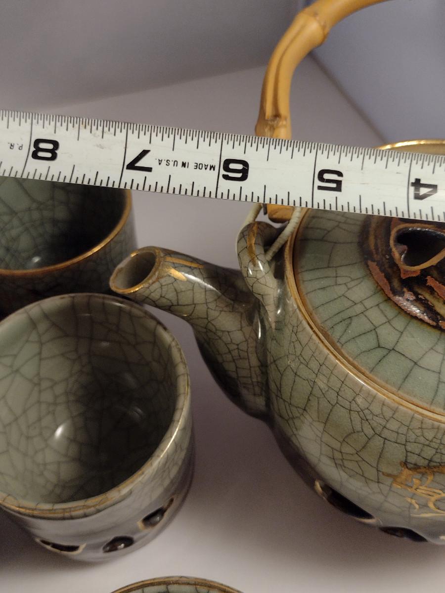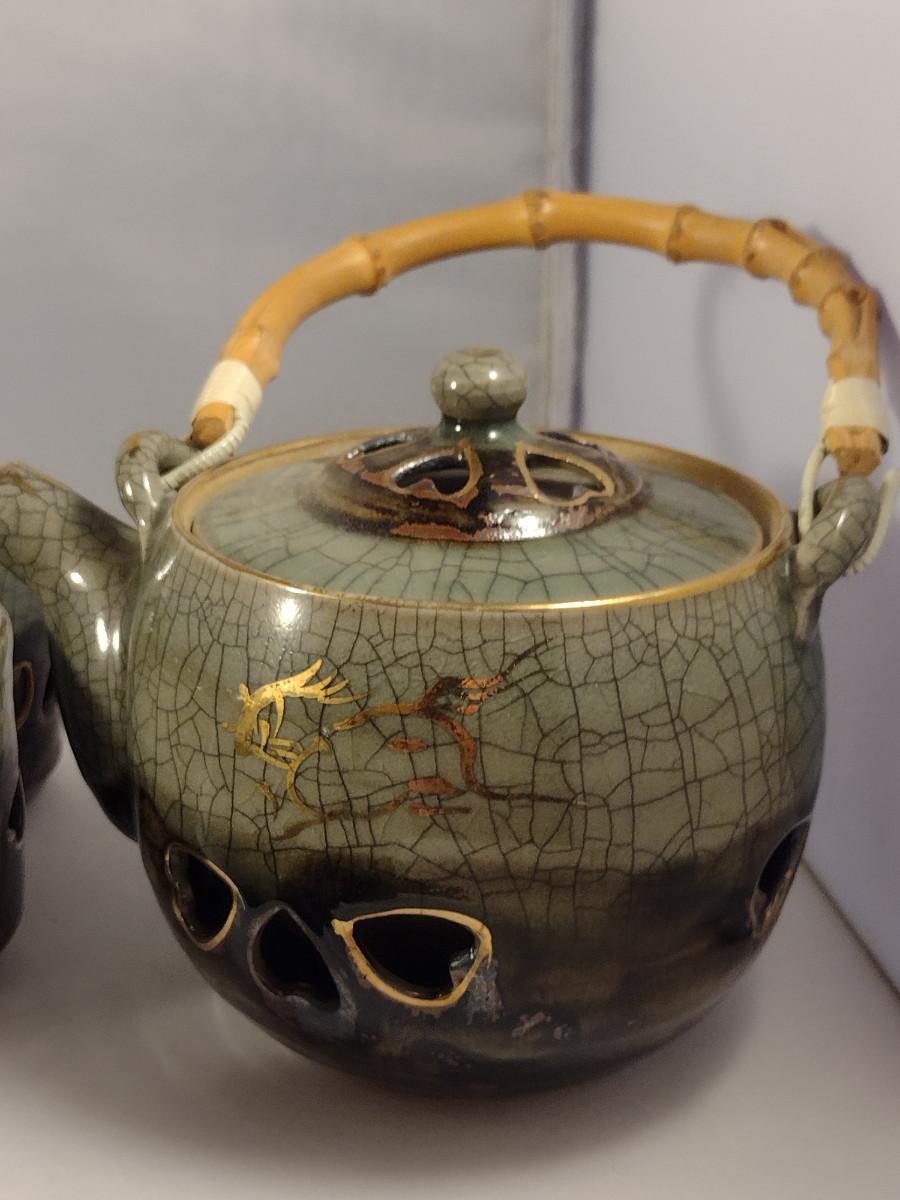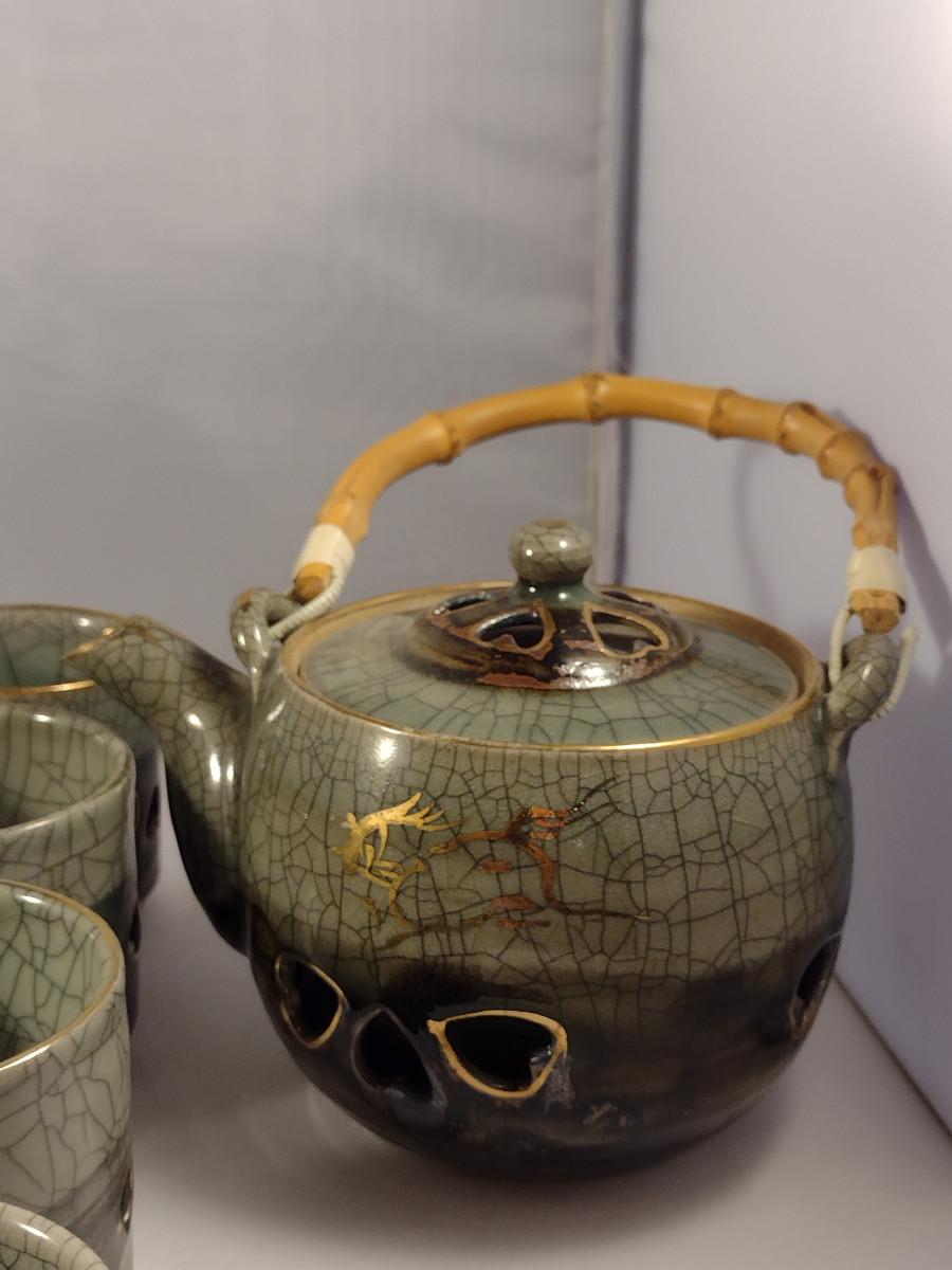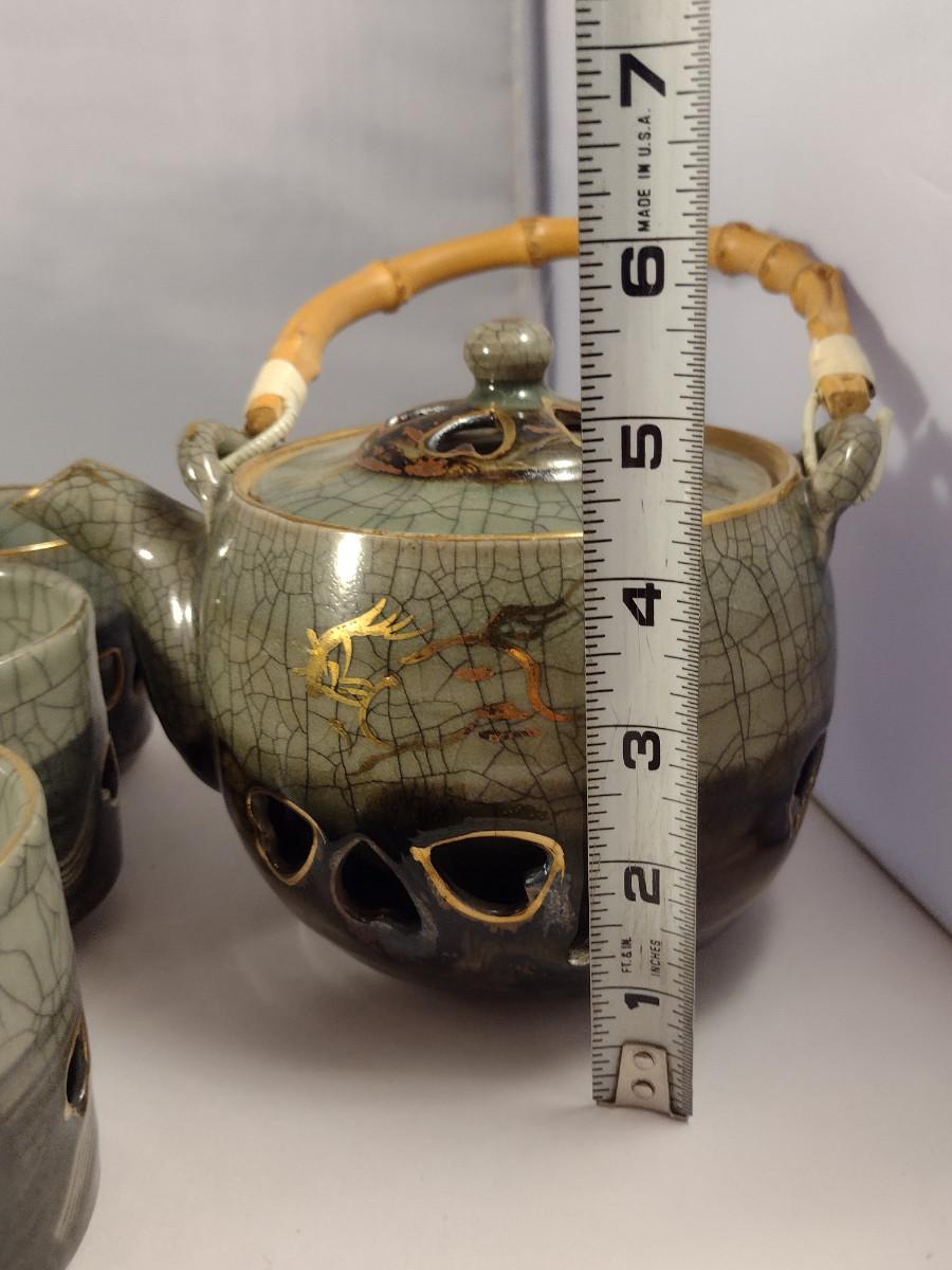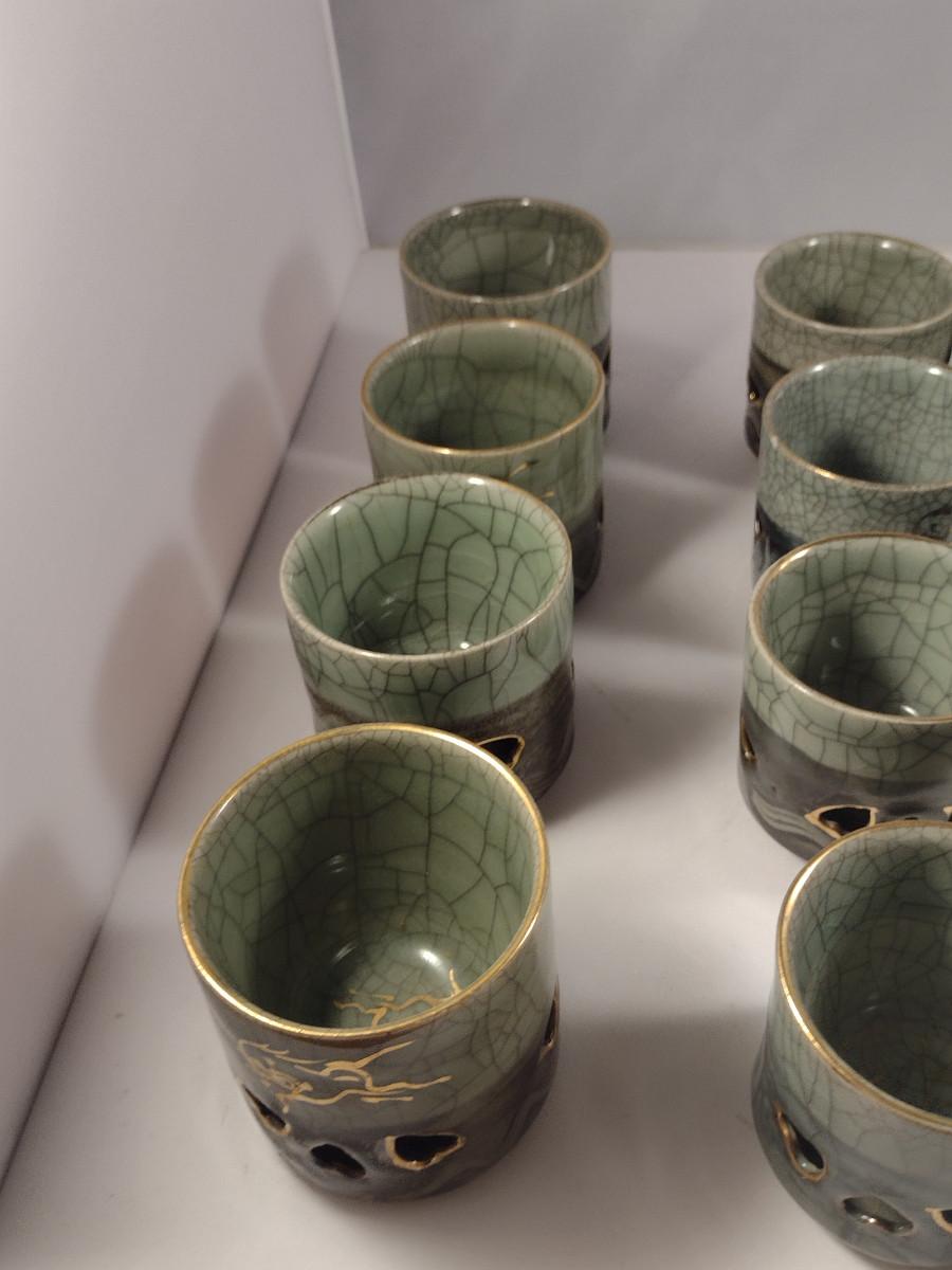 Glazed Japanese Ceramic Tea Pot with Cups. Cups (16 pieces) are two sizes and have reticulated exterior design.