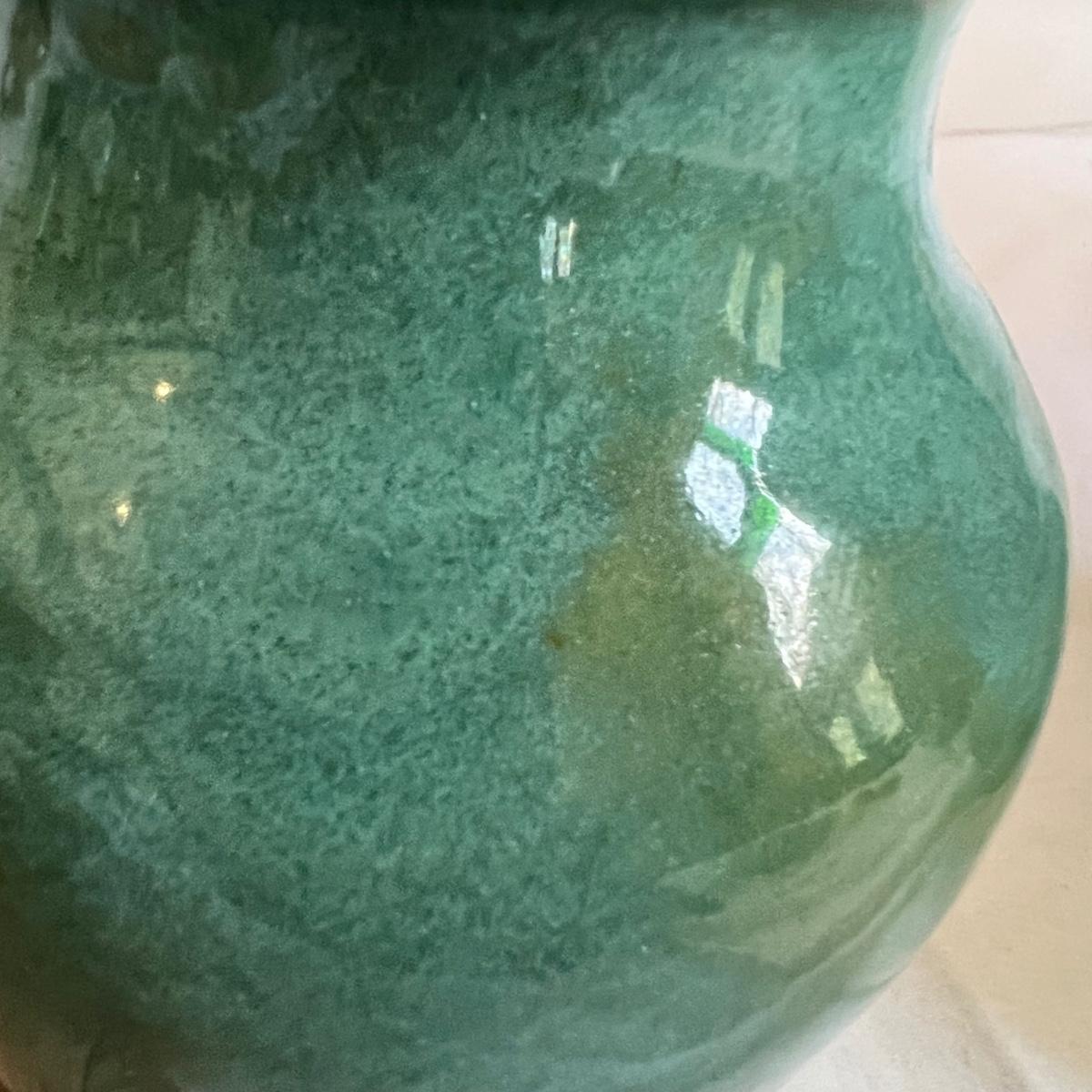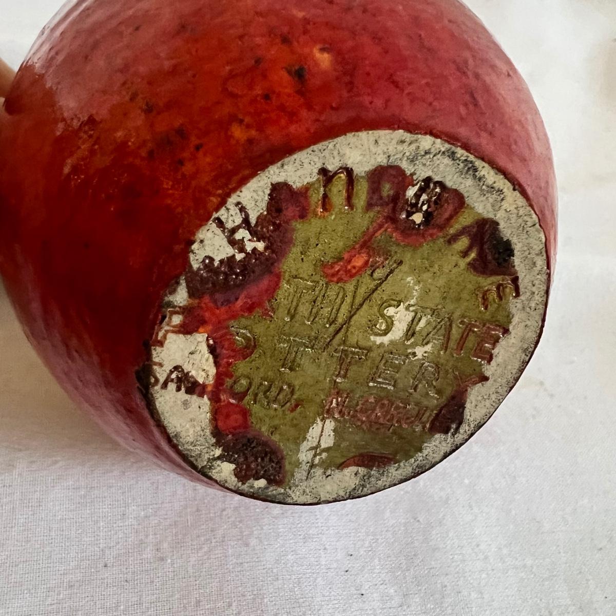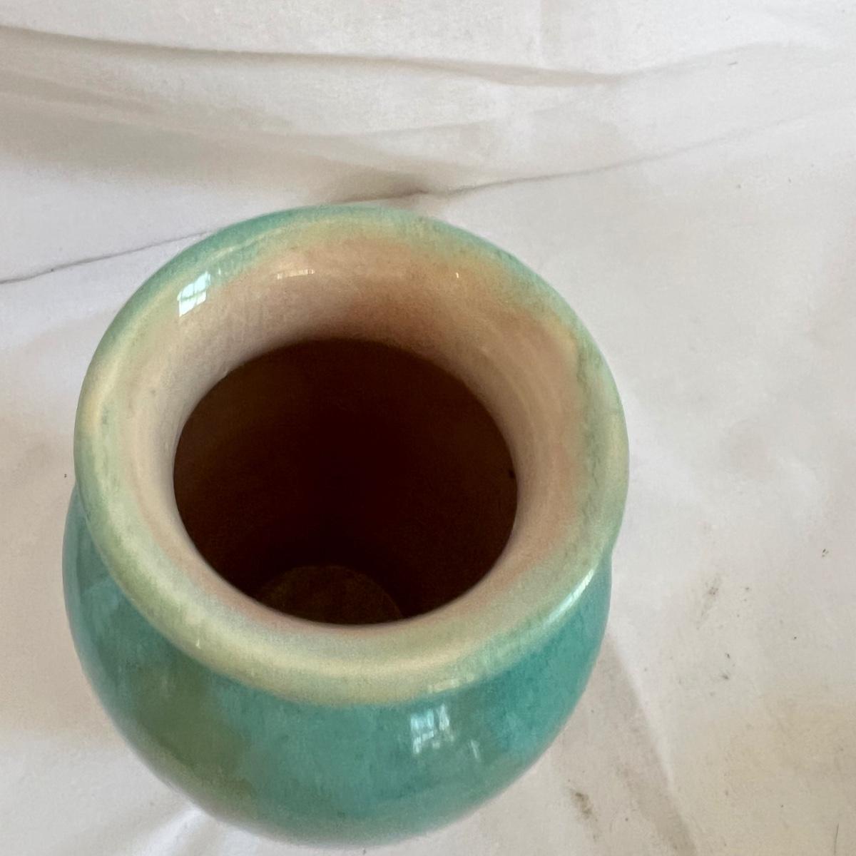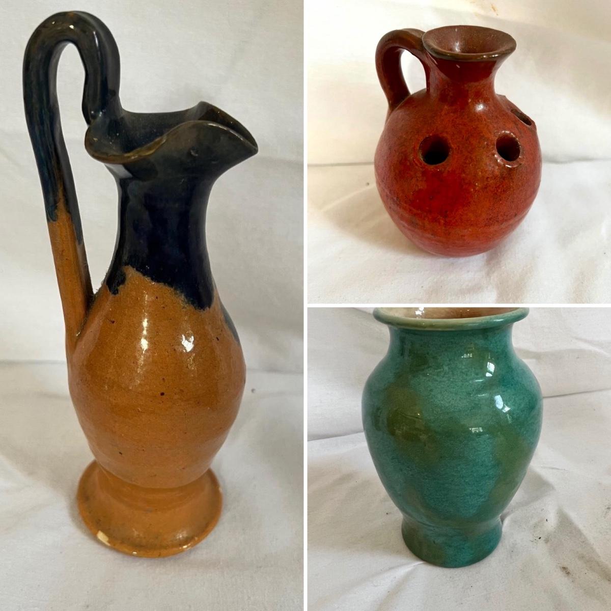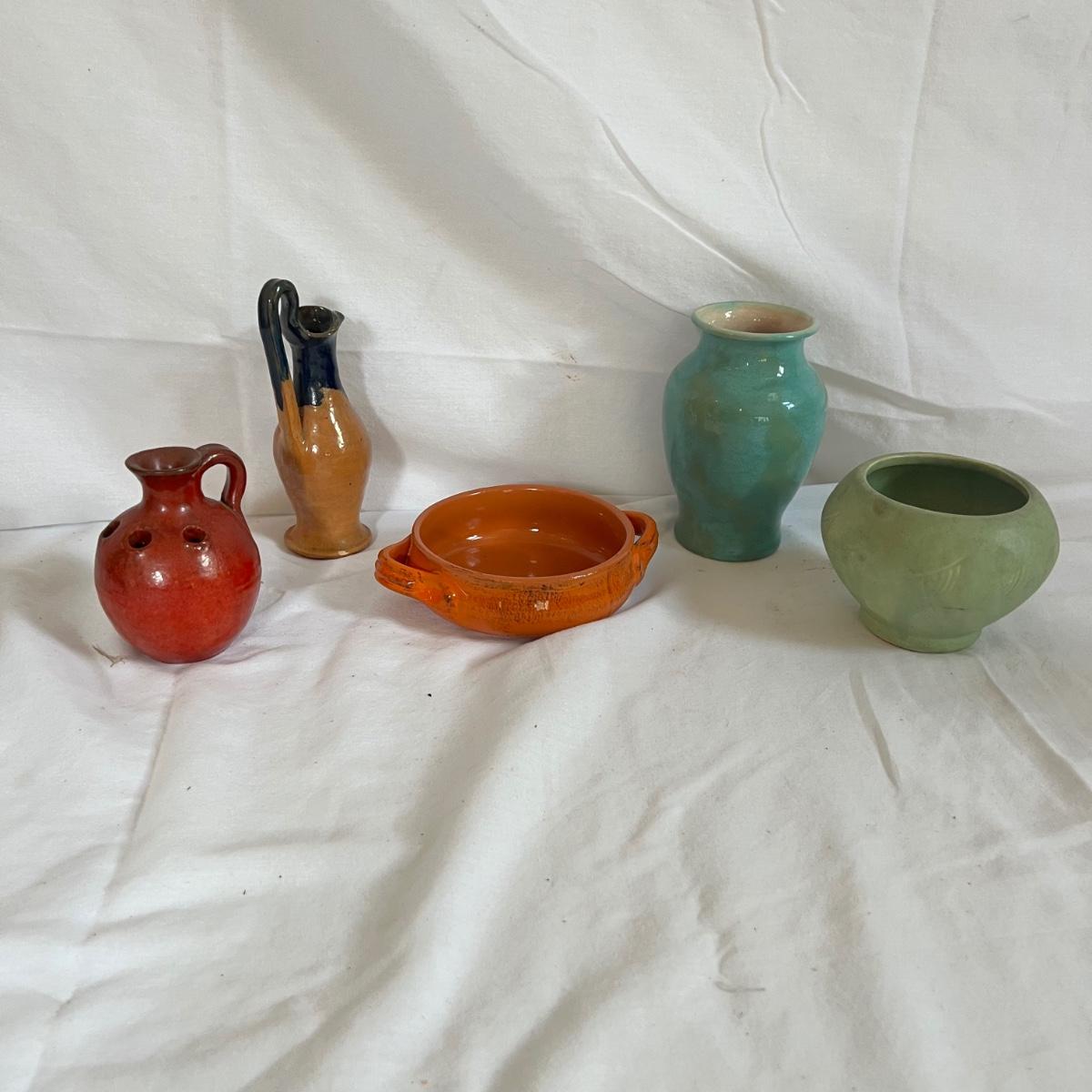 Five lovely pieces of glazed pottery includes pottery pieces from much loved local pottery makers Pisgah Forest and North state; each very unique. The pale blue and green Pisgah Pottery vase measures approximately 4”D x 7”D and the pale green vase measures approximately 6”D x 5”H. The rough glazed orange bowl with two handles measures 5.25”D x 2”H and is ideal for nuts or candy. The small red handmade by North State Pottery vase with four flower bud holes measures approximately 3.5”D x 3.75”H and the tall teal blue and almond colored glazed jar also handmade by North State Pottery measures approximately 3”D x 7.25”H.