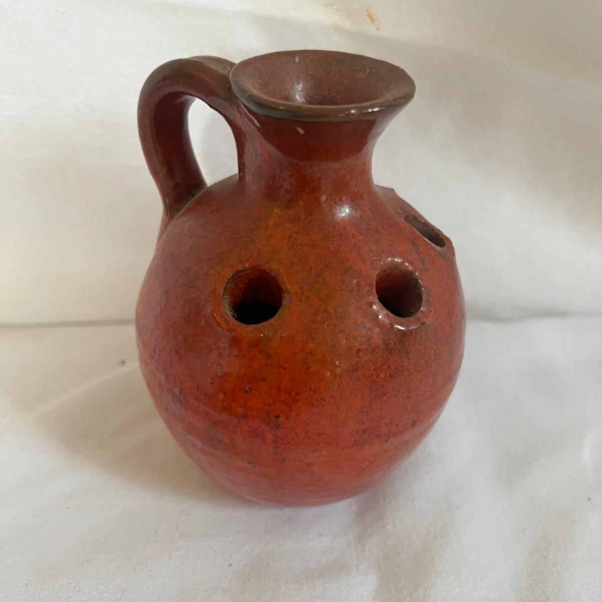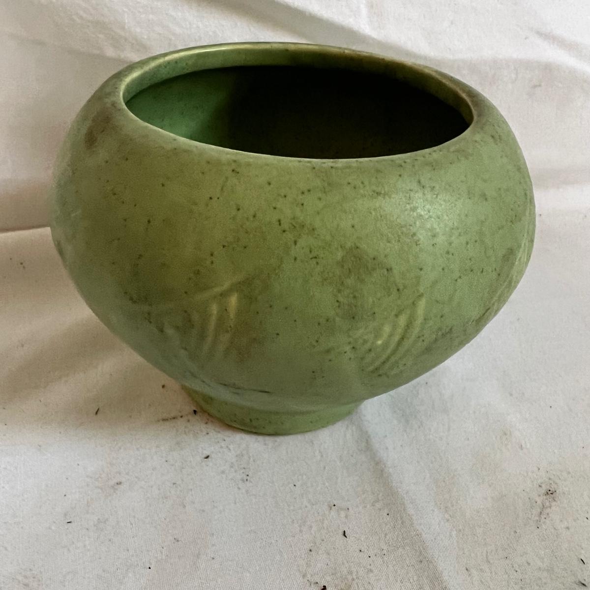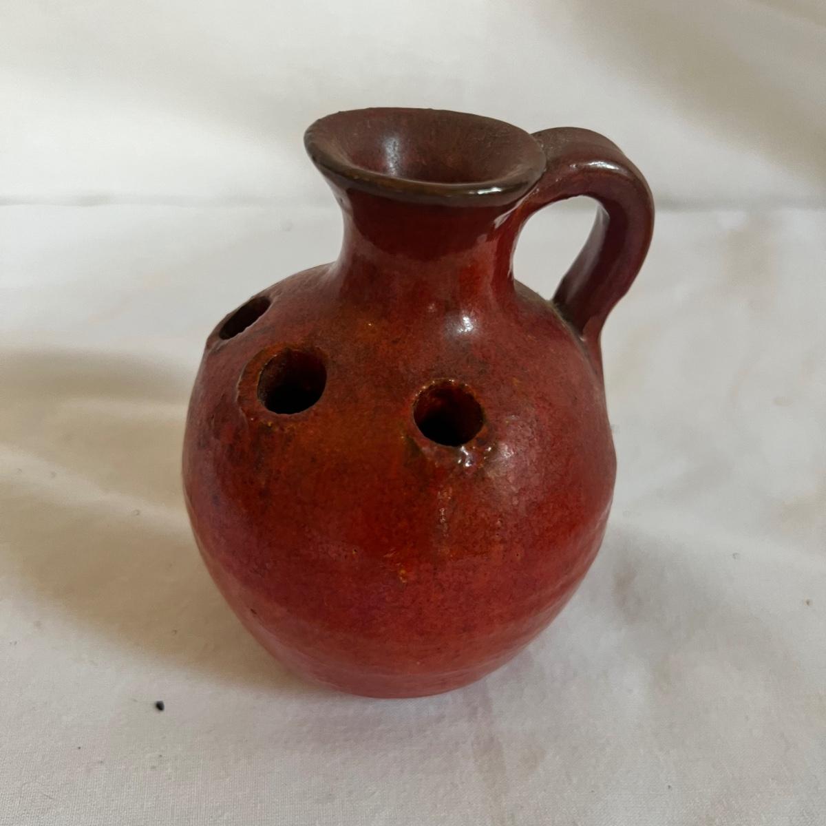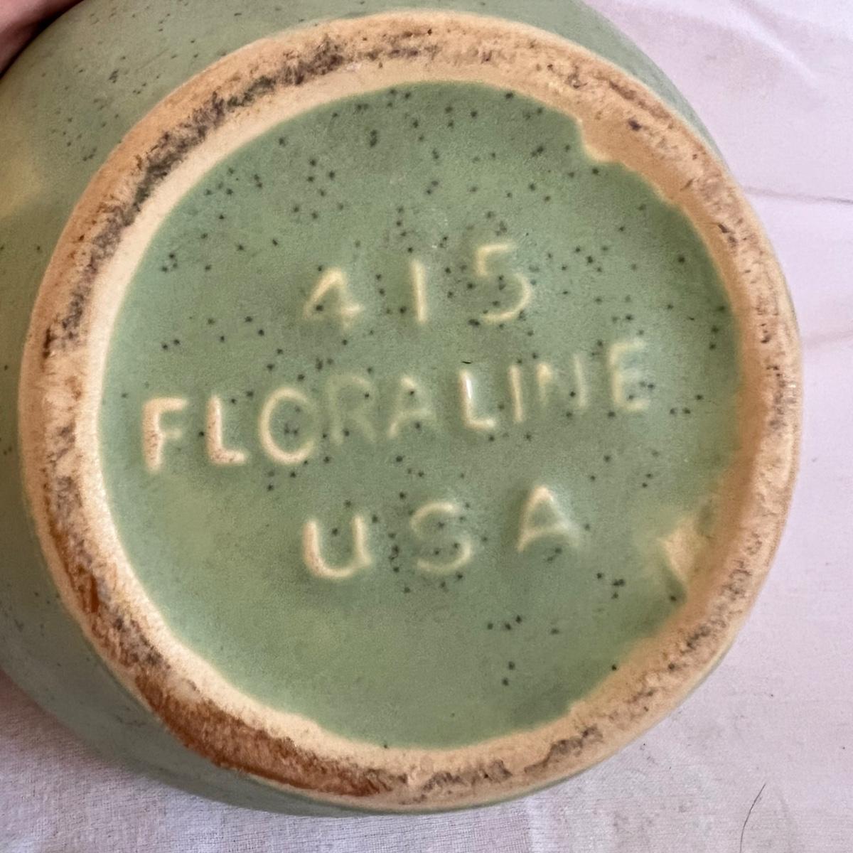 Five lovely pieces of glazed pottery includes pottery pieces from much loved local pottery makers Pisgah Forest and North state; each very unique. The pale blue and green Pisgah Pottery vase measures approximately 4”D x 7”D and the pale green vase measures approximately 6”D x 5”H. The rough glazed orange bowl with two handles measures 5.25”D x 2”H and is ideal for nuts or candy. The small red handmade by North State Pottery vase with four flower bud holes measures approximately 3.5”D x 3.75”H and the tall teal blue and almond colored glazed jar also handmade by North State Pottery measures approximately 3”D x 7.25”H.