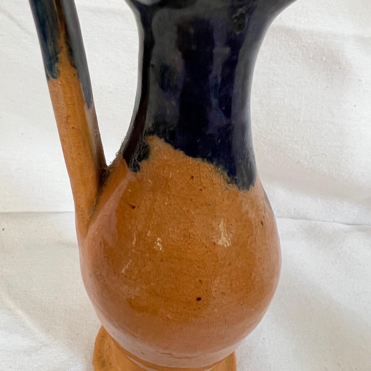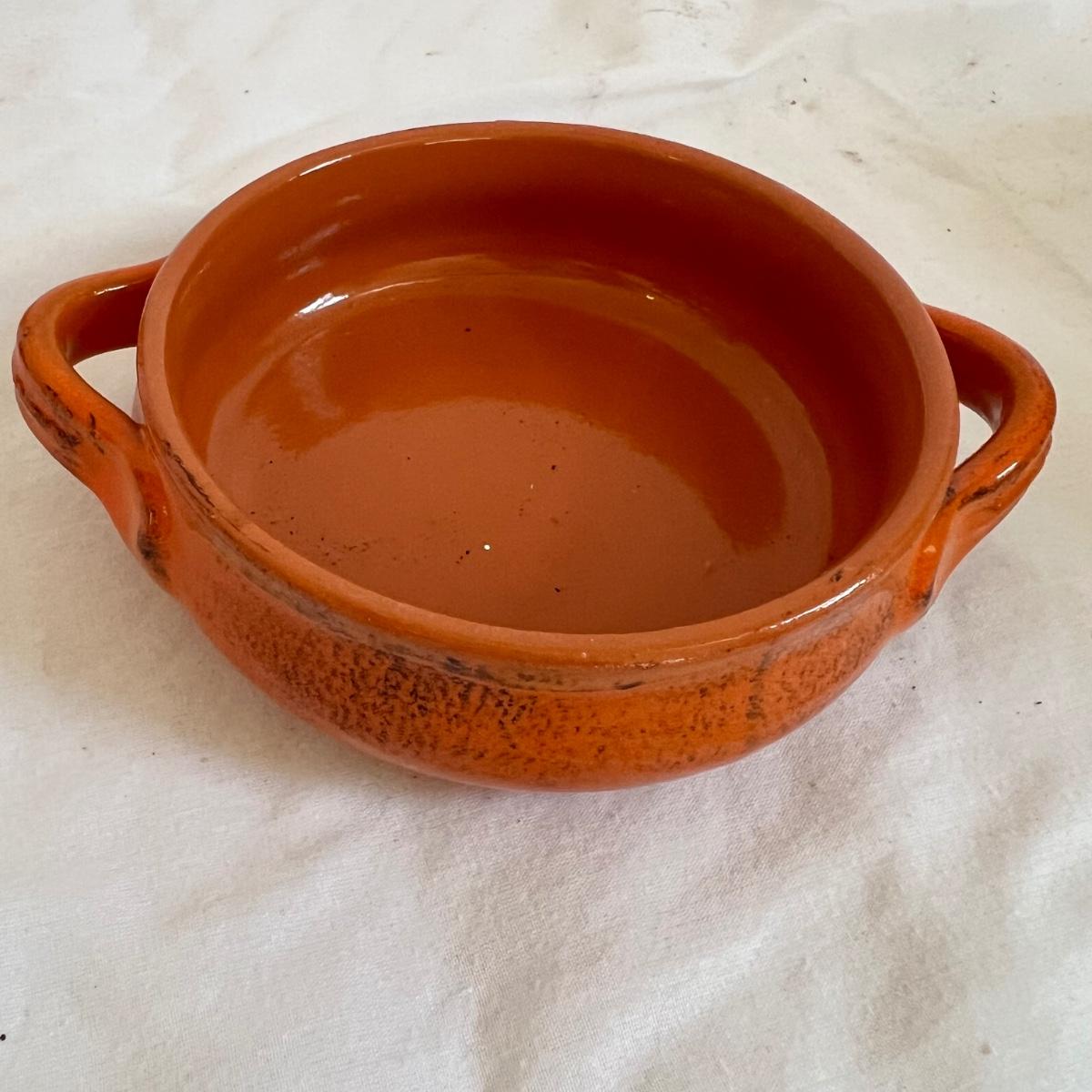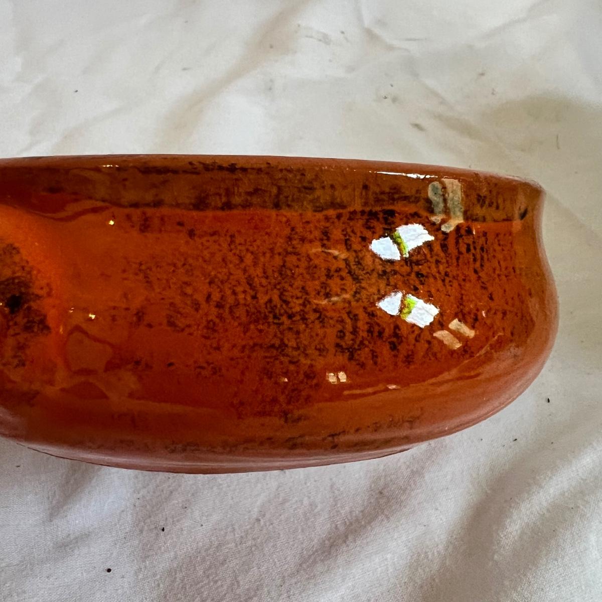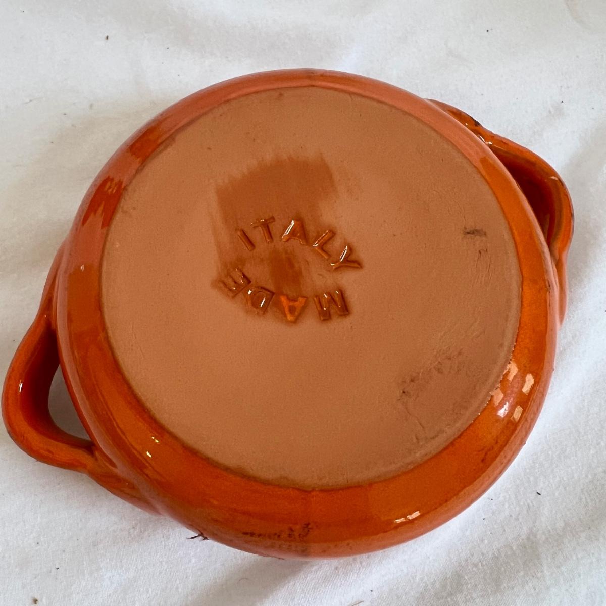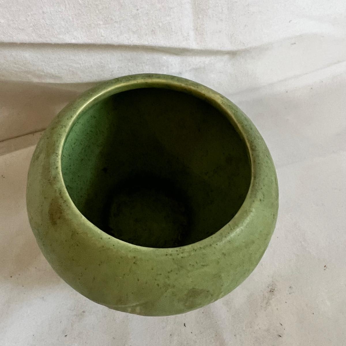 Five lovely pieces of glazed pottery includes pottery pieces from much loved local pottery makers Pisgah Forest and North state; each very unique. The pale blue and green Pisgah Pottery vase measures approximately 4”D x 7”D and the pale green vase measures approximately 6”D x 5”H. The rough glazed orange bowl with two handles measures 5.25”D x 2”H and is ideal for nuts or candy. The small red handmade by North State Pottery vase with four flower bud holes measures approximately 3.5”D x 3.75”H and the tall teal blue and almond colored glazed jar also handmade by North State Pottery measures approximately 3”D x 7.25”H.