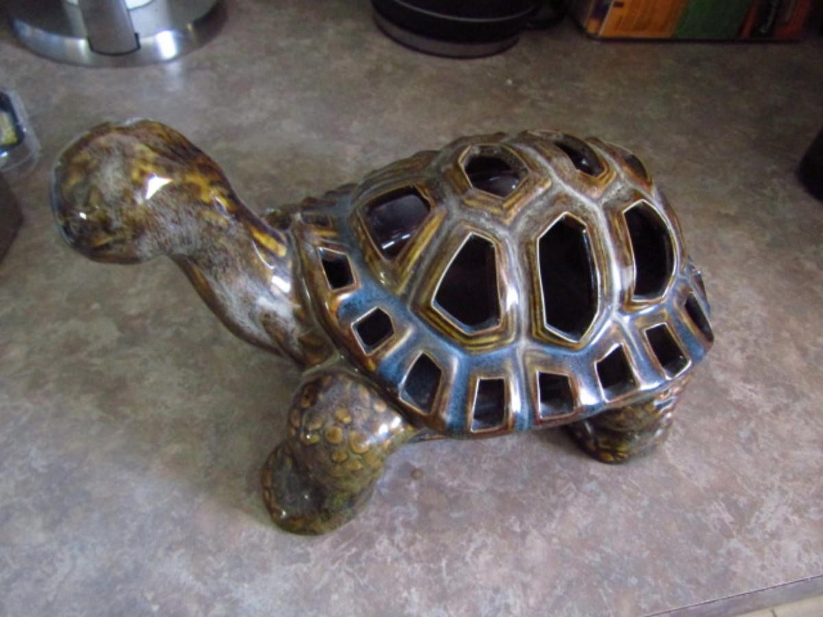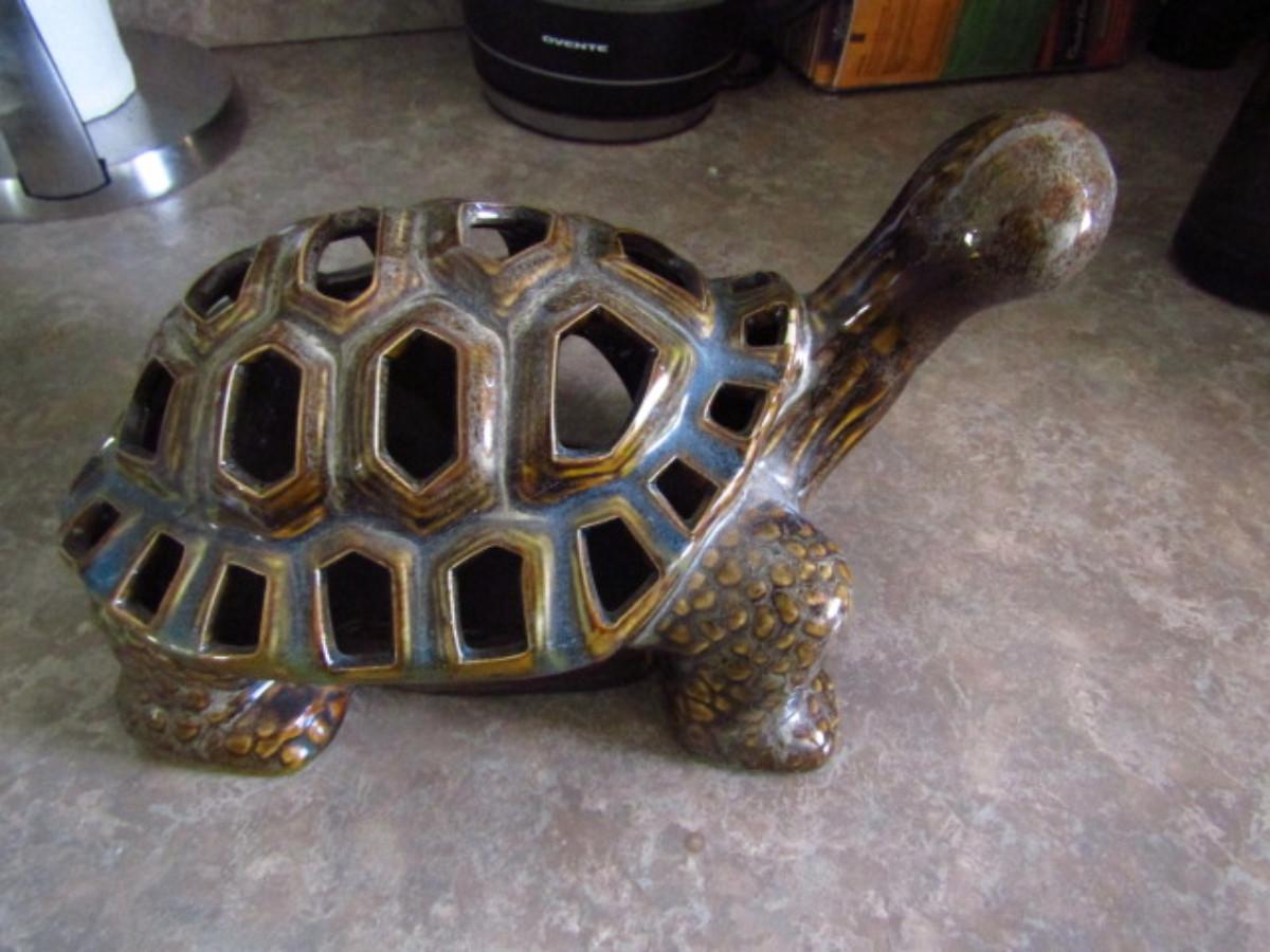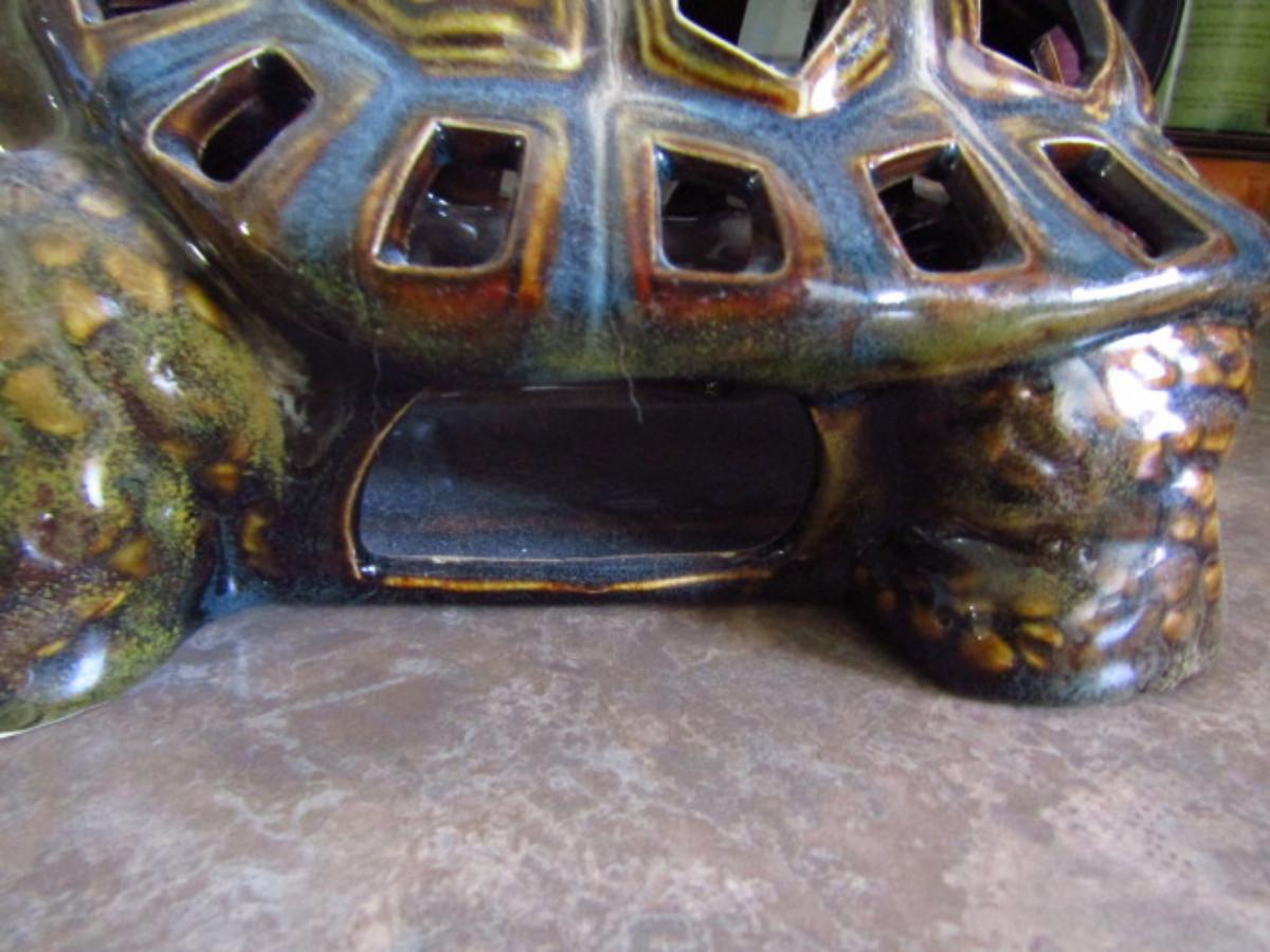 Glazed Pottery Turtle Candle Lantern (Apt). Approx 10" long x 5 3/4" tall.
