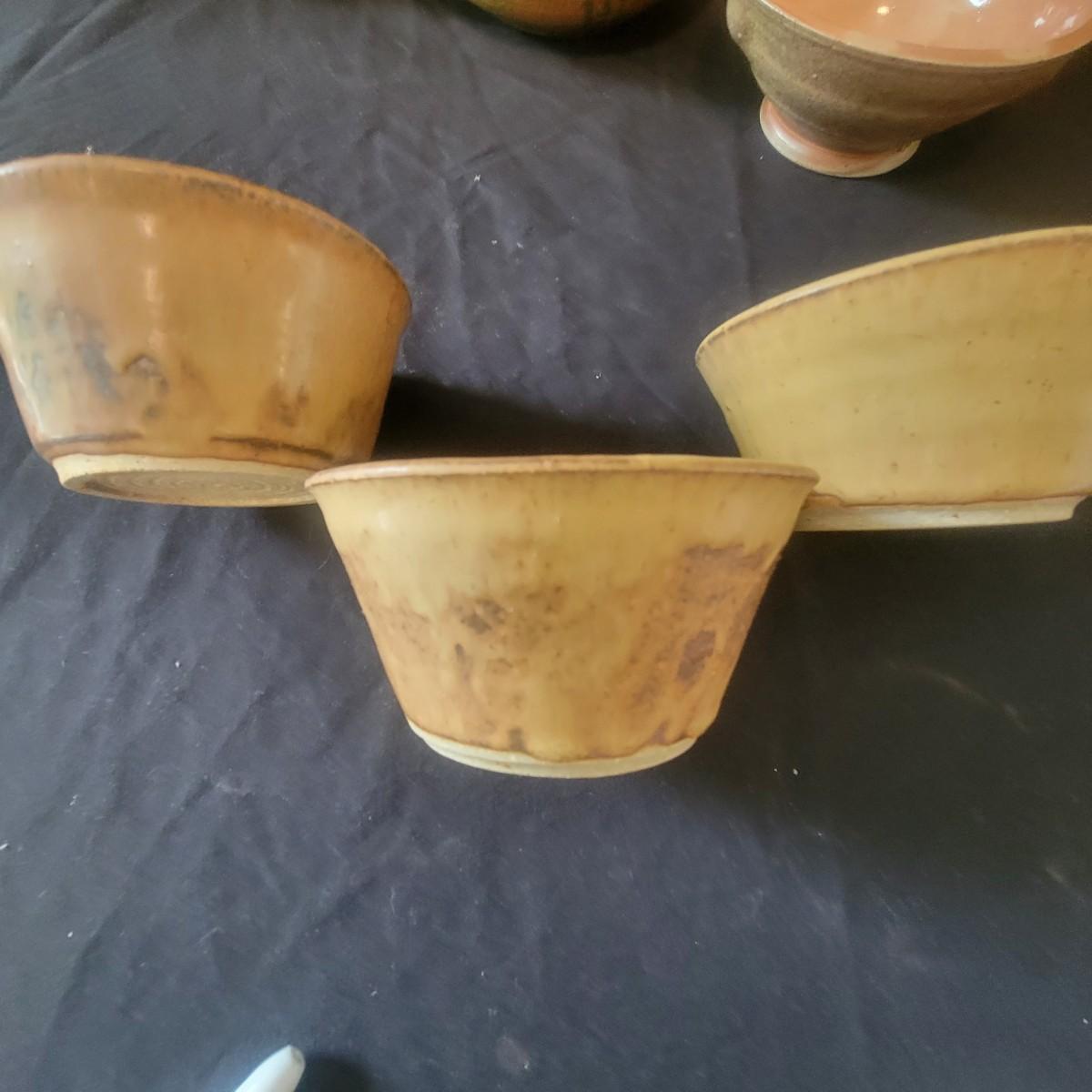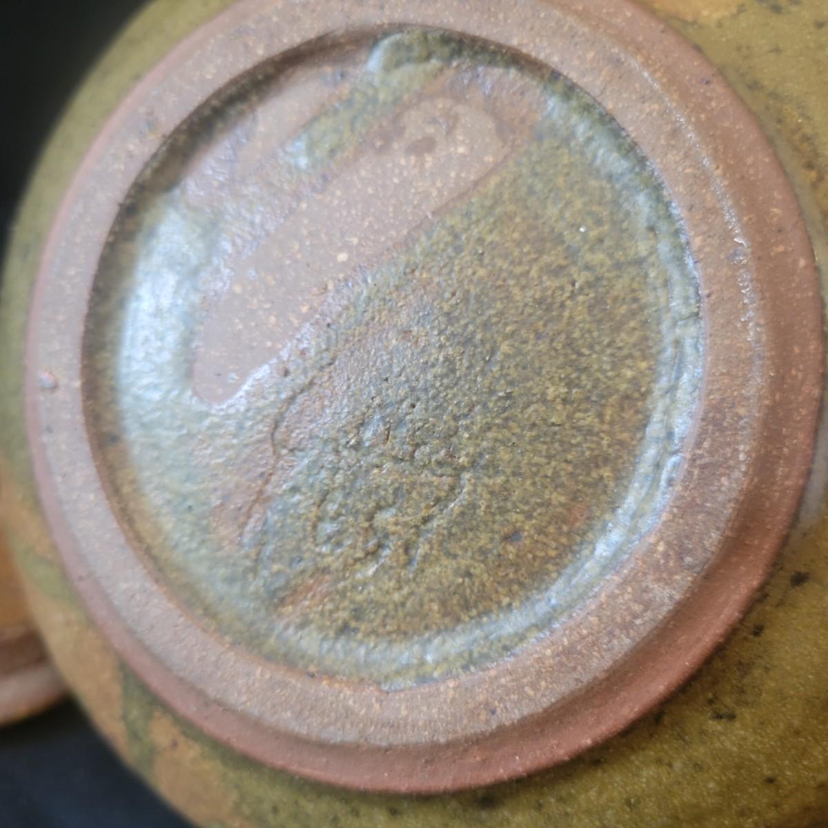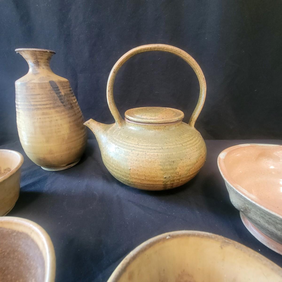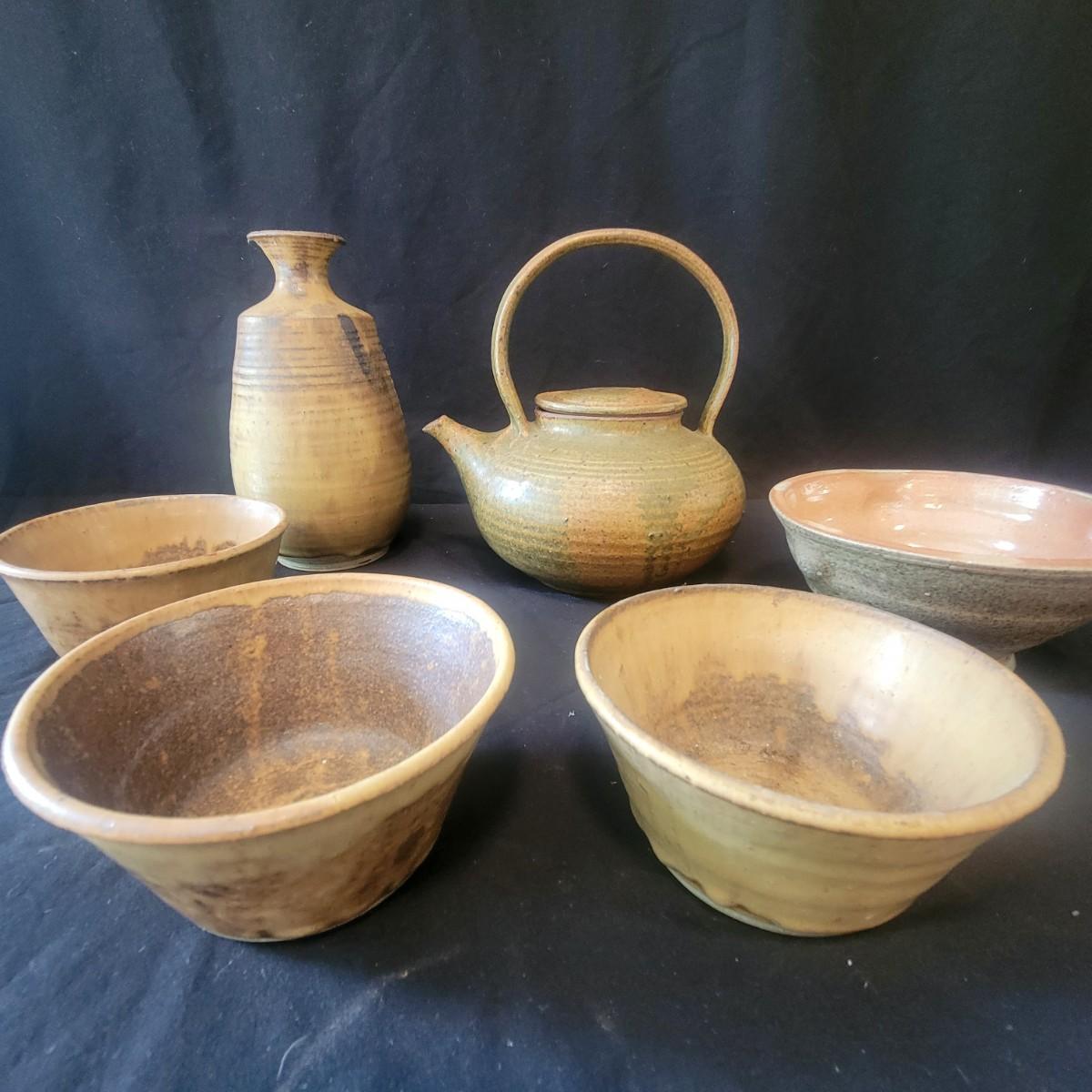 A collection of pottery pieces with a similar glaze, 6 pieces all together. All are in excellent condition with no known damage. The 3 bowls and vase appear to be made by the same artist. The larger bowl has a smooth glaze on its interior and matches the other pieces. Teapot also fits in with other pieces and measures approximately 8" x 8" and is signed. Shipping available