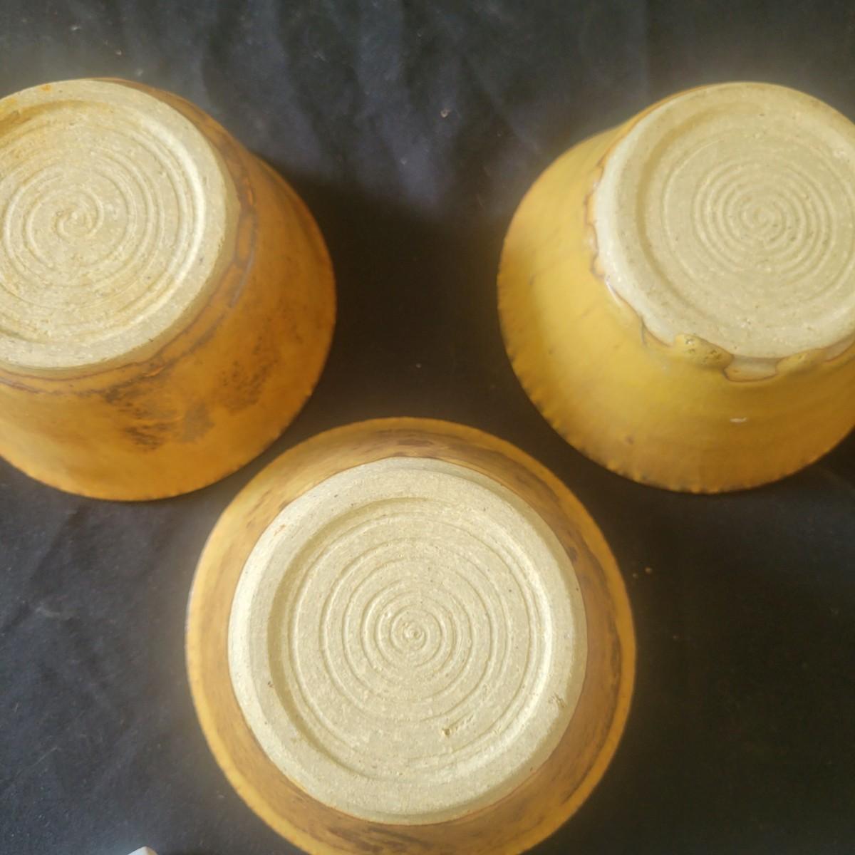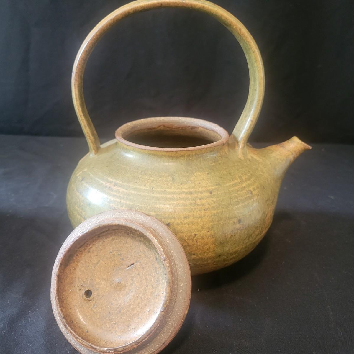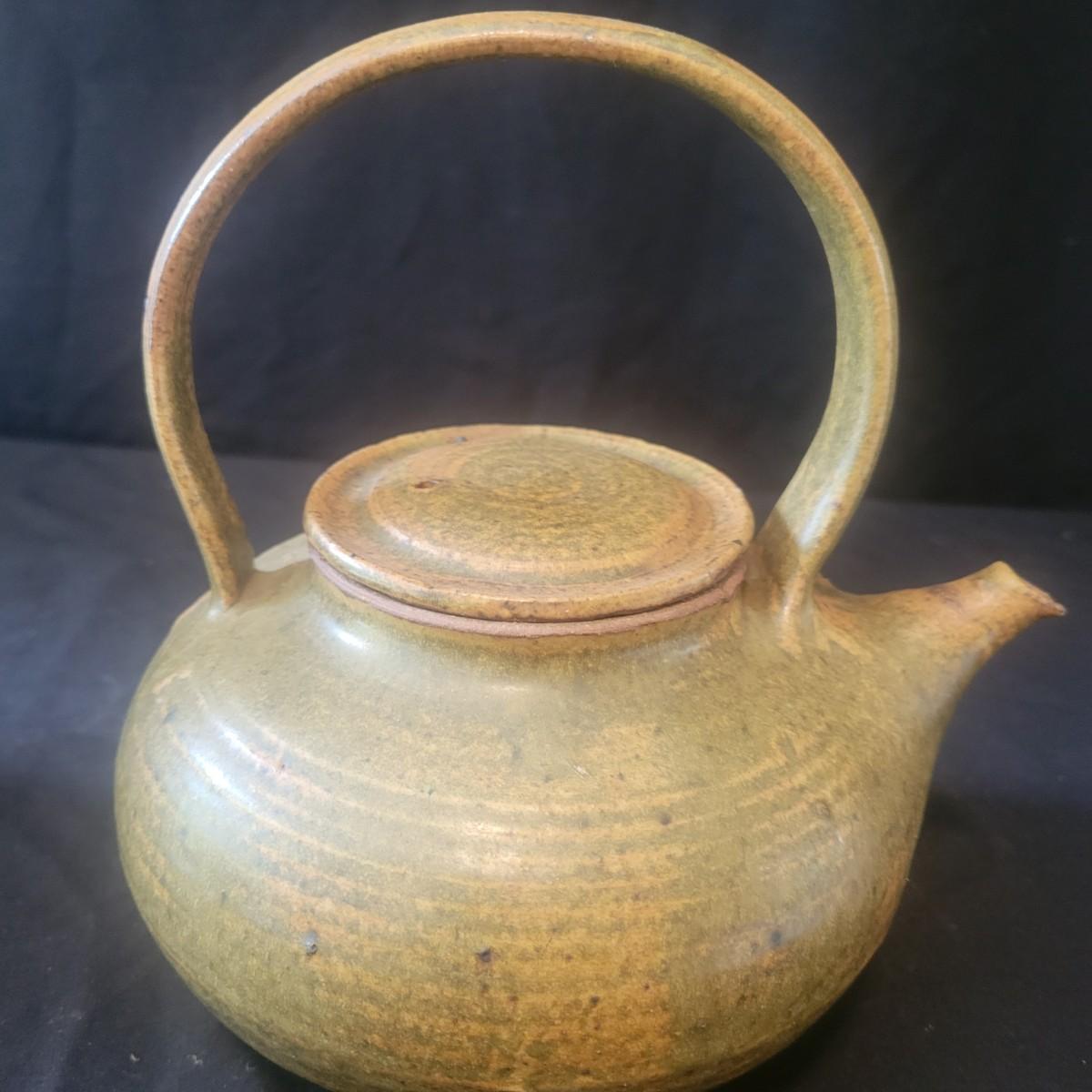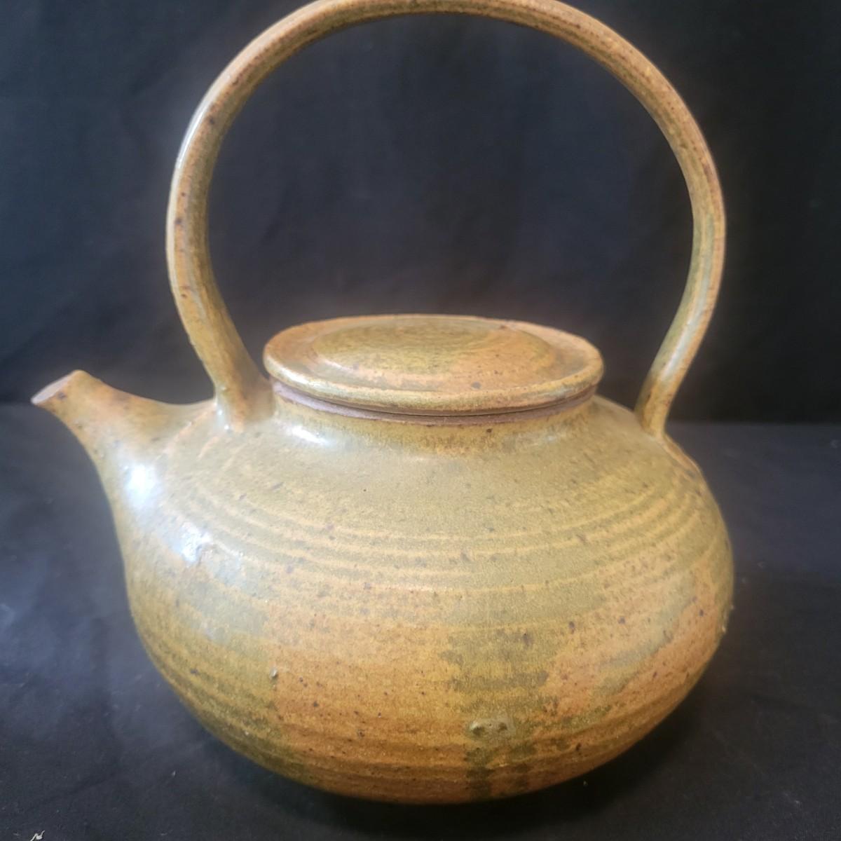 A collection of pottery pieces with a similar glaze, 6 pieces all together. All are in excellent condition with no known damage. The 3 bowls and vase appear to be made by the same artist. The larger bowl has a smooth glaze on its interior and matches the other pieces. Teapot also fits in with other pieces and measures approximately 8" x 8" and is signed. Shipping available