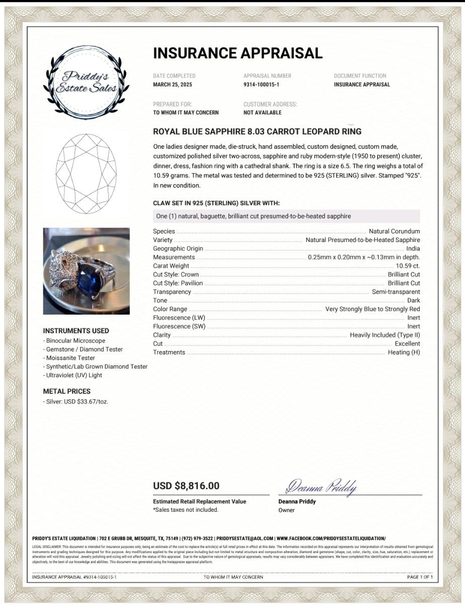 Gleaming Royal Blue Sapphire 8.03Ct 925 Sterling Silver Handmade Leopard Ring