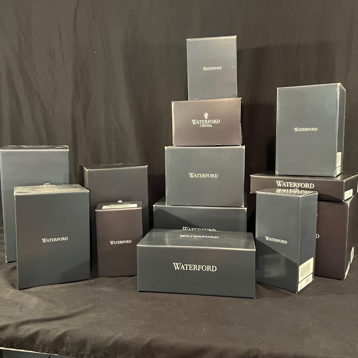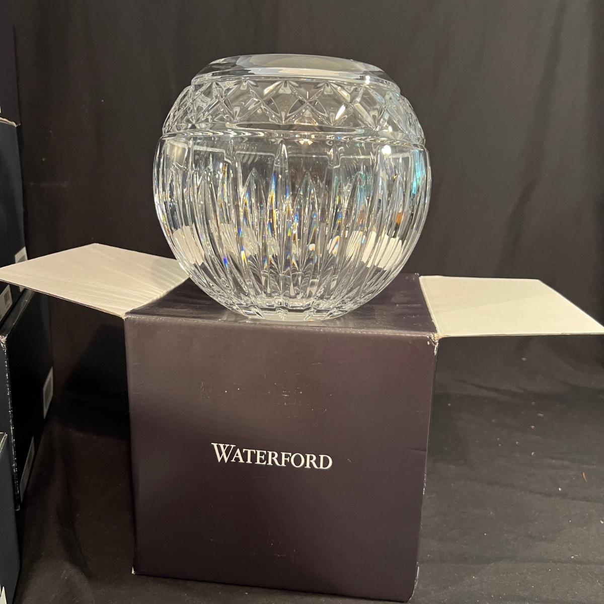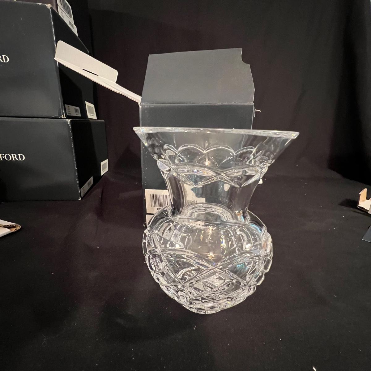 12 plus Waterford Crystal vases and bowls plus a pitcher which measures 5” D (base) x 10”H. All items appear to have been stored in their boxes and are likely new. See images for full inventory and measurements.