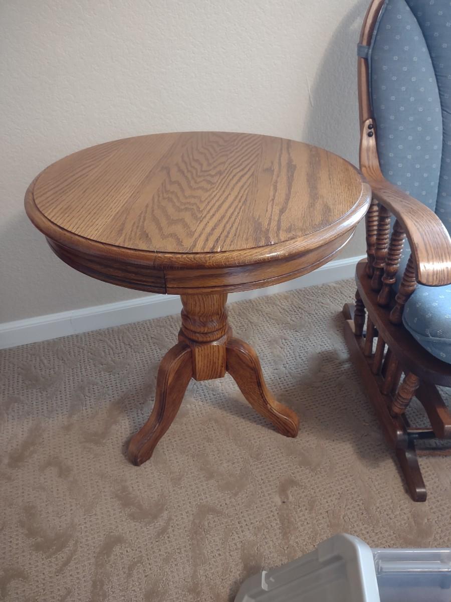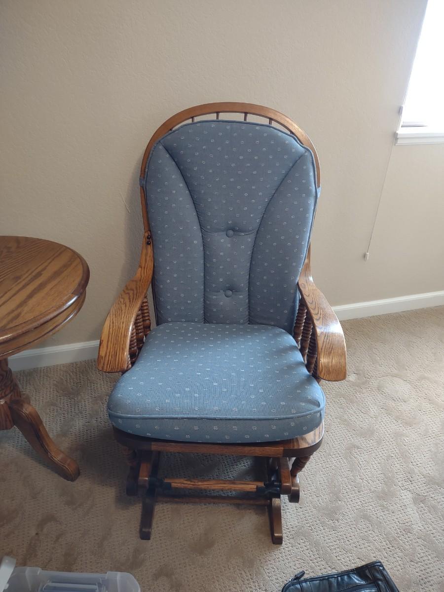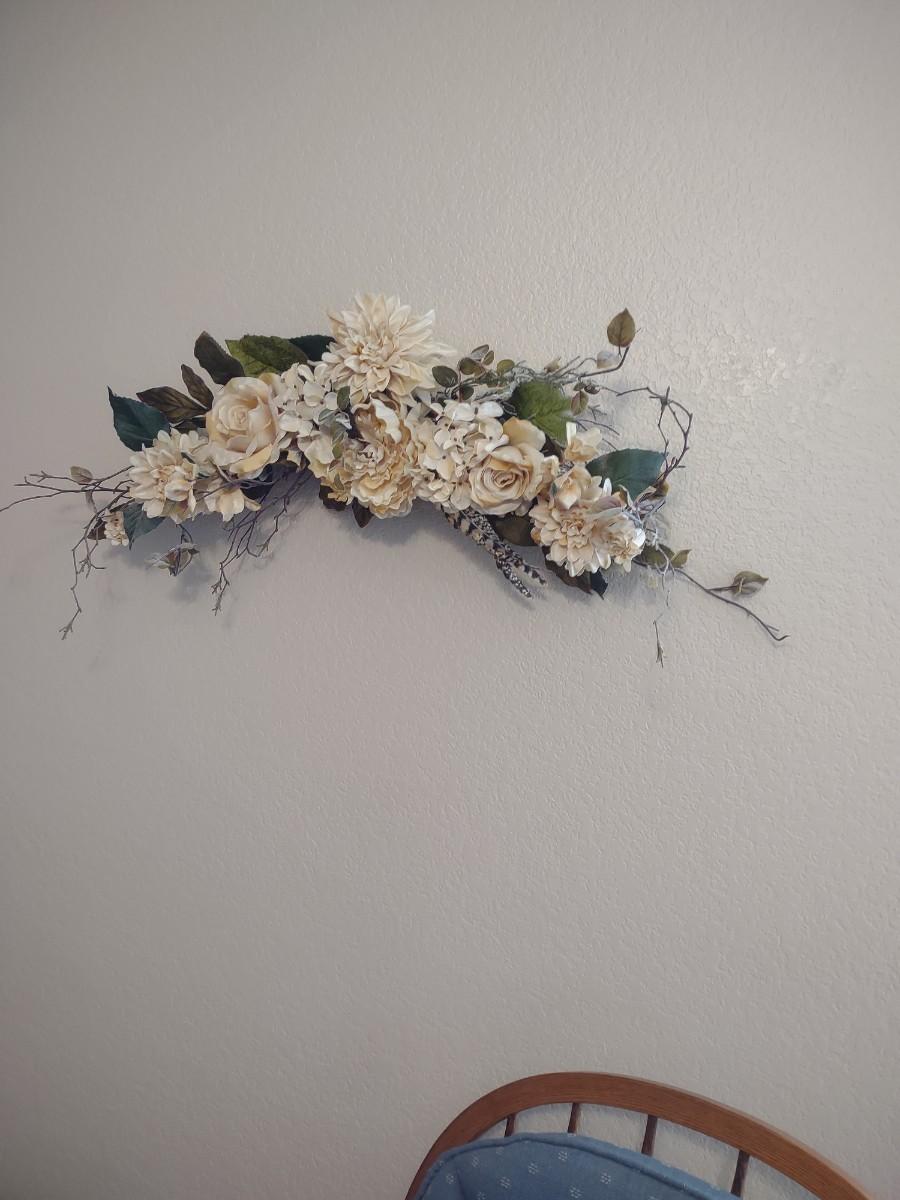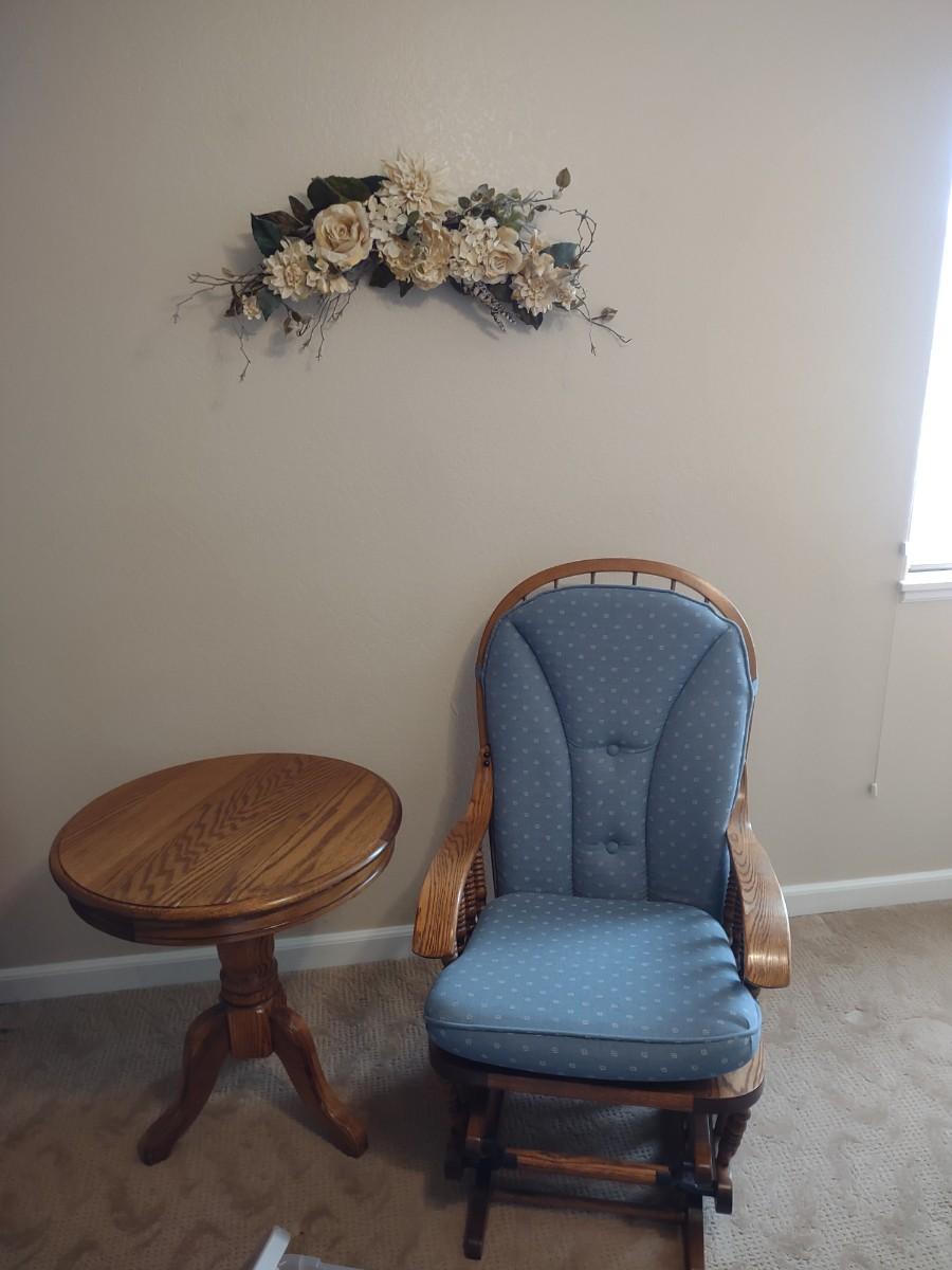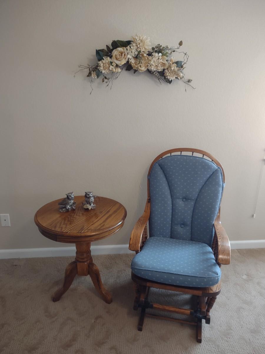 GLIDER, FAUX FLORAL SWAG AND A SIDE TABLE